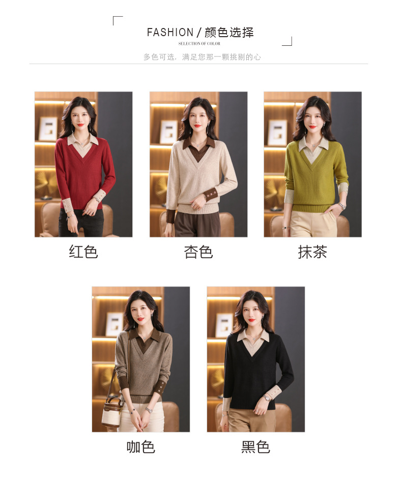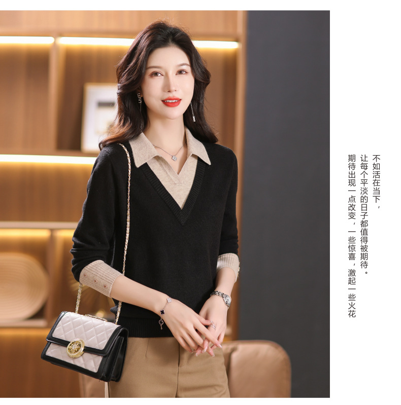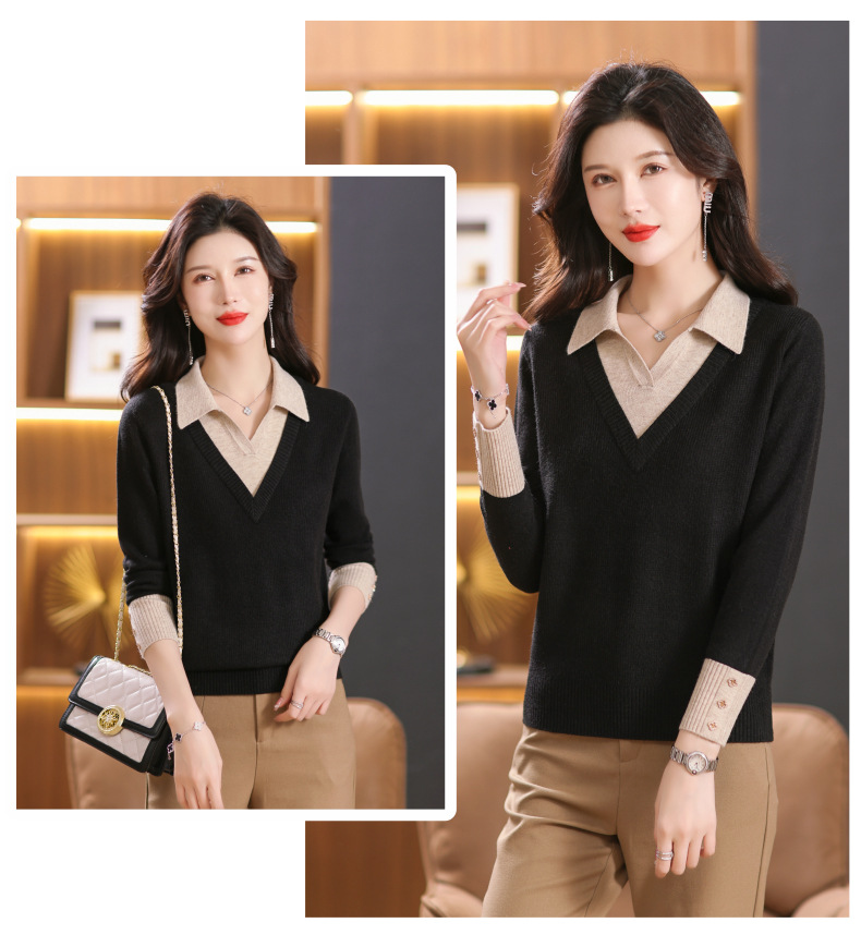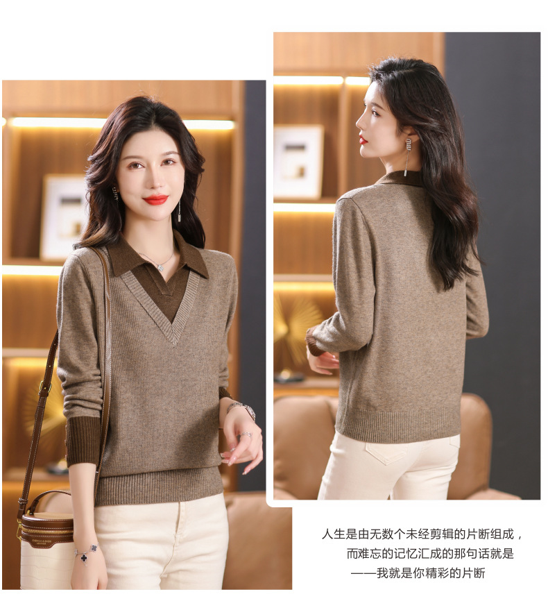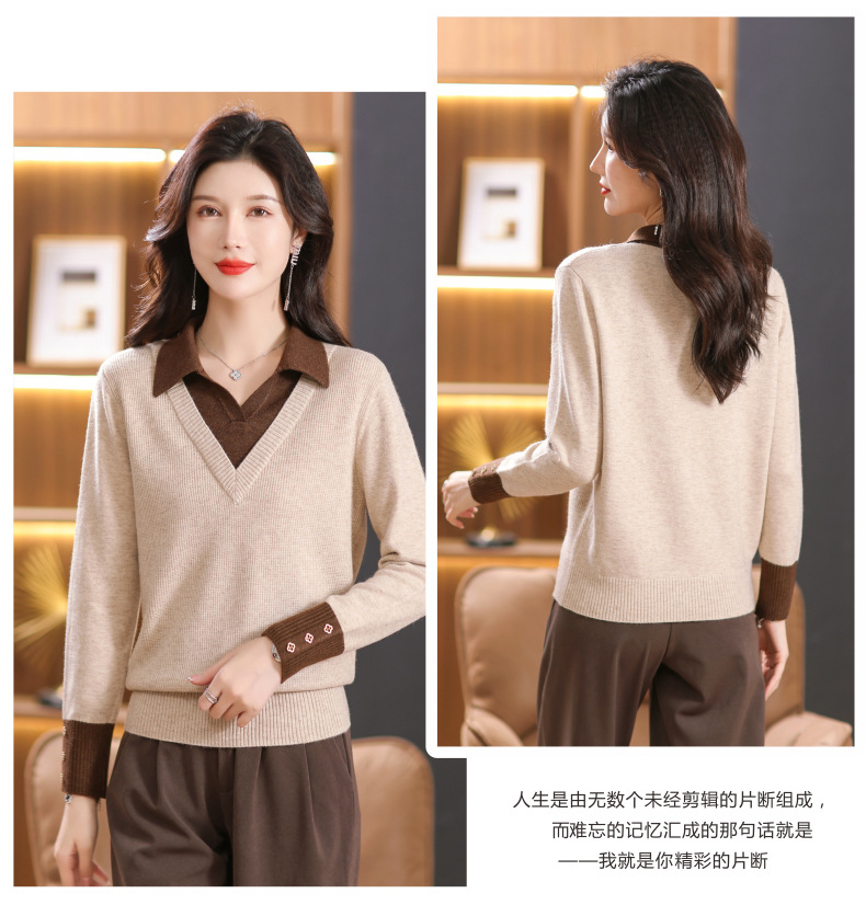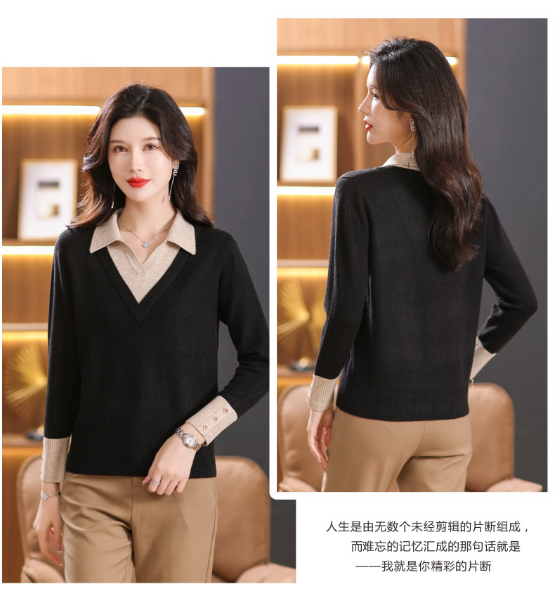 【双11】2024新款宽松时尚显瘦POLO领拼色螺纹套头针织衫假两件CC-101-68977