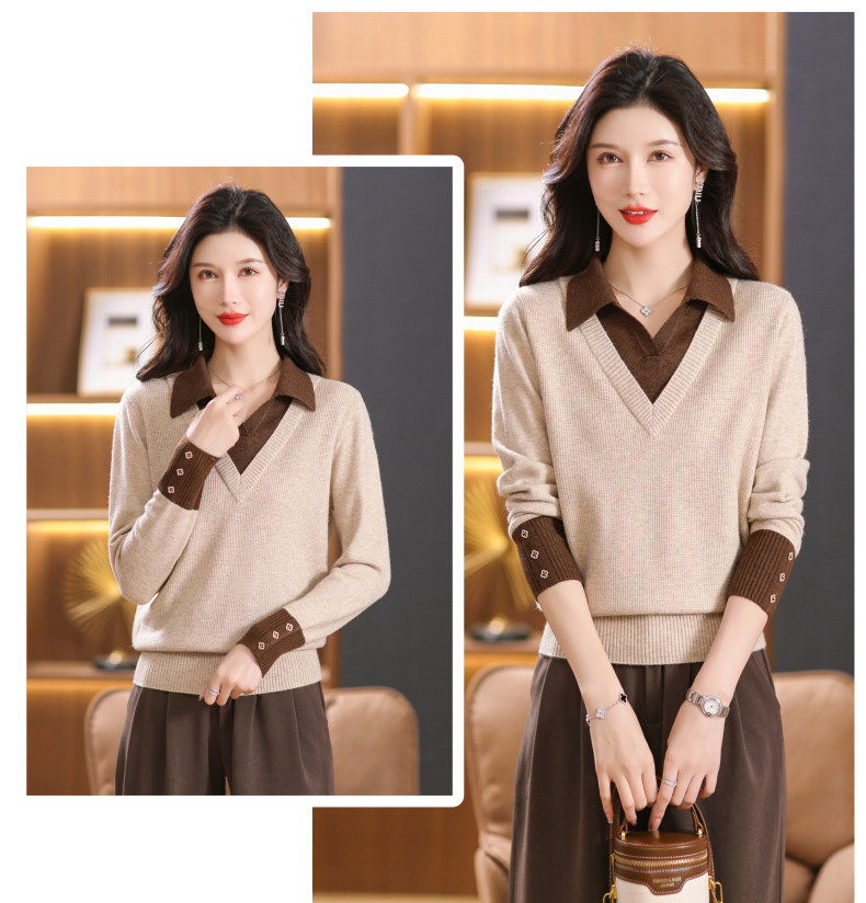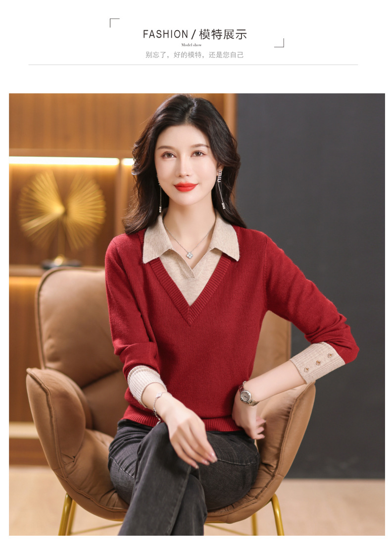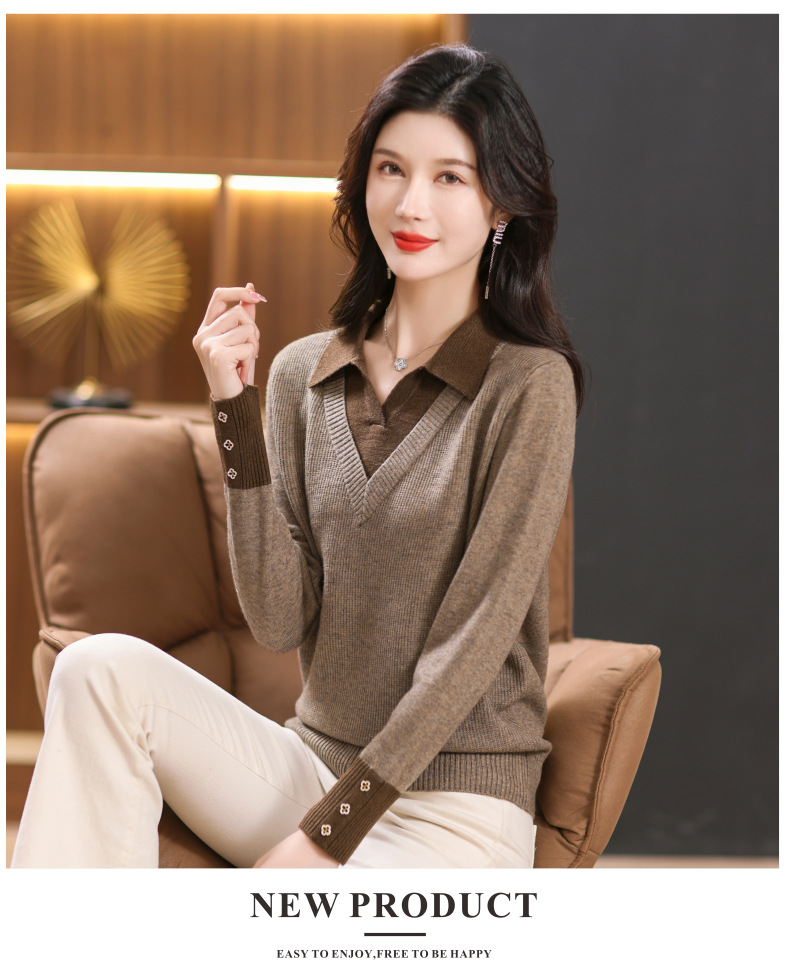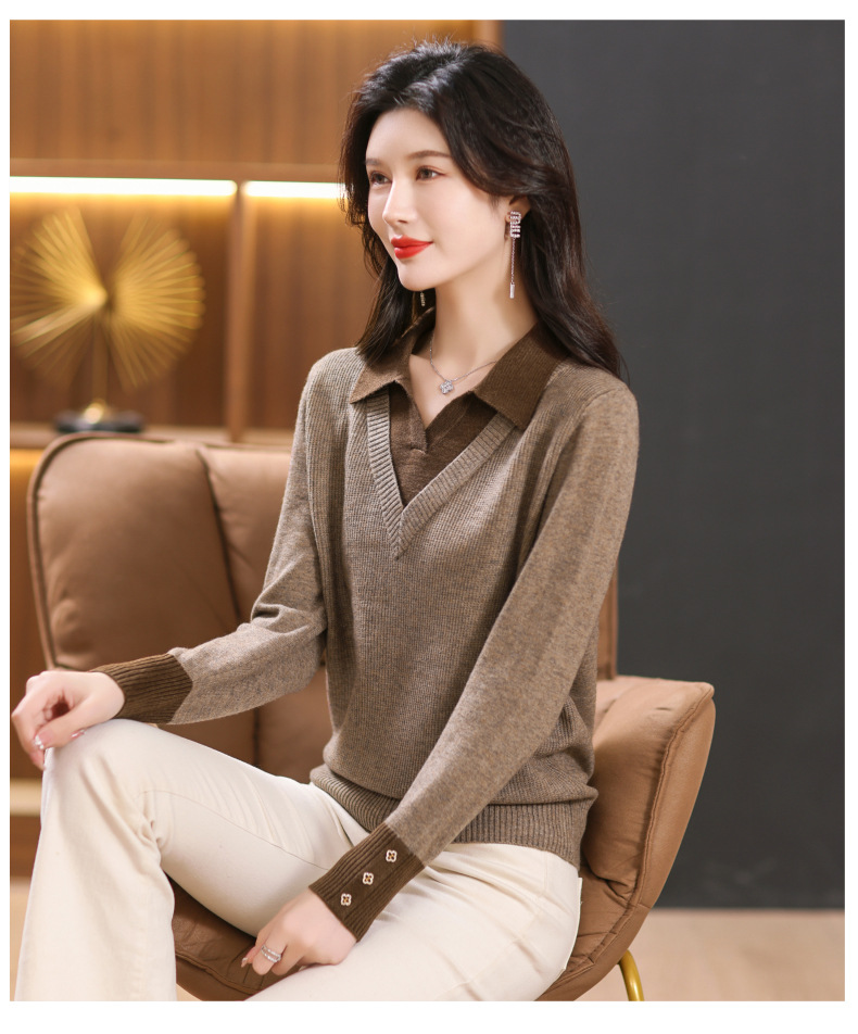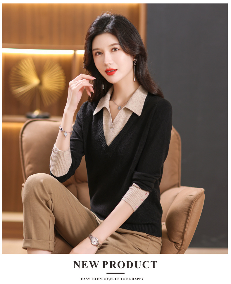 【双11】2024新款宽松时尚显瘦POLO领拼色螺纹套头针织衫假两件CC-101-68977