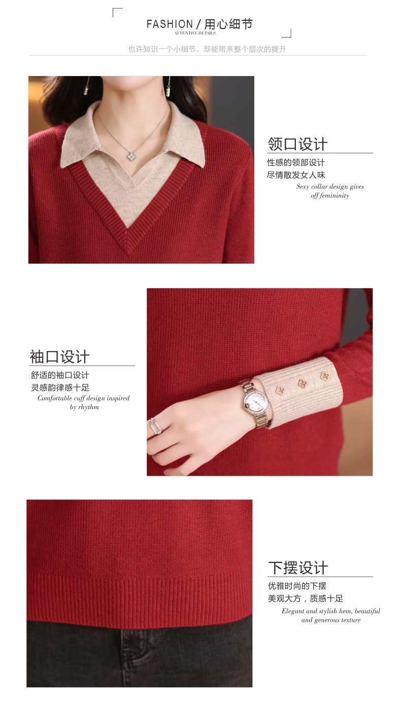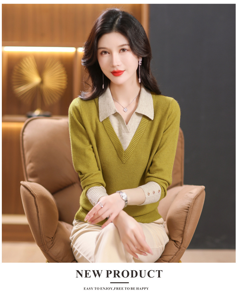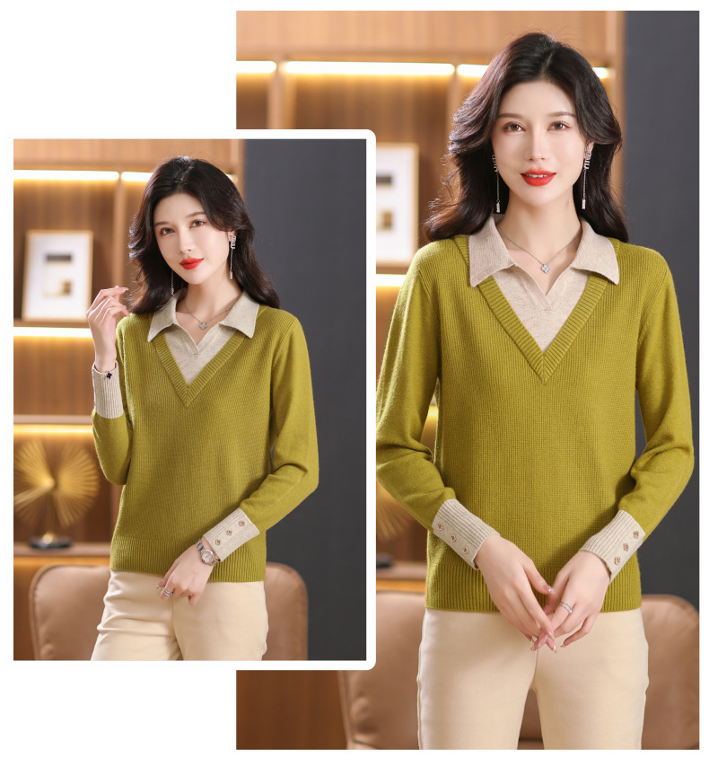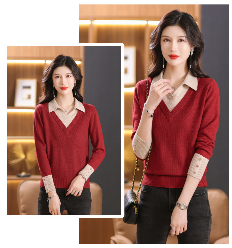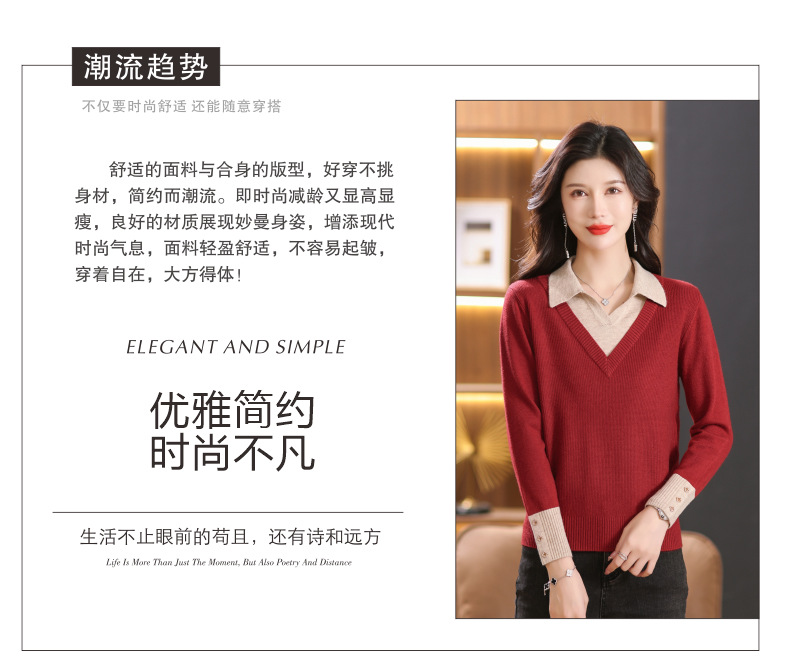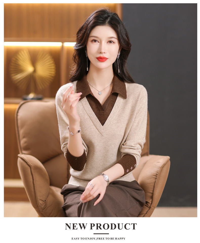【双11】2024新款宽松时尚显瘦POLO领拼色螺纹套头针织衫假两件CC-101-68977