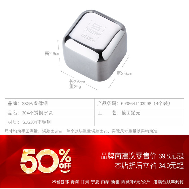【会员有料】叁肆钢不锈钢冰块(6个装)D335 速冻钢冰方块