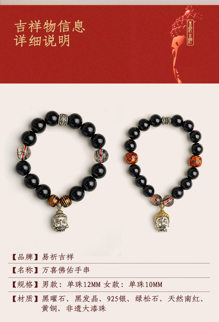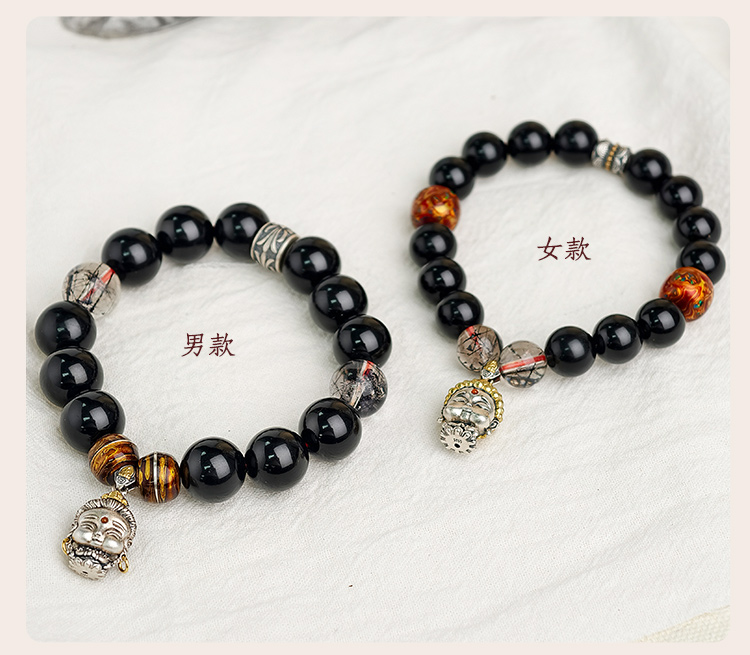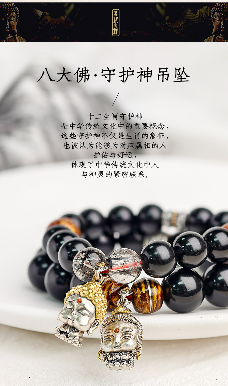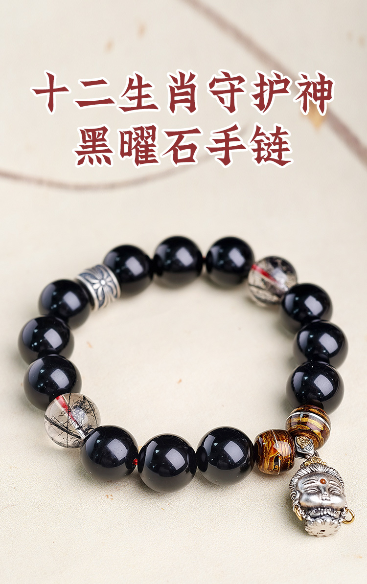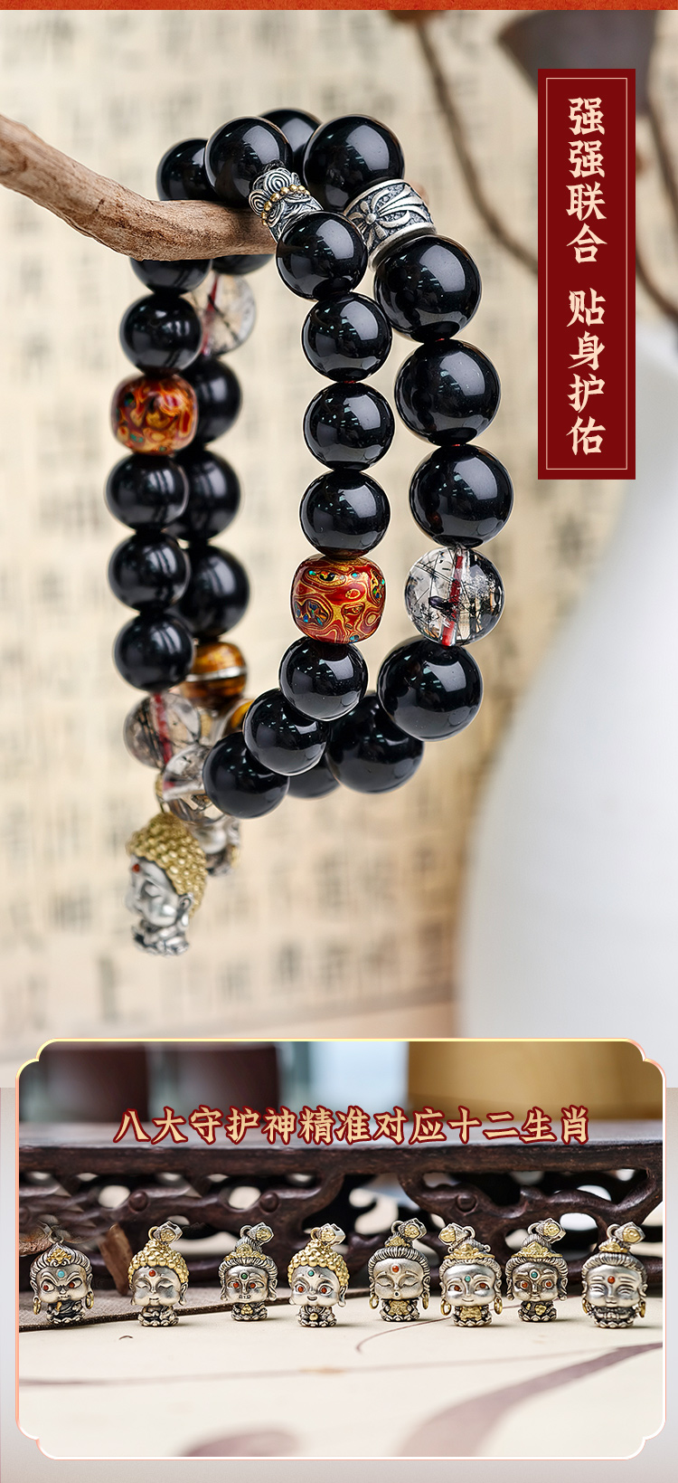 易祈吉祥黑曜石十二生肖守护神手串工艺八大守护神S925银男女款黑发晶手链