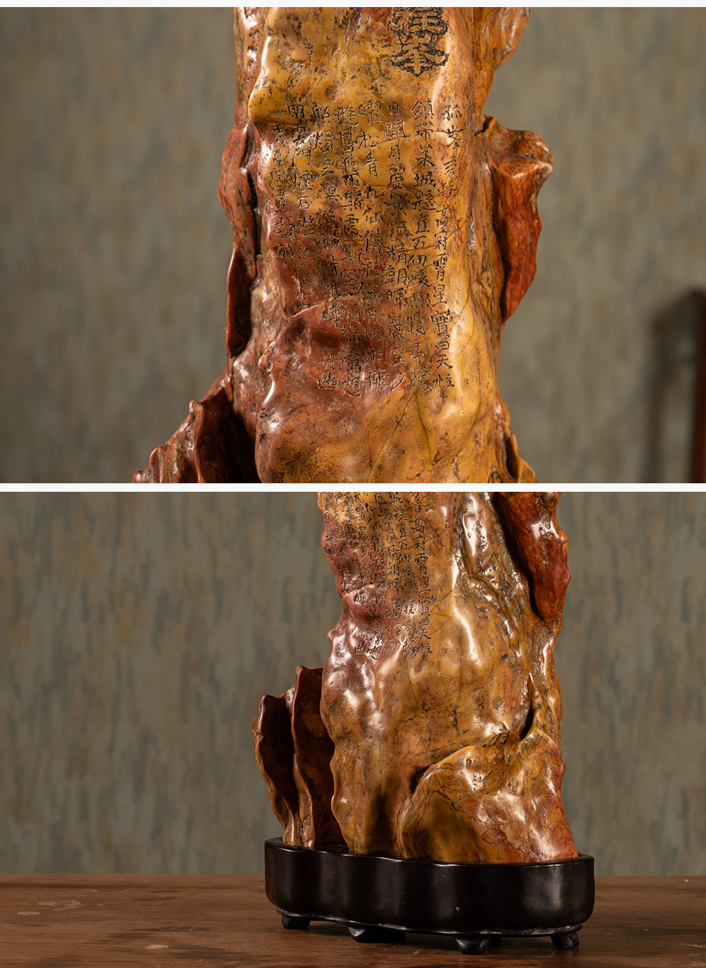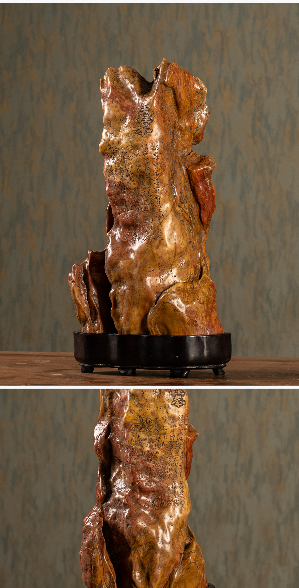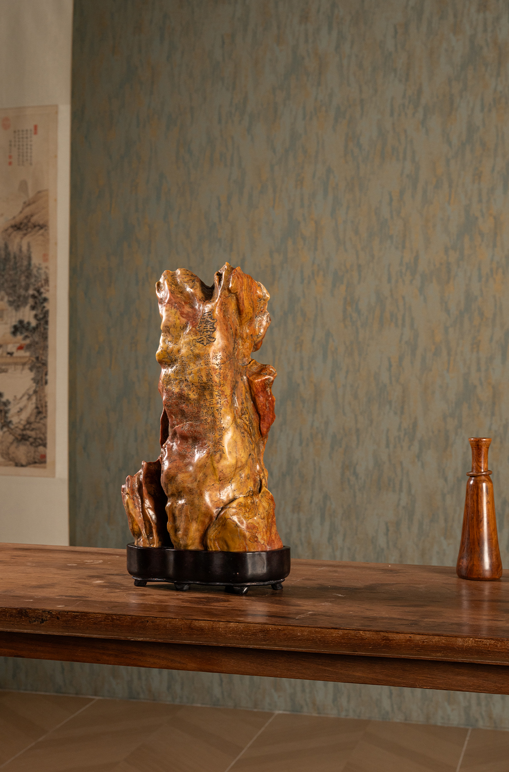 清 魏戫款彩灵璧石天柱峰山子 赏石(红木座)