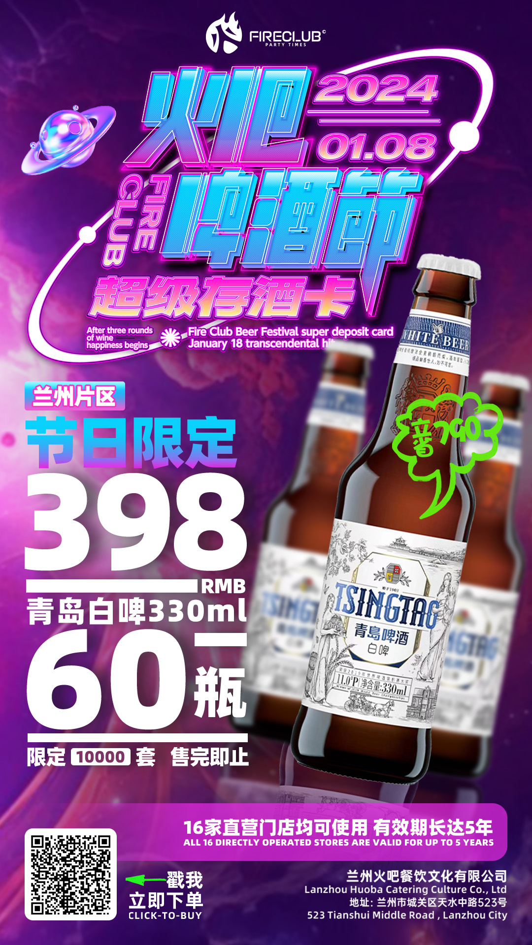 【兰州通用】1月8日火吧啤酒节—超值存酒卡—398元60瓶青岛白啤330ml