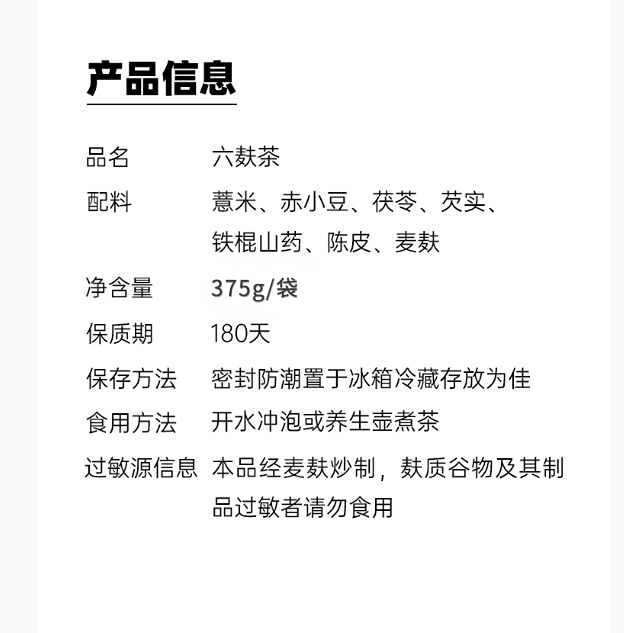 三蒸三晒六麸茶 薏仁红豆芡实茯苓山药 375克/袋