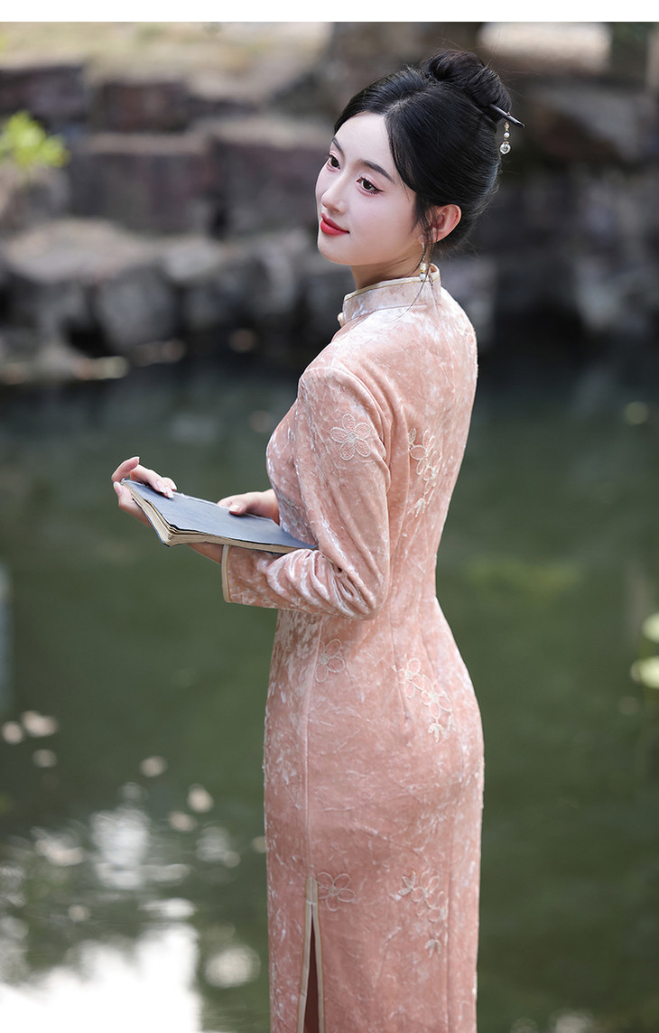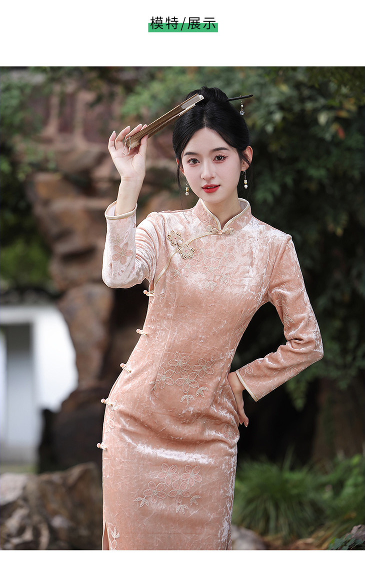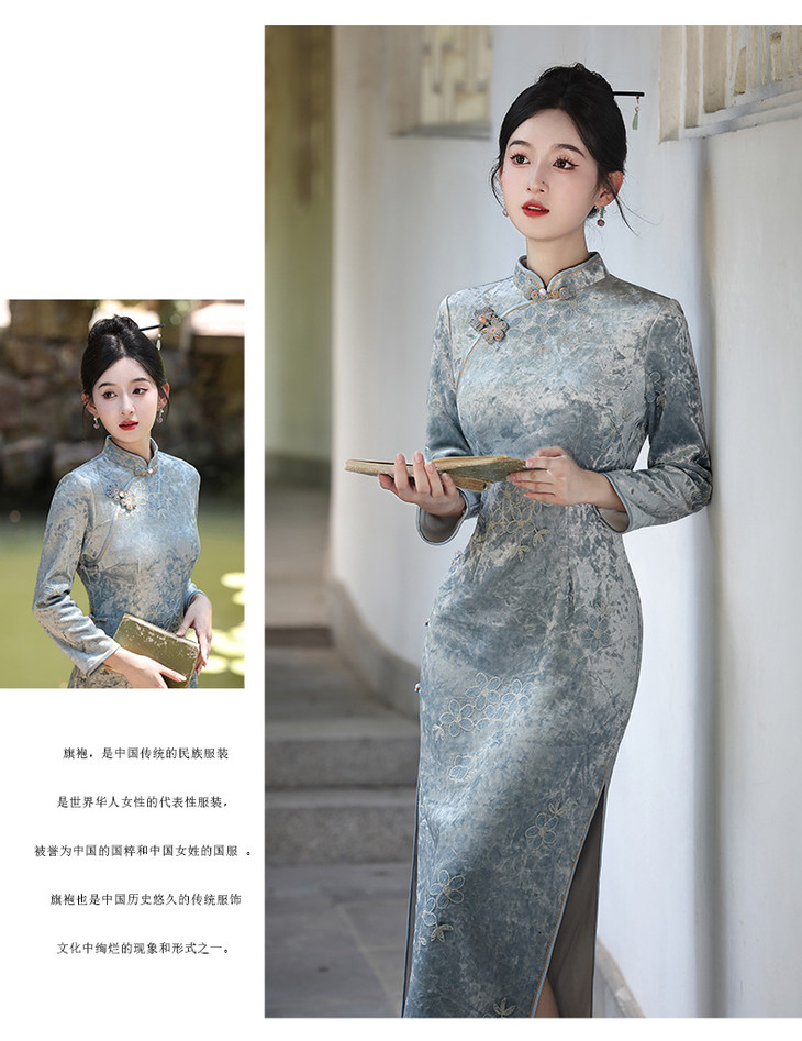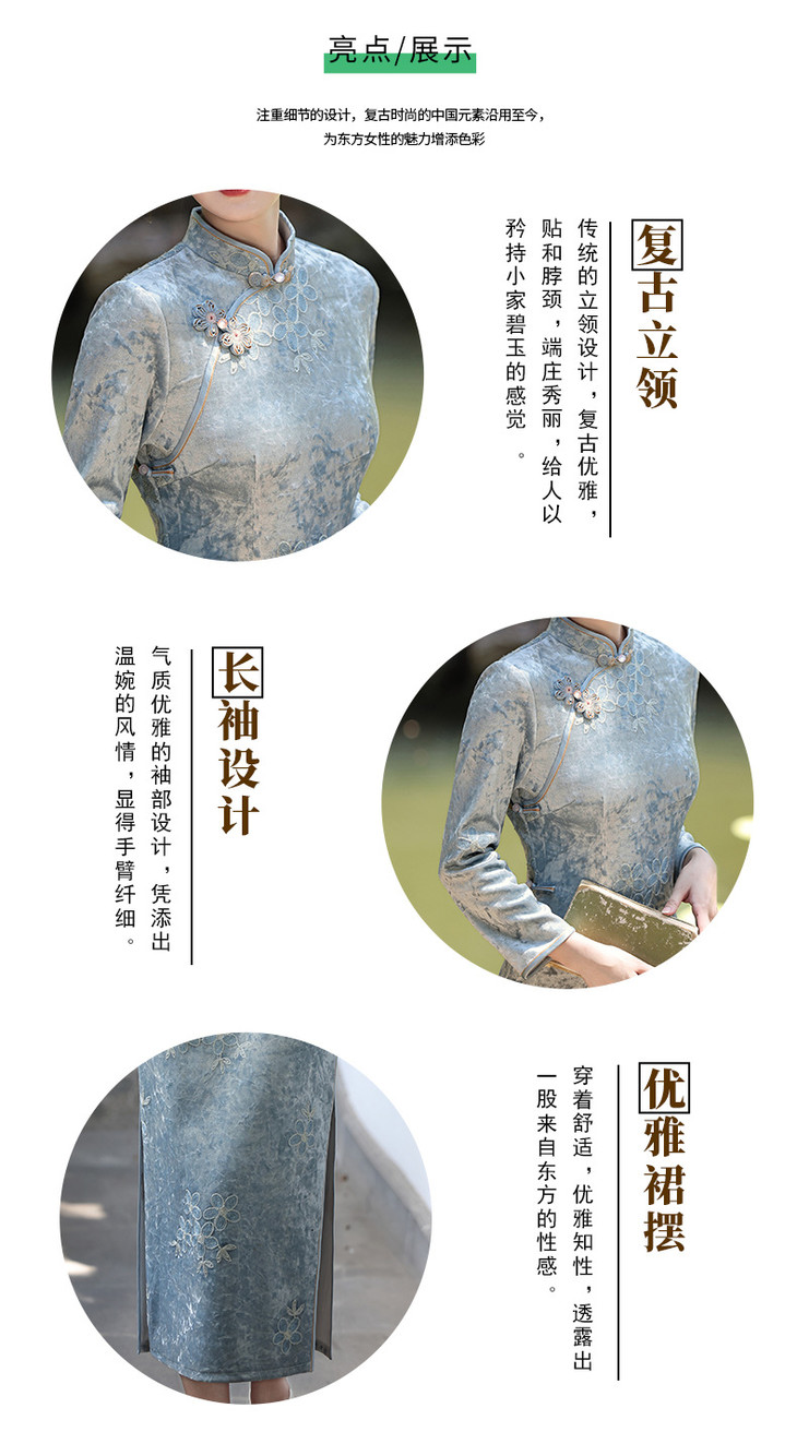 2025秋冬季新款手工盘扣年轻款牛奶丝提花显瘦长款立领新中式旗袍MLS7219