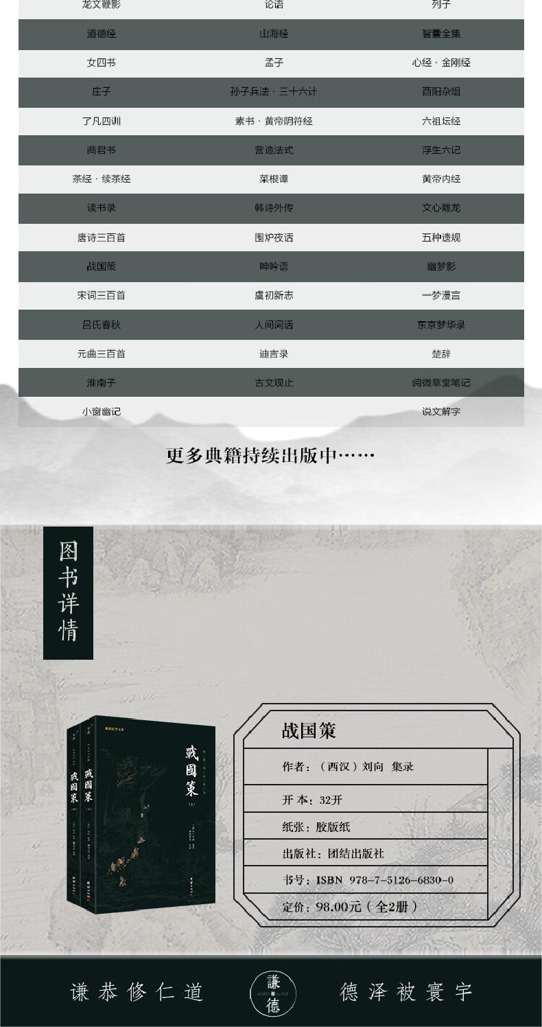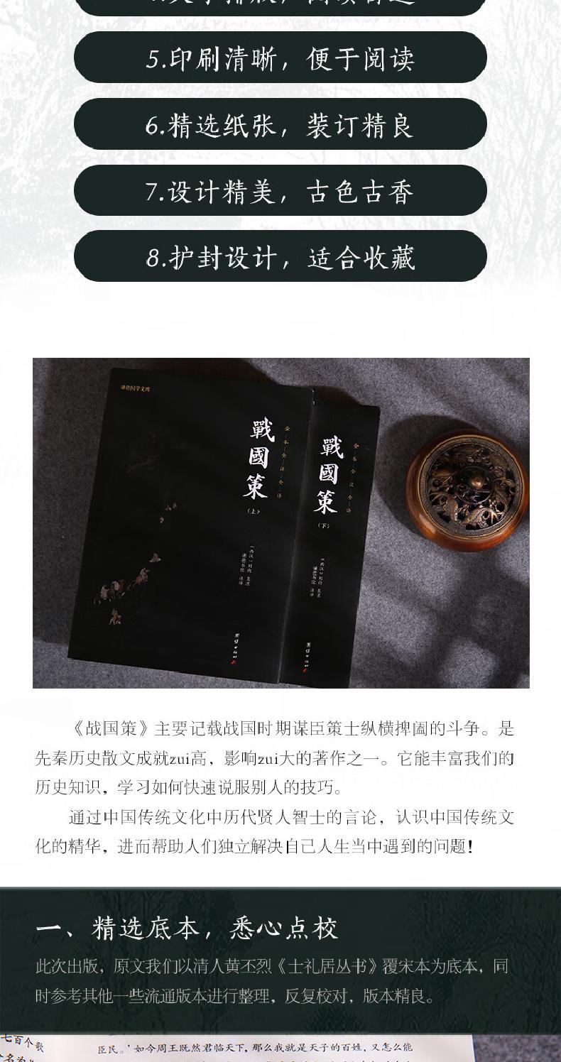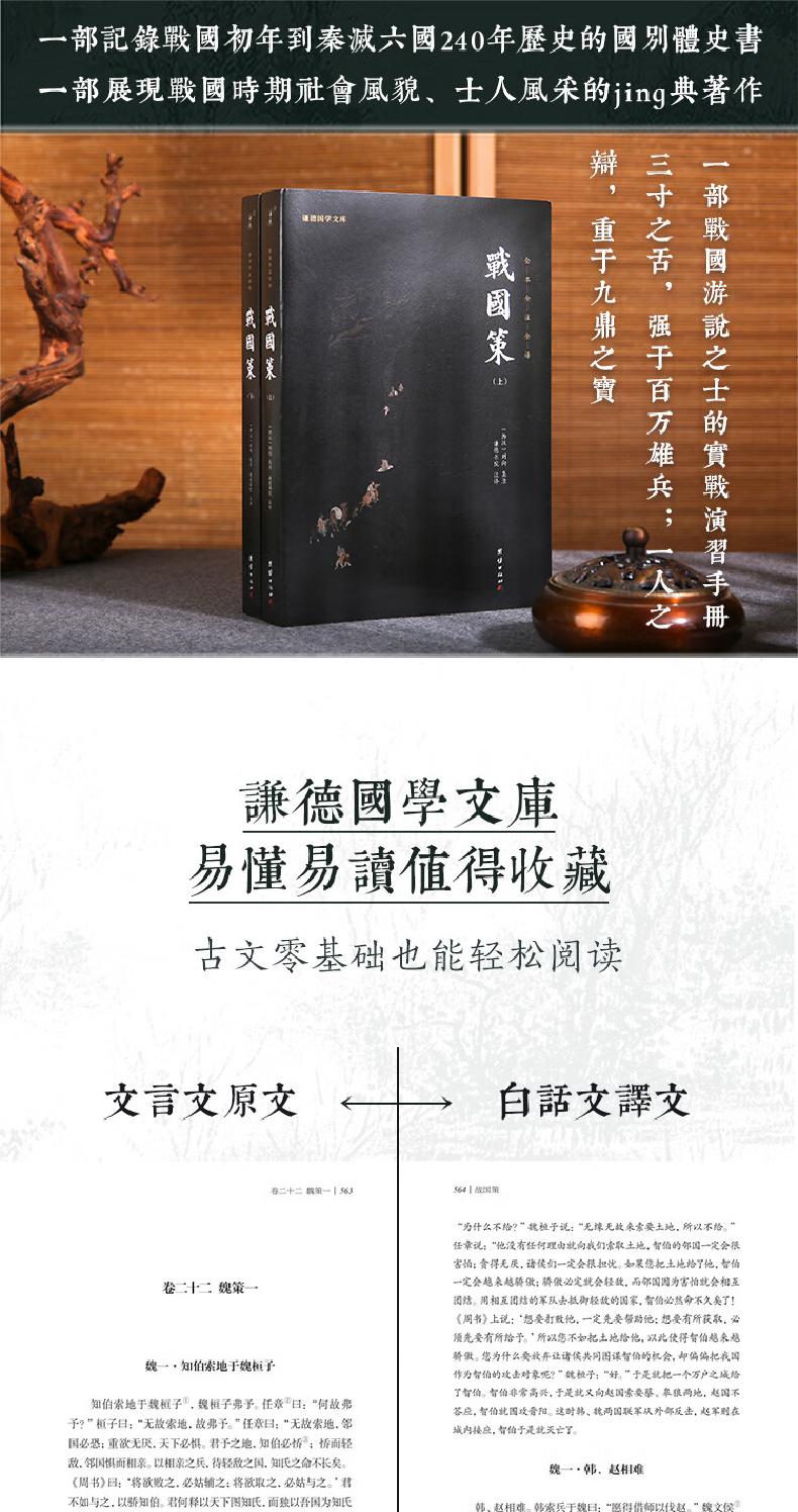《战国策》是一部国别体史学著作,又称《国策》。书中记载了西周、东周及秦、齐、楚、赵、魏、韩、燕、宋、卫、中山各国之事。记事年代起于战国初年,止于秦灭六国,约有240年的历史。《战国策》分为12策,33卷,共497篇,主要记述了战国时期的游说之士的政治主张和言行策略,也可说是游说之士的实战演习手册。