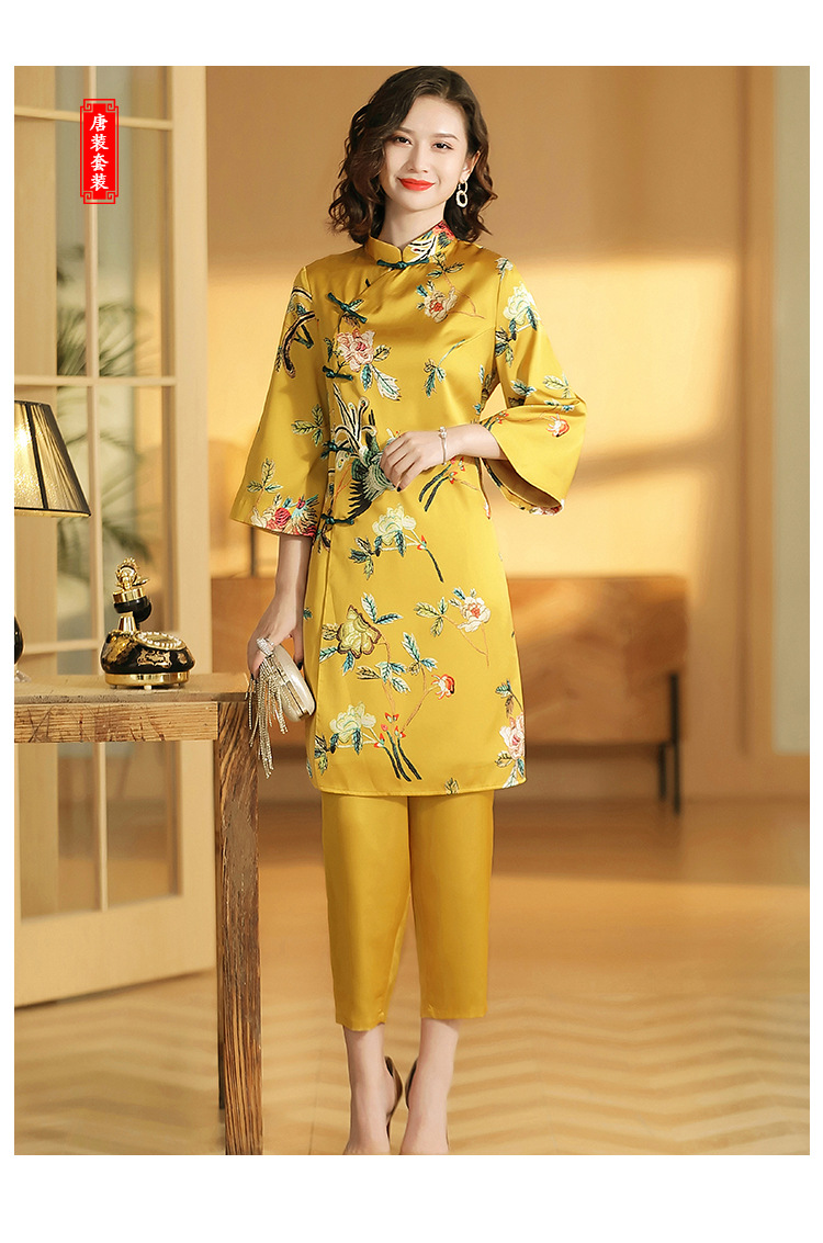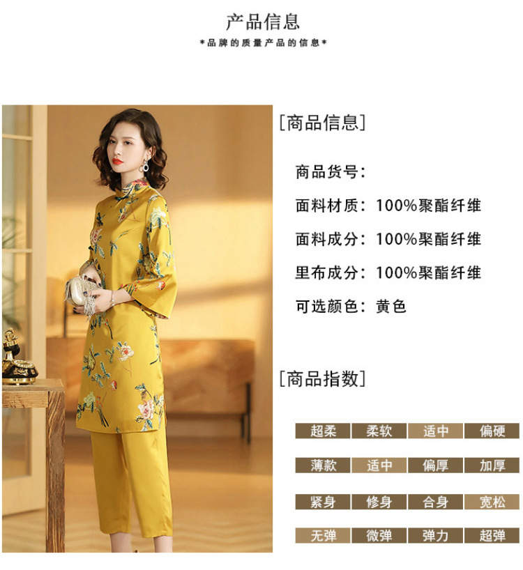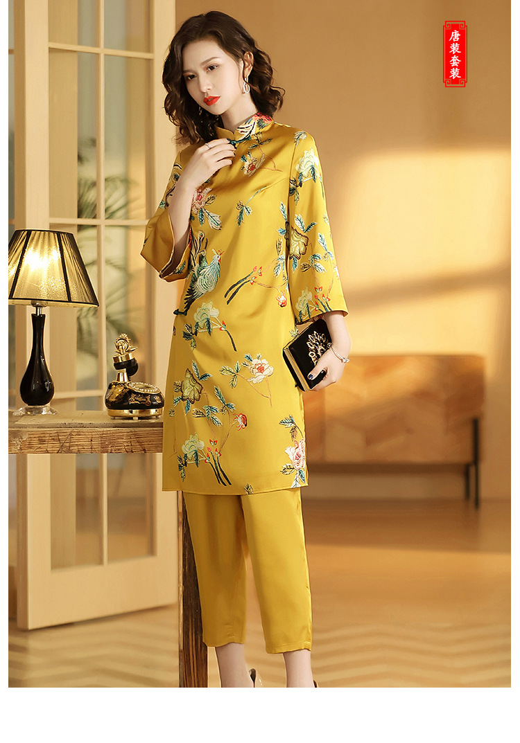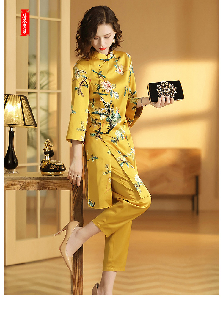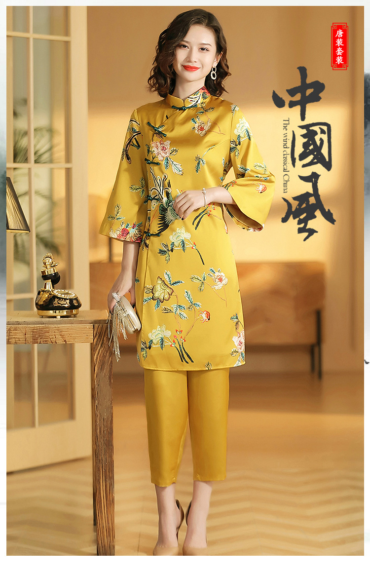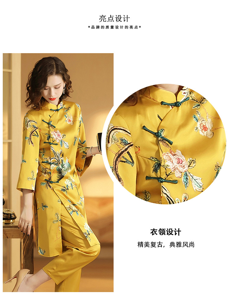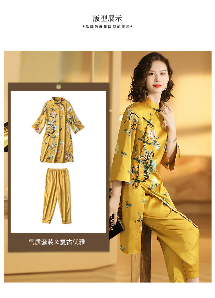 上海旗袍厂AYK-QF-190720印花旗袍唐装女长款+女裤秋季复古民国风修身旗袍唐装套装女