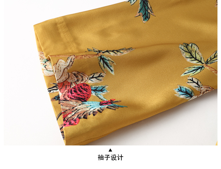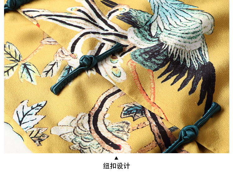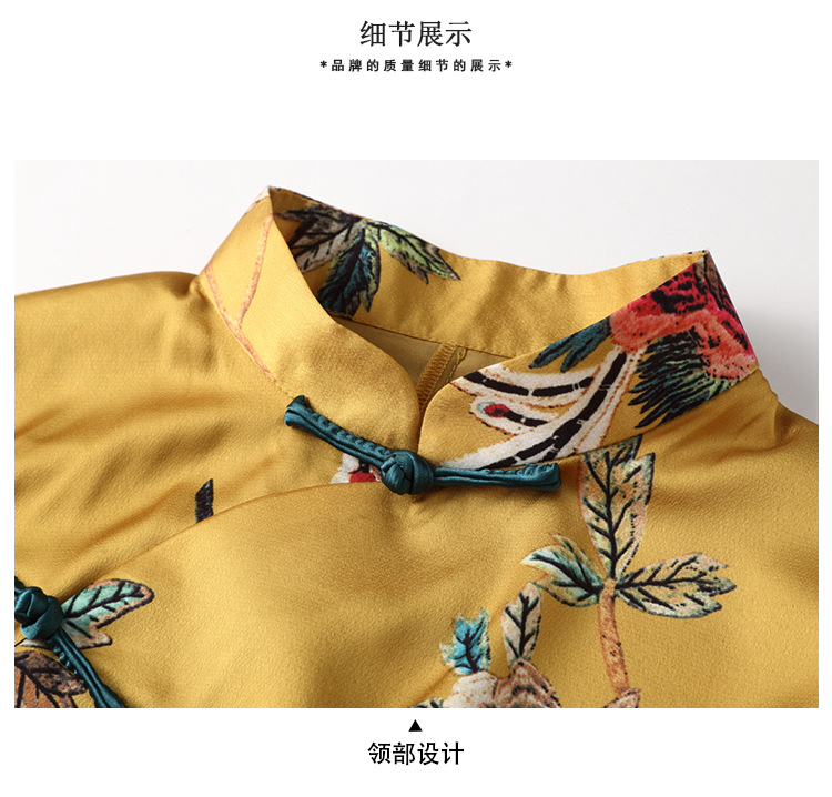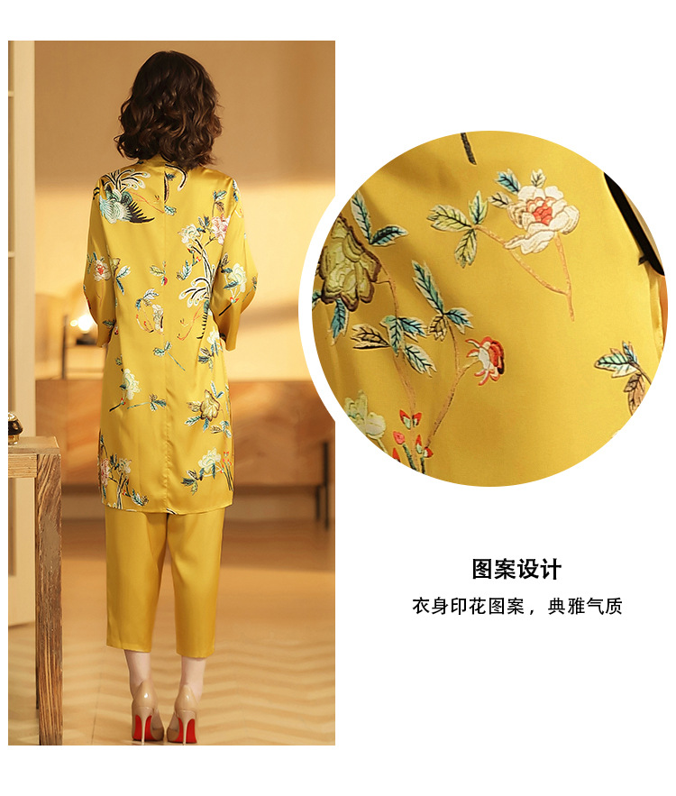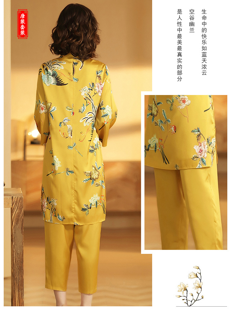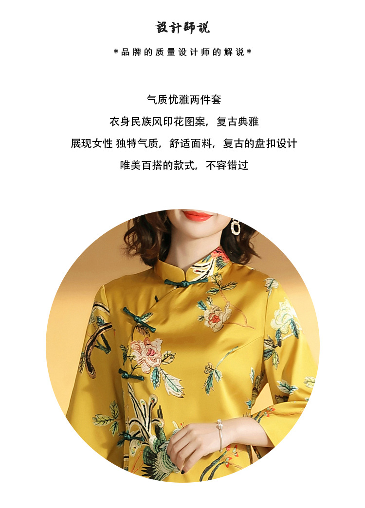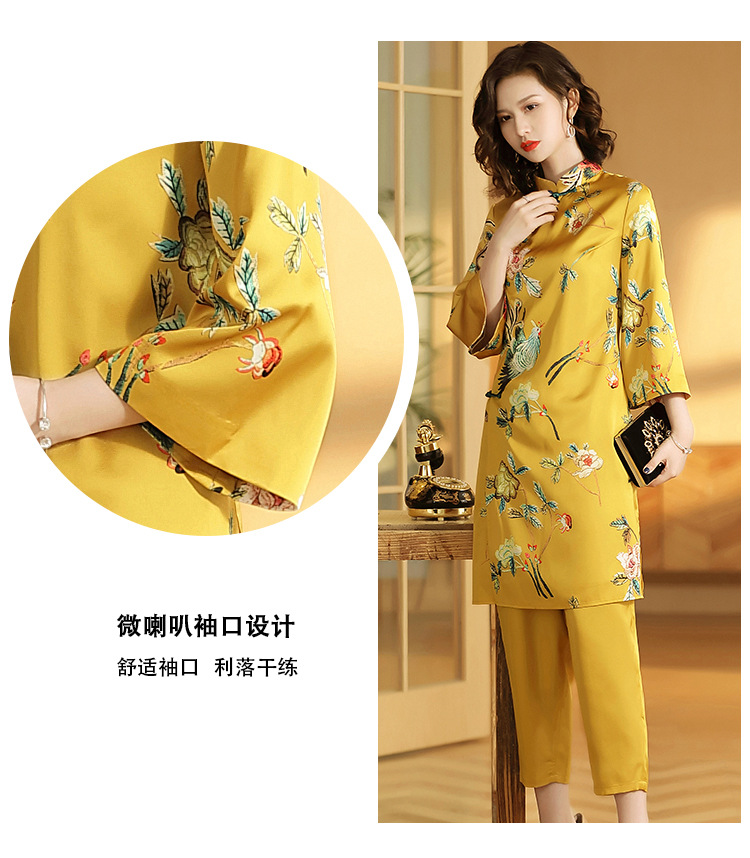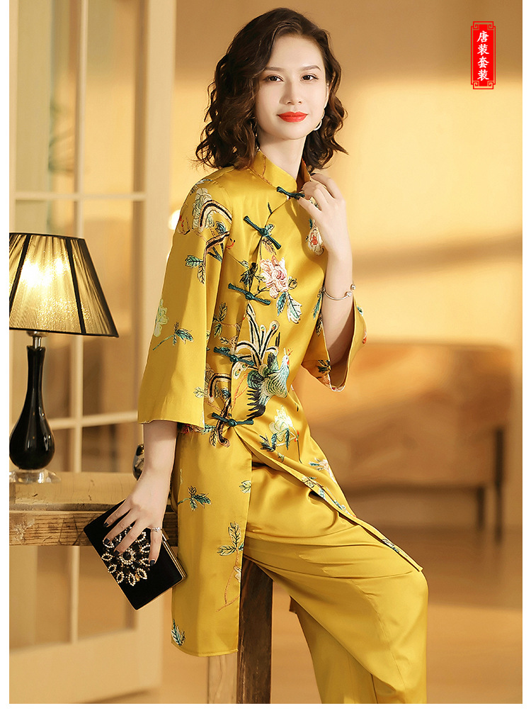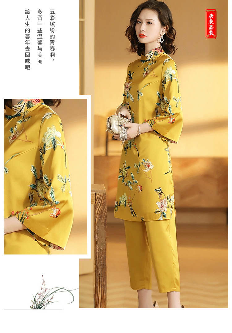 上海旗袍厂AYK-QF-190720印花旗袍唐装女长款+女裤秋季复古民国风修身旗袍唐装套装女