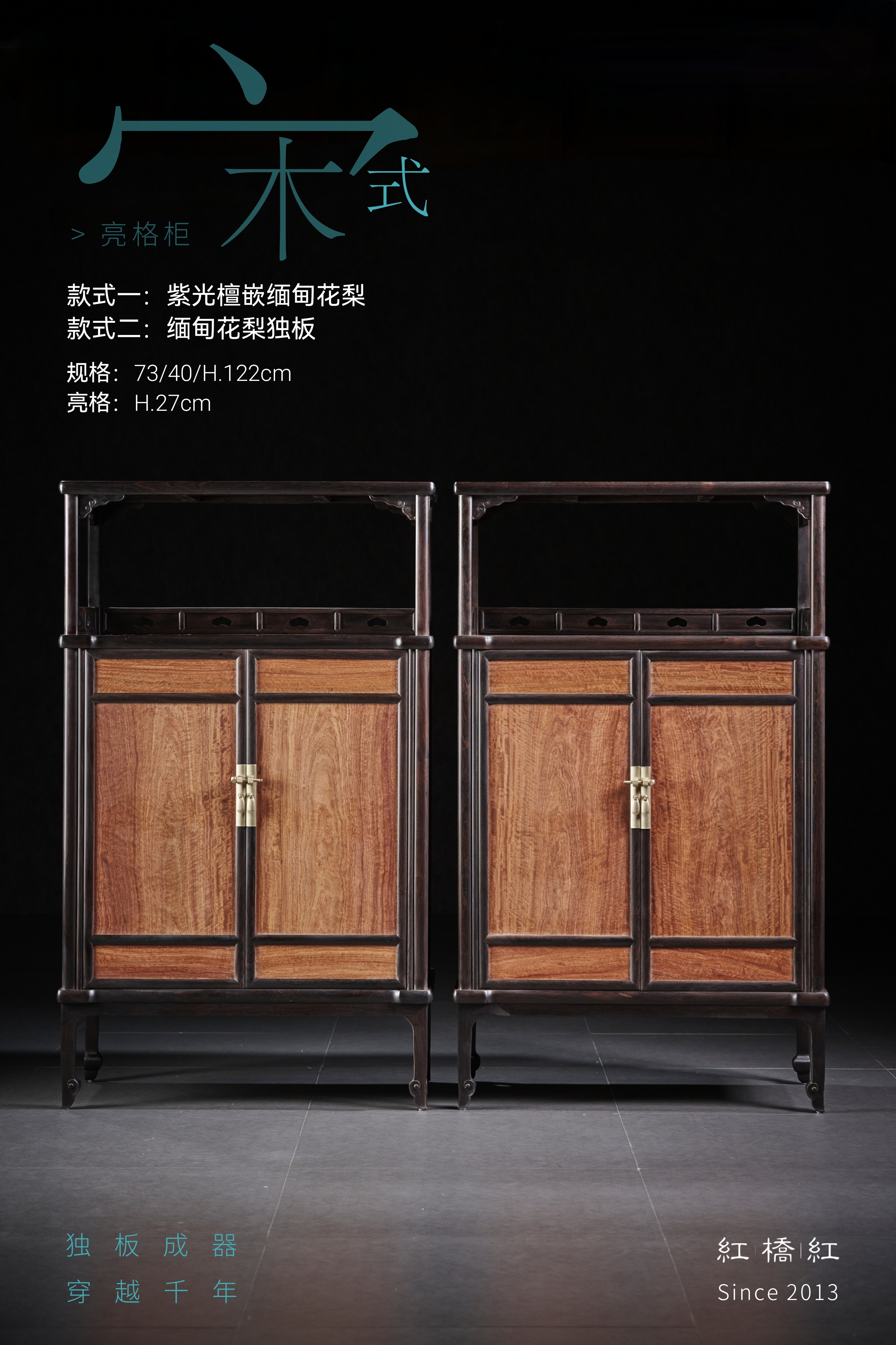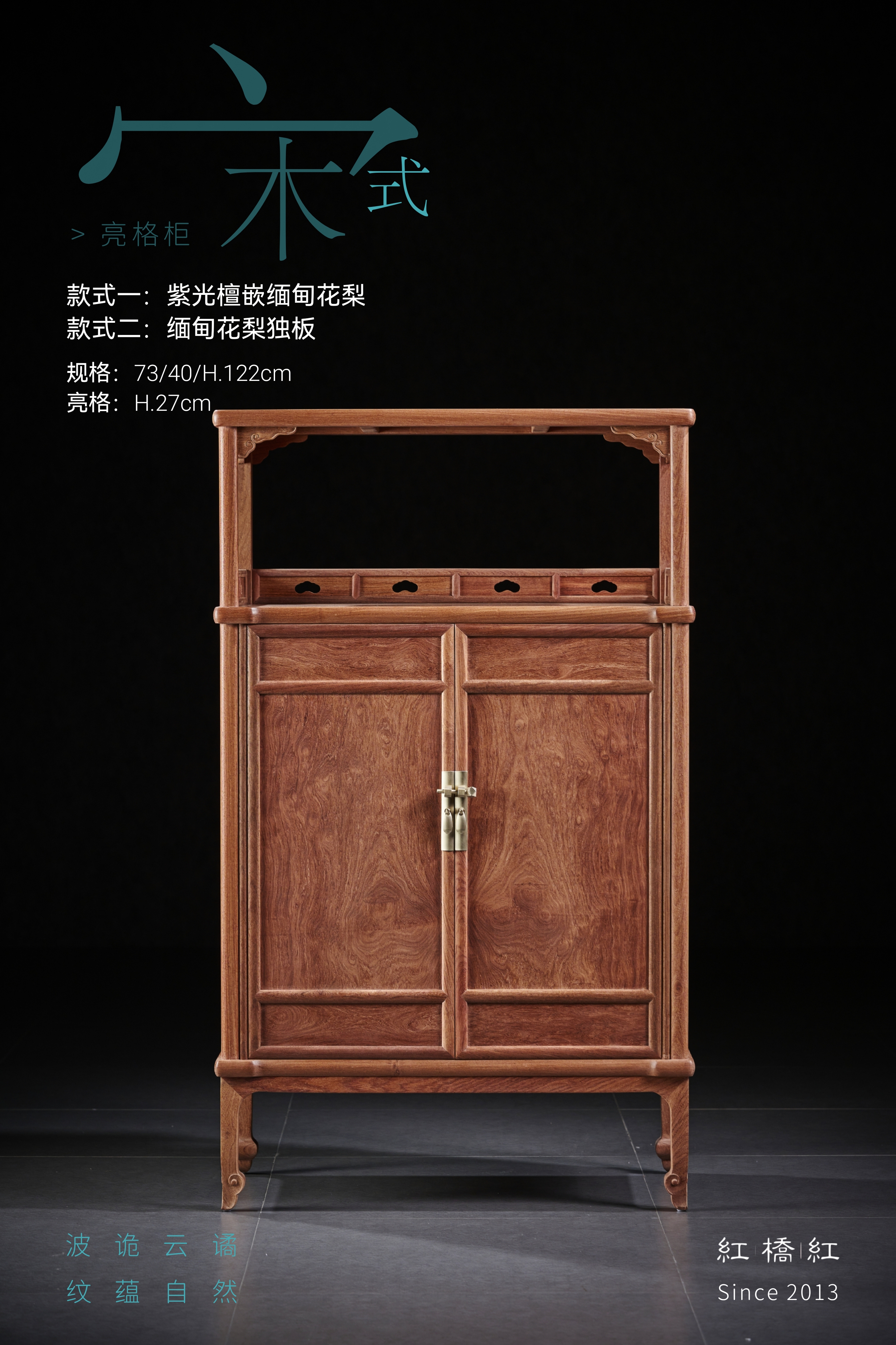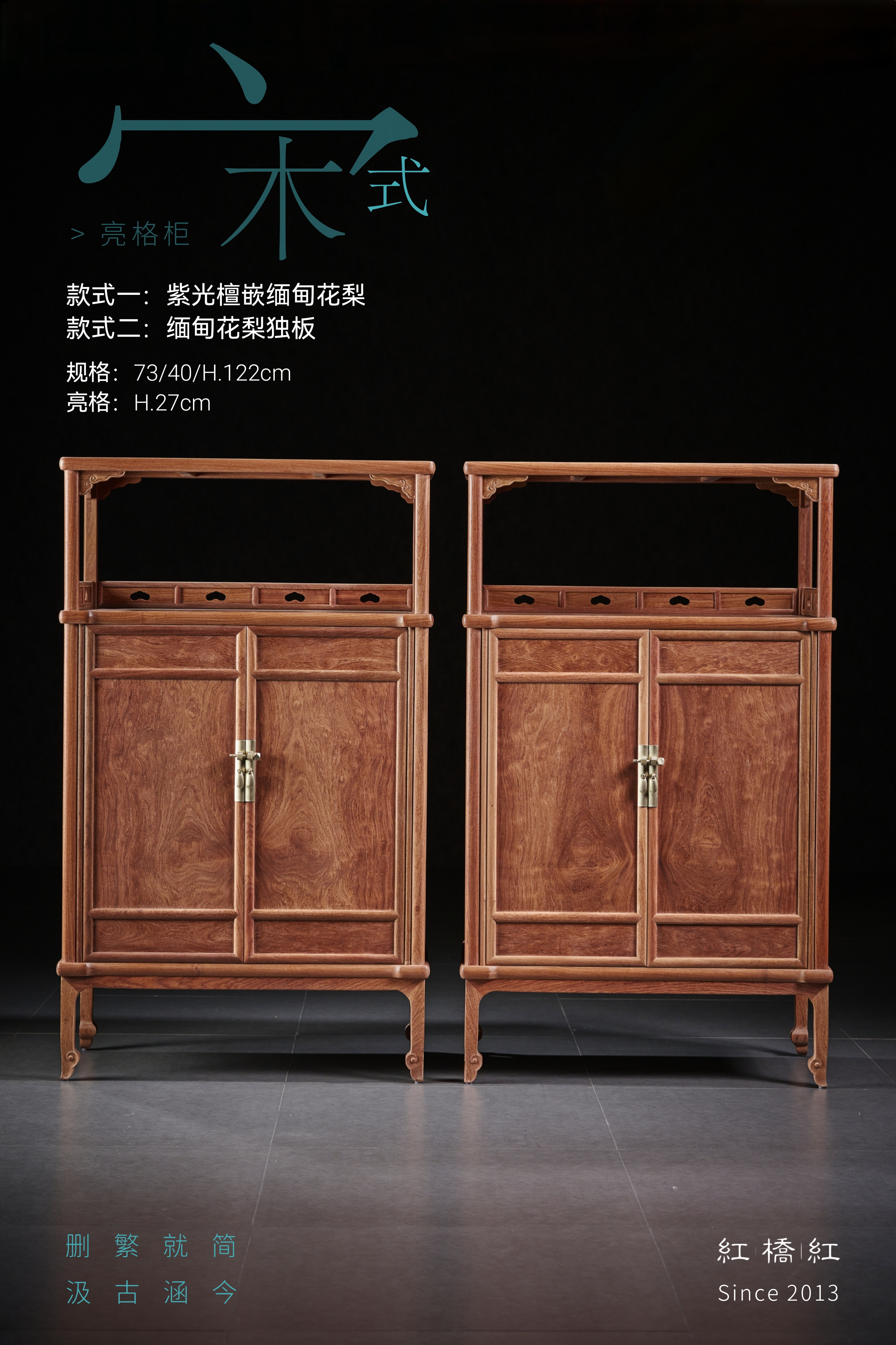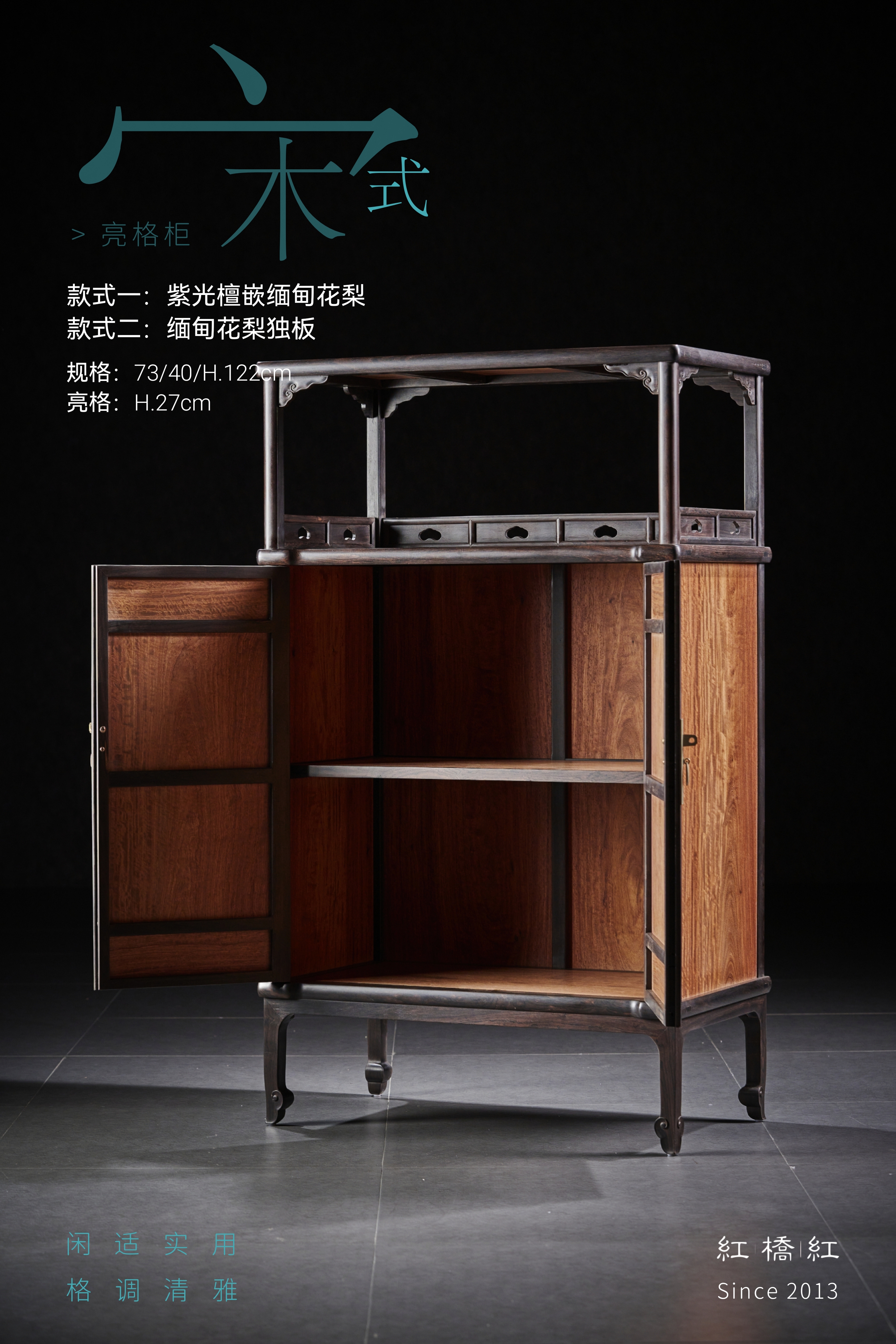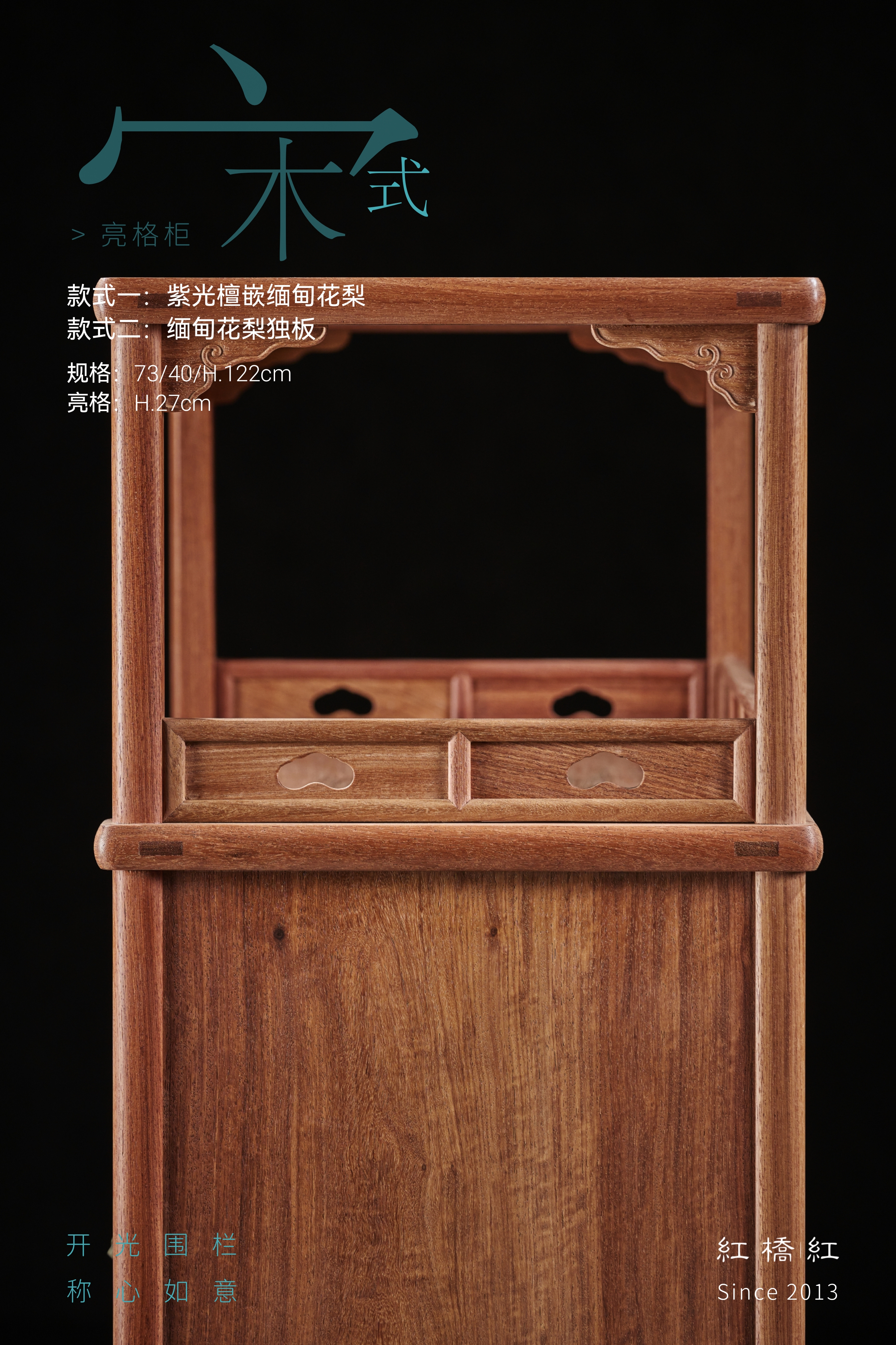 此款宋式亮格柜,红桥红出品做缅甸花梨全独板材质或紫光檀嵌缅甸花梨材质两种选择。做撞色效果,凡边框围合之材皆取紫光檀(东非黑黄檀),质坚材硬,暗纹迷人,嵌夹鲜丽缅甸花梨(正宗大果紫檀),赏之如姚黄魏紫。上部亮格四面敞开式,顶部两侧各安有两个券口牙子;三面设有围栏,围栏上镂空如意云头纹,显得格外雅致有序。柜门一木对开,纹理对称,细腻文雅;柜门攒框打槽镶独板面芯,门上镶长方形面叶铜件拉手,柜门内面有穿带加固。柜内中部安一层板分隔储物空间,可用以存放书籍,或收藏贵重物品。四足高脚挺拔,底收如意云纹足,腿足外方内圆,刚柔相济,迥然独立。整器造型简洁实用,充满了浓厚的宋韵,此器删繁就简,汲古涵今,闲适实用,格调清雅。