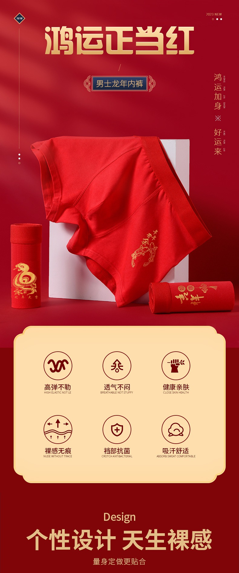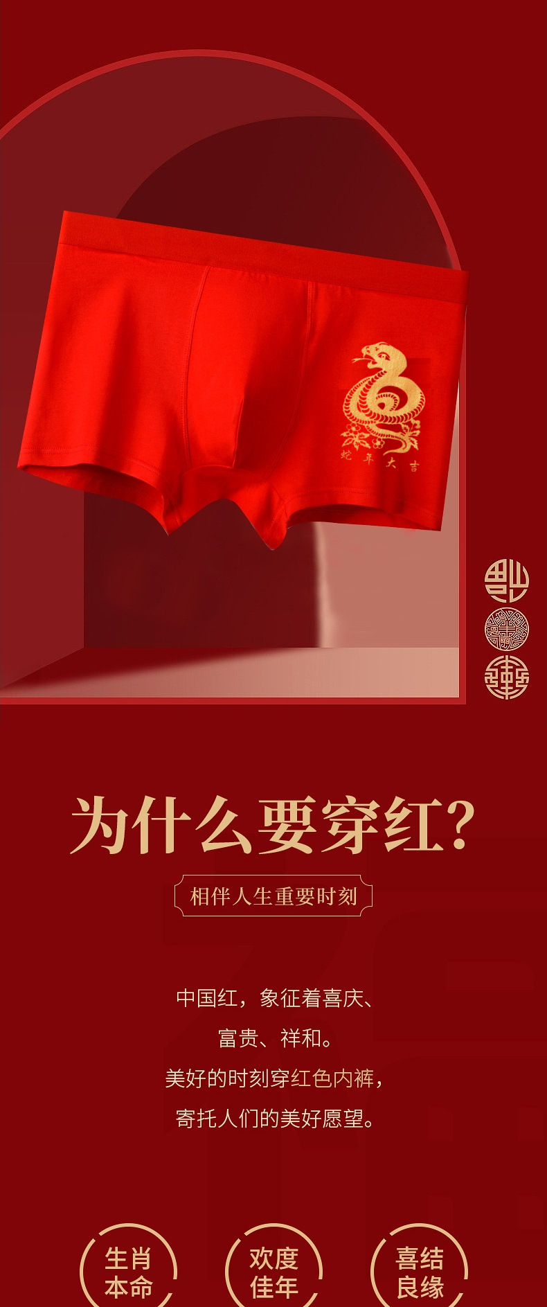 丁摩 蛇年男士平角大红内裤纯棉中腰本命年短裤新年喜庆抑菌红内裤4ZF-123006
