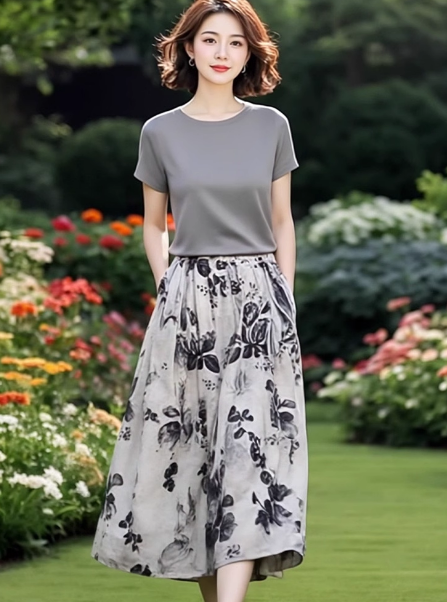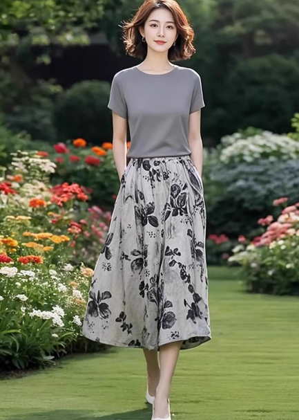 (预售8天发货)时尚简约休闲灰色T恤+印花半裙两件套LJX-124