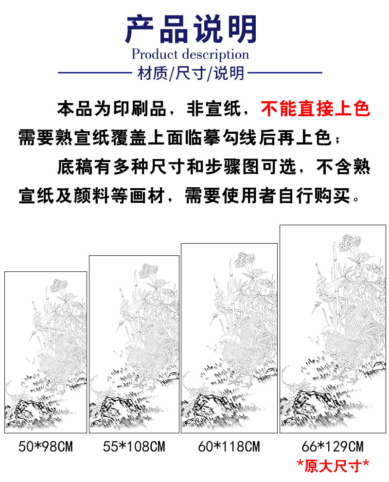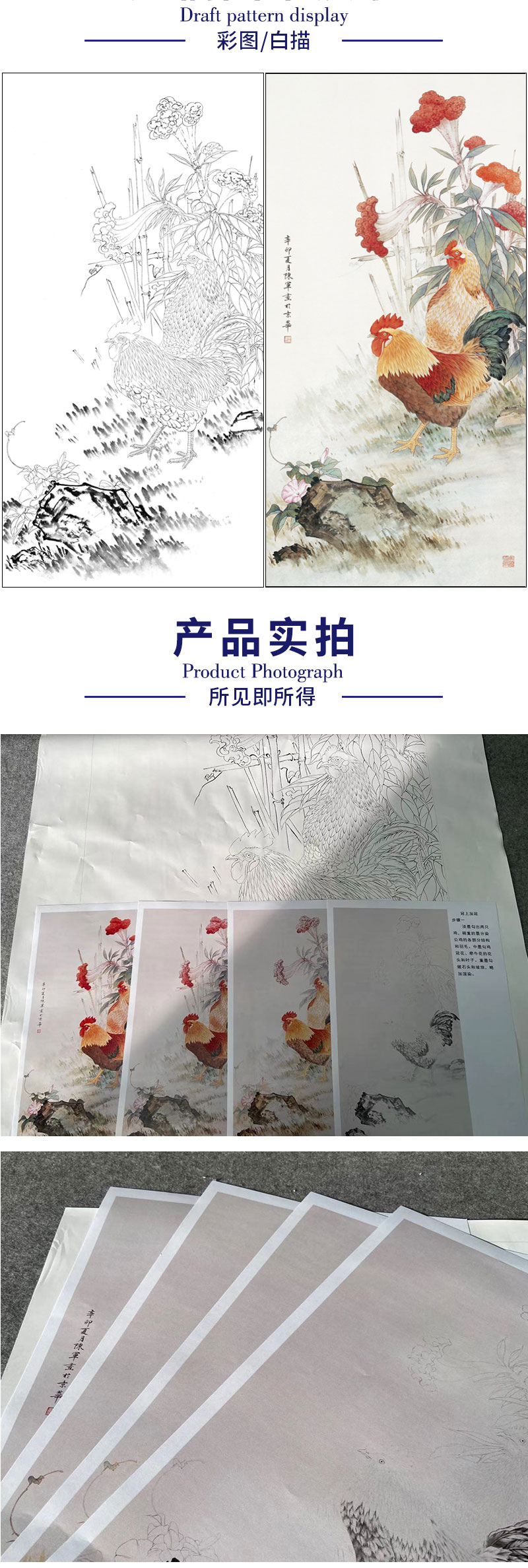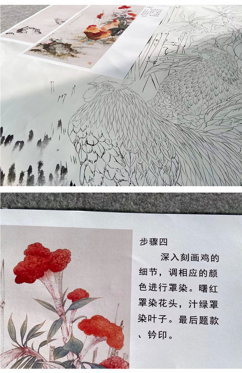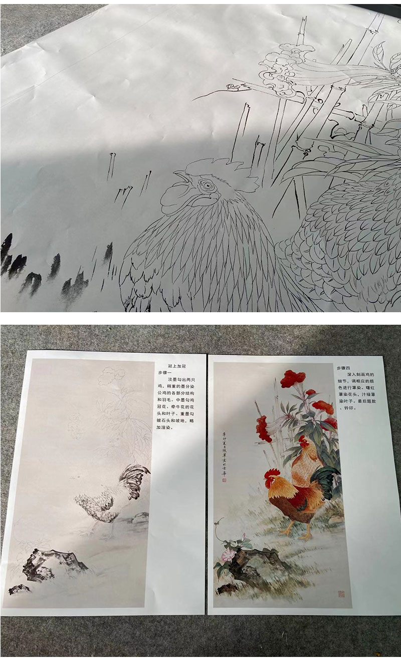【有步骤】陈军工笔画白描底稿《冠上加冠》公鸡牵牛花初学者临摹花鸟线稿CJ21