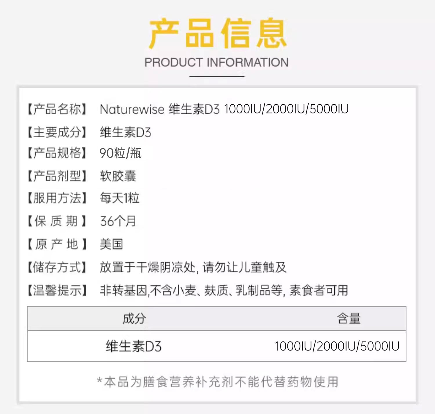 Naturewise牌维他命D3软胶囊1000IU/2000IU/5000IU 90粒