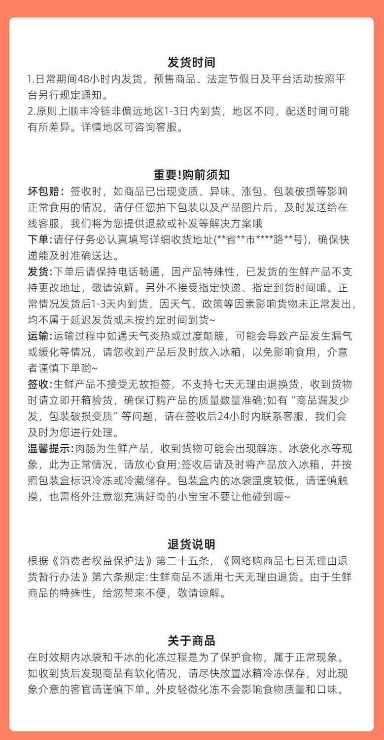 【关于售后】因产品的特殊性(生鲜冻品类),不支持七天无理由退货,收到后如有少货,破损等情况,请签收后24小时内联系客服处理!