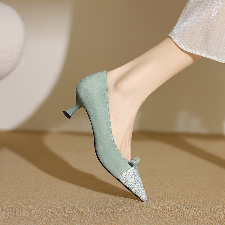 【货号】0262【帮面材质】羊反绒+三文鱼皮【内里材质】猪里【鞋垫材质】羊皮里【鞋底材质】牛筋底【跟高】5CM【颜色】黑色、绿色【尺码:】34-40(大小定制不退换)