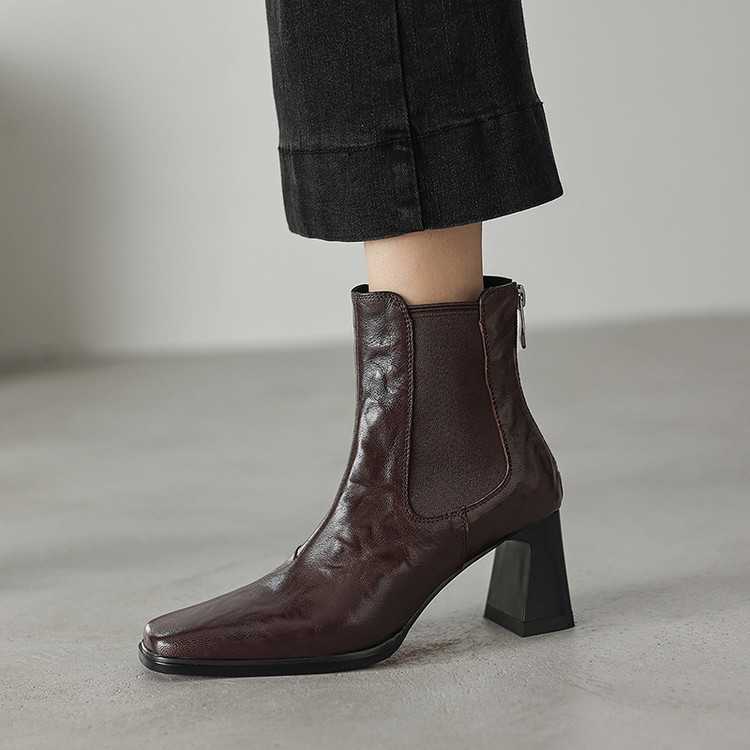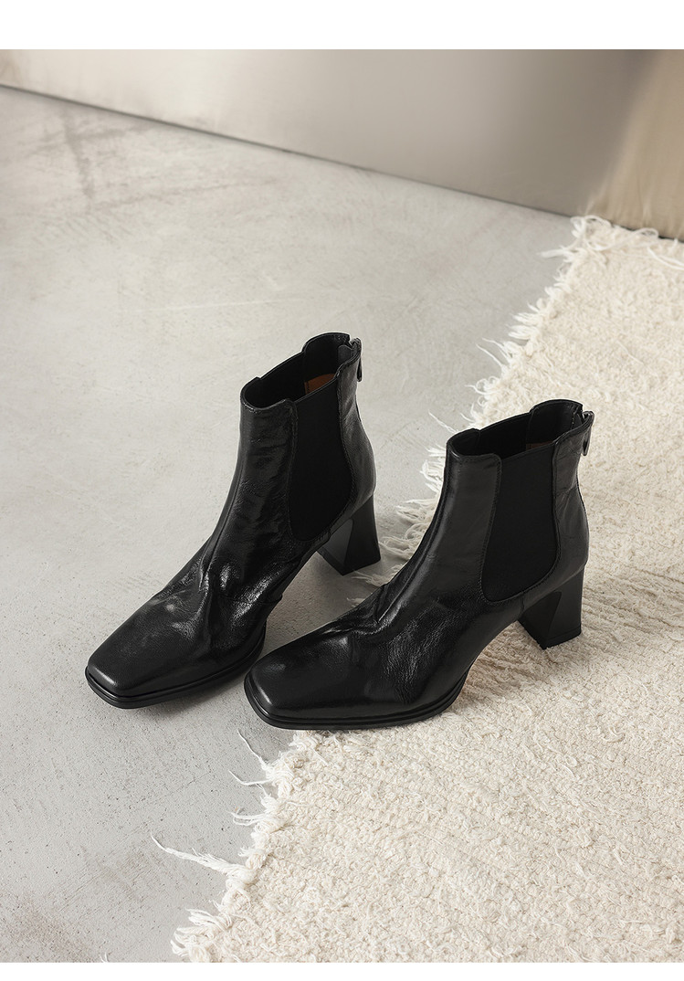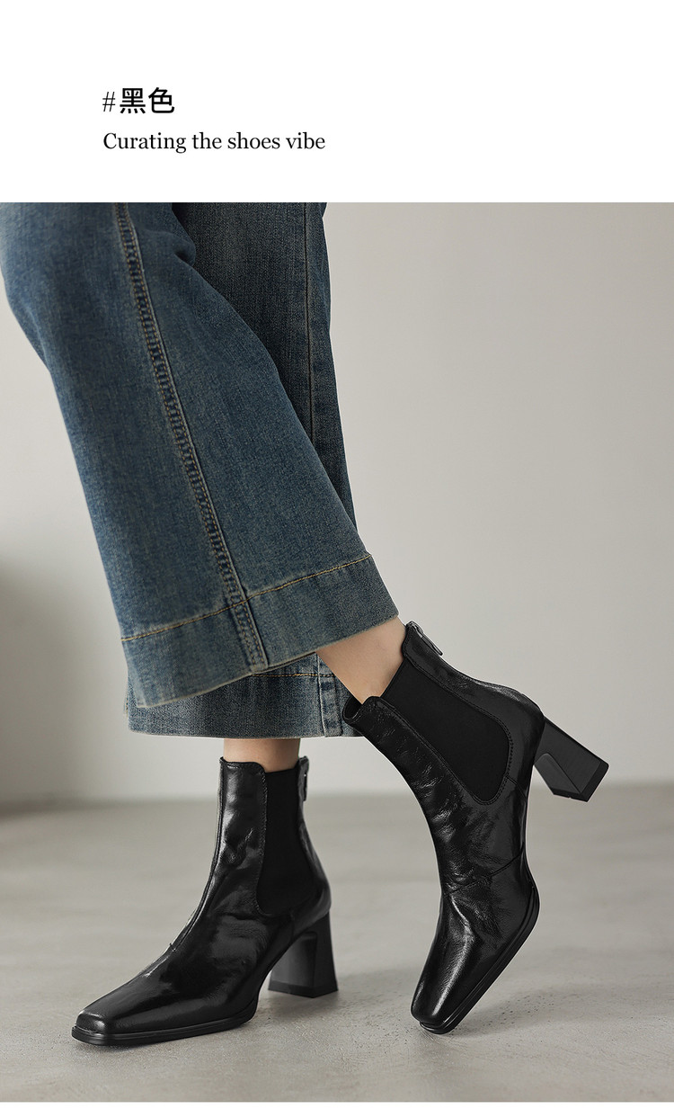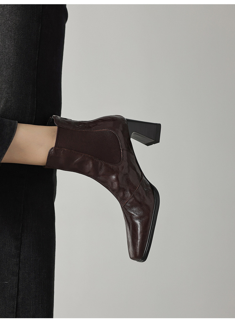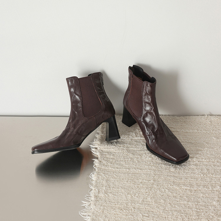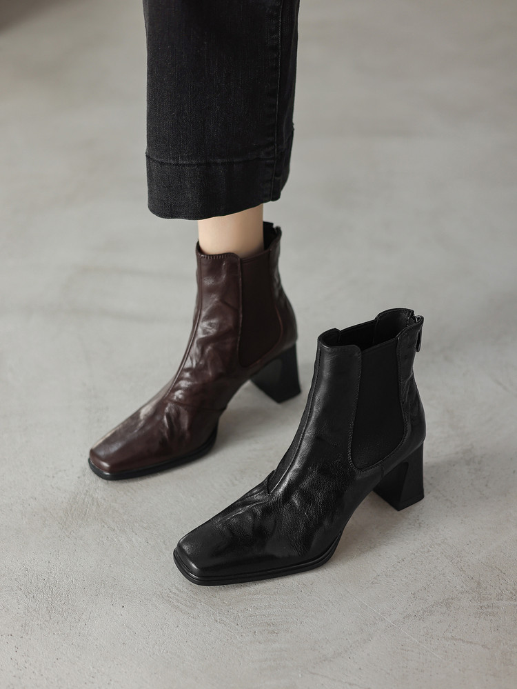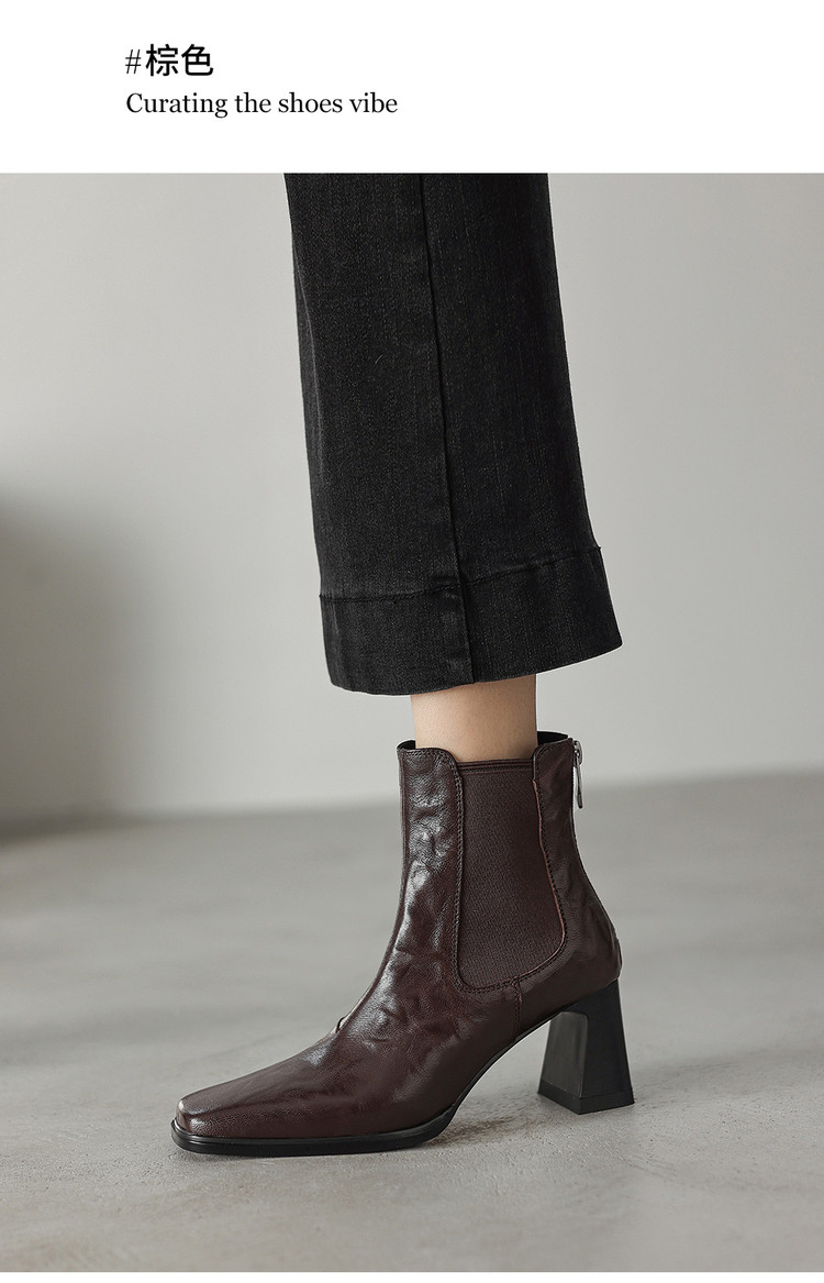 【预售5天】秋冬新款法式手抓羊皮高跟粗跟短靴女复古松紧带方头切尔西靴HB&1406