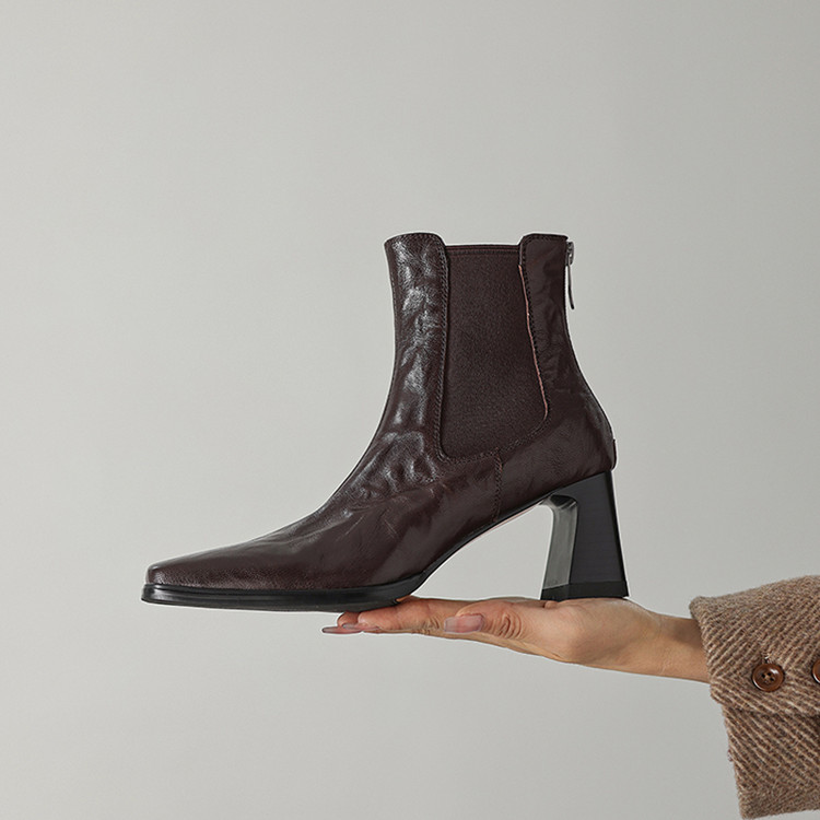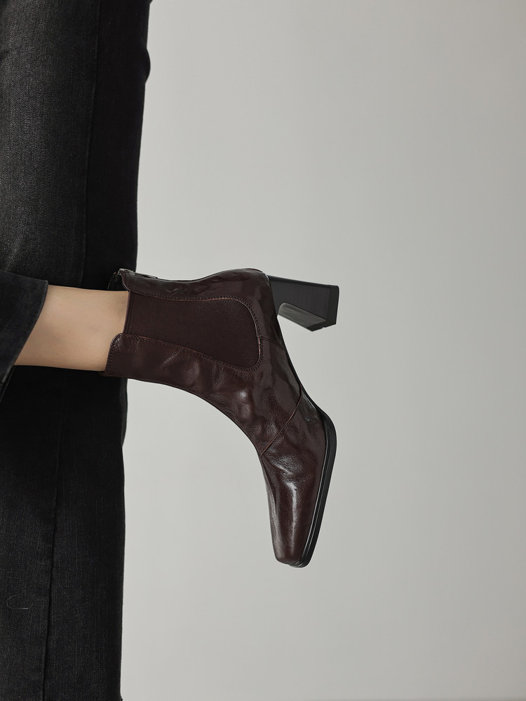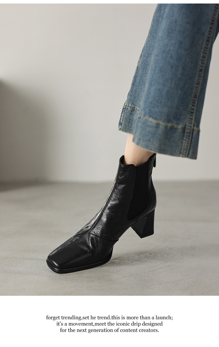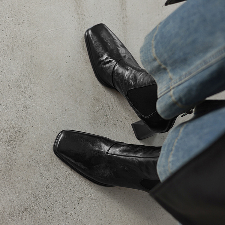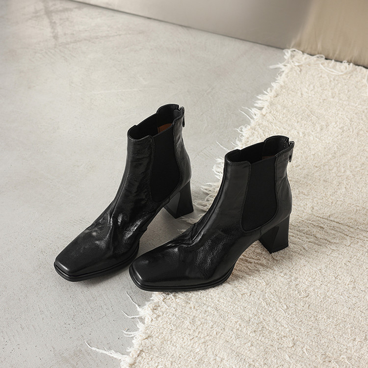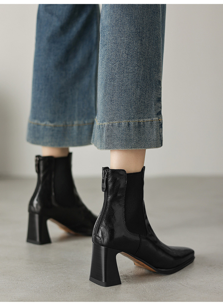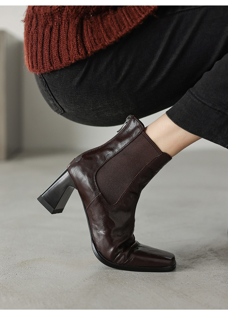 【预售5天】秋冬新款法式手抓羊皮高跟粗跟短靴女复古松紧带方头切尔西靴HB&1406