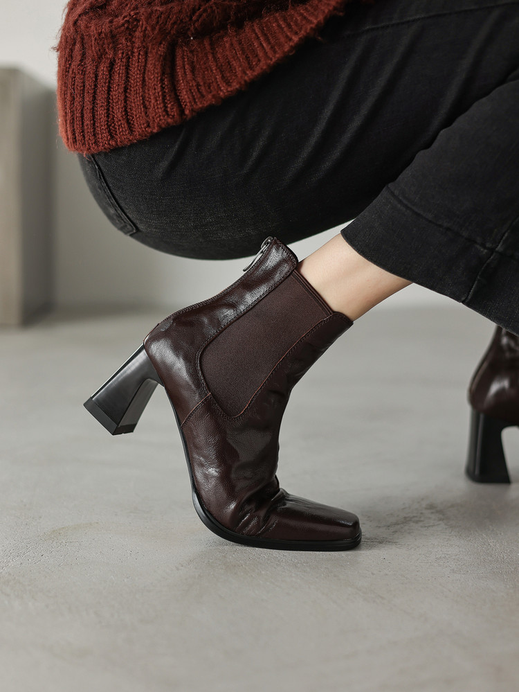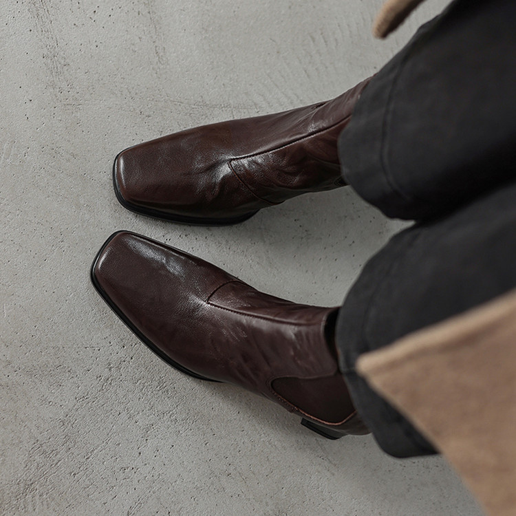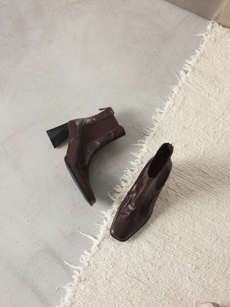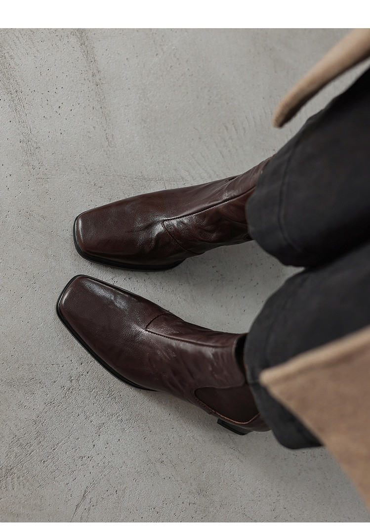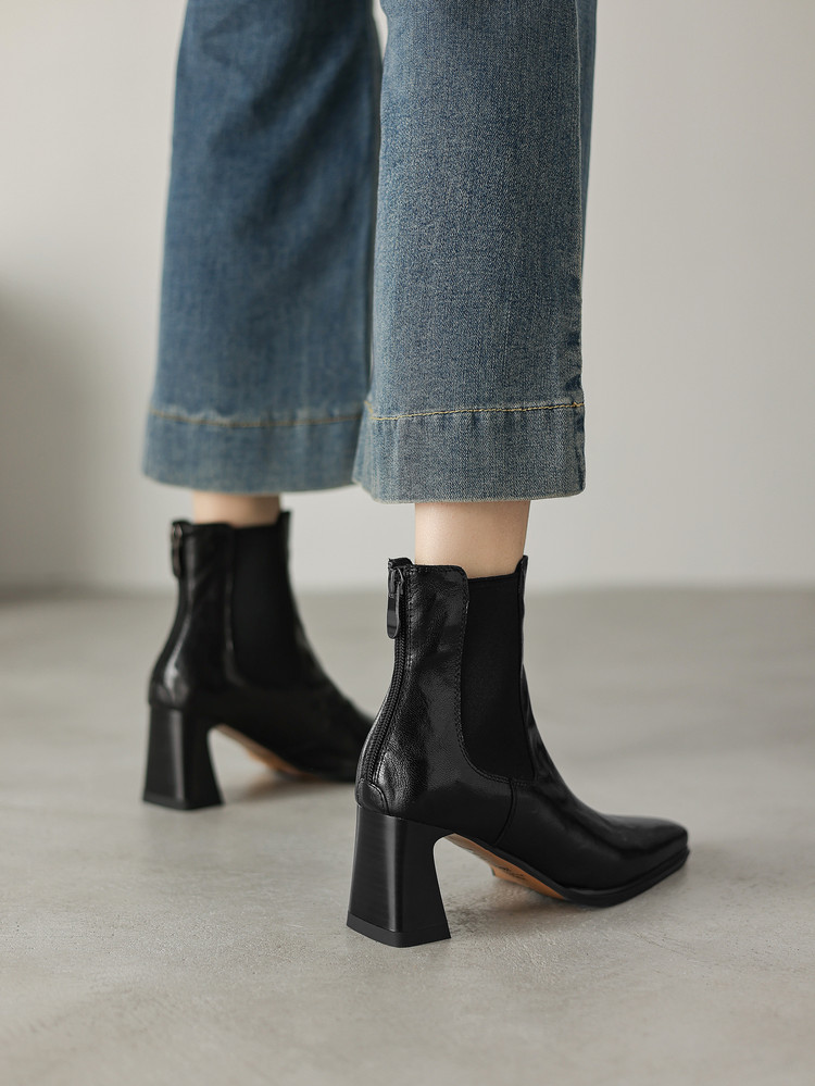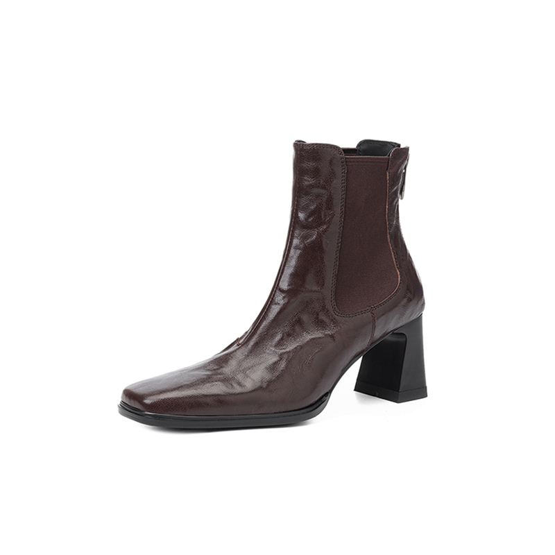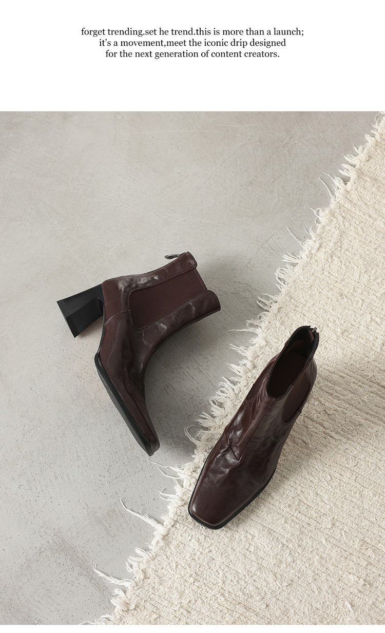 【预售5天】秋冬新款法式手抓羊皮高跟粗跟短靴女复古松紧带方头切尔西靴HB&1406