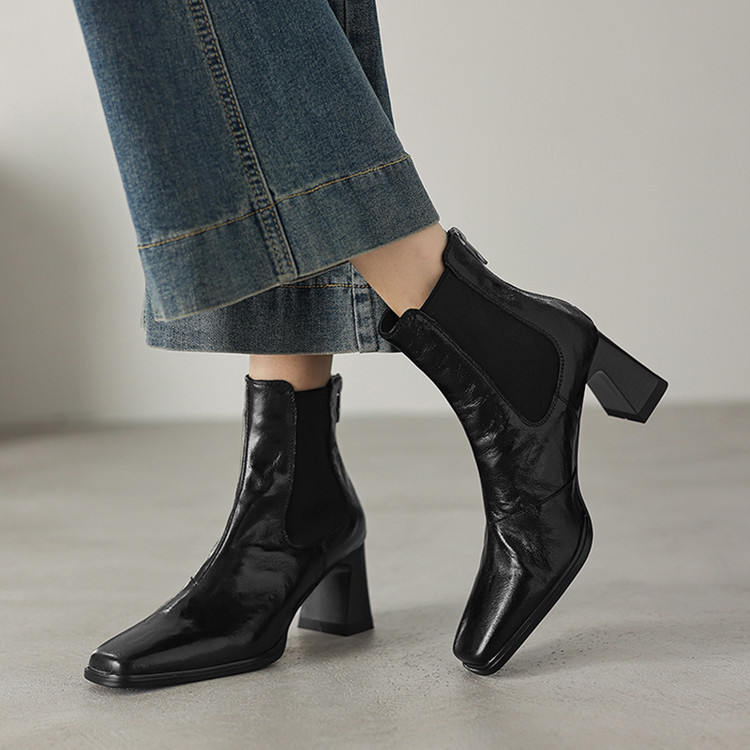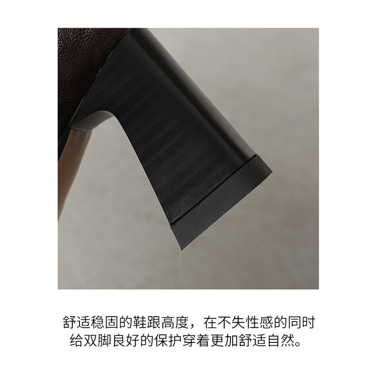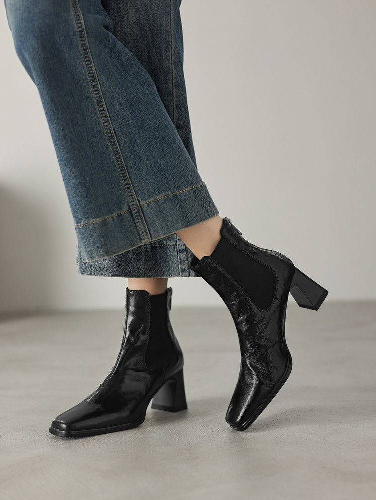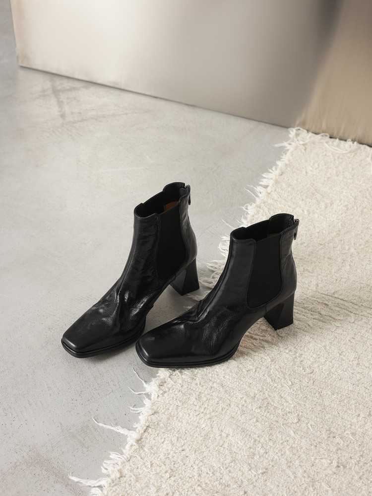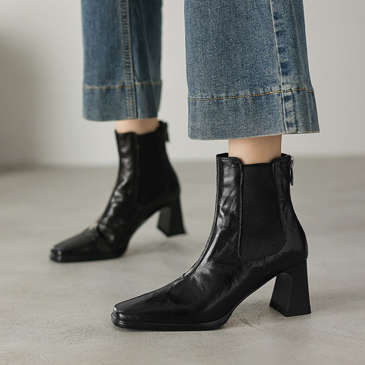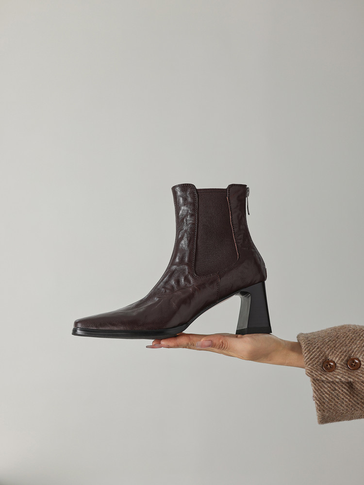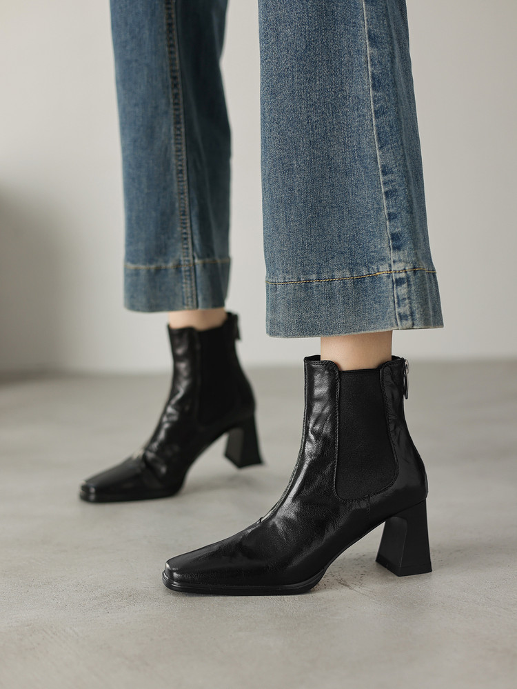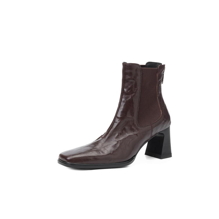 【预售5天】秋冬新款法式手抓羊皮高跟粗跟短靴女复古松紧带方头切尔西靴HB&1406