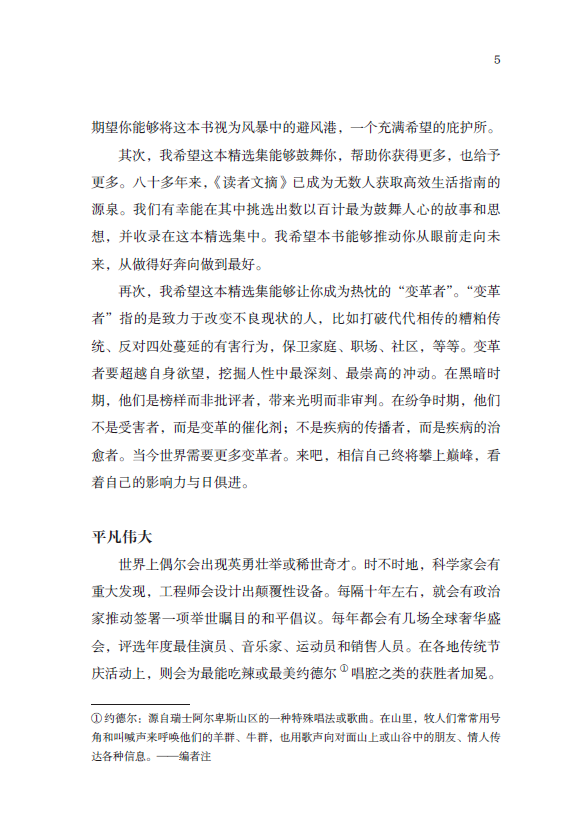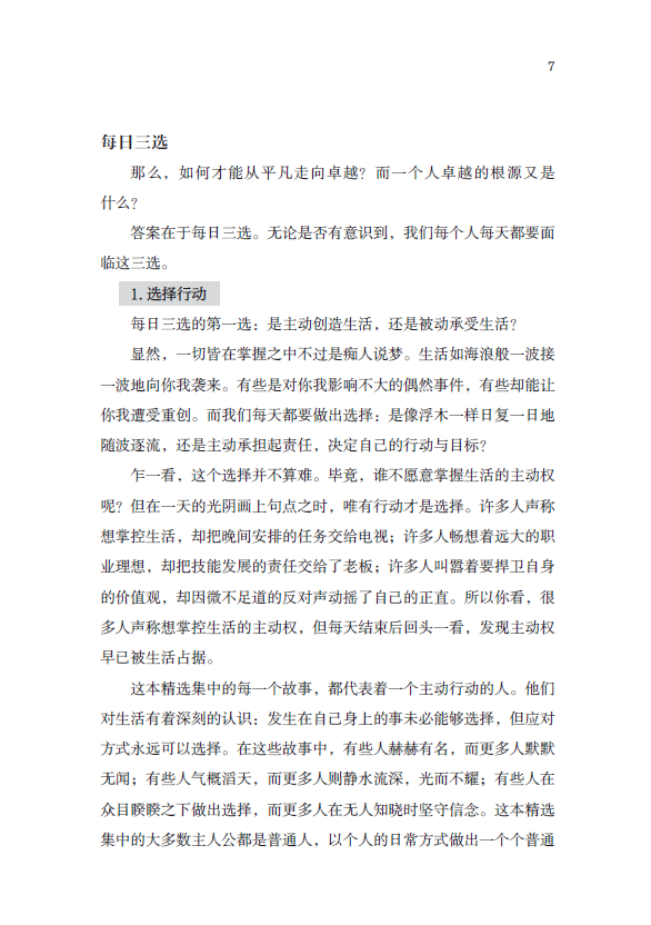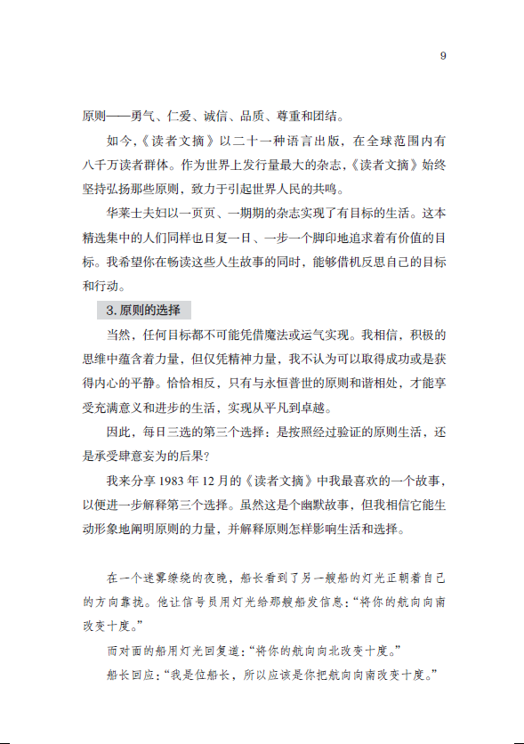 本书涉及七大主题,分别为:寻觅意义、掌控人生、始于内心、创造梦想、团结合作、征服逆境、协调人生,本书以此为线索,创造性地摘选了《读者文摘》中数十个意义深刻、鼓舞人心的故事,其中还包括一些世界上颇具影响力的名人故事,如达·芬奇、狄更斯、玛雅·安吉罗、杰克·本尼、华特·迪士尼、戴维·梭罗……