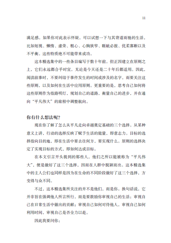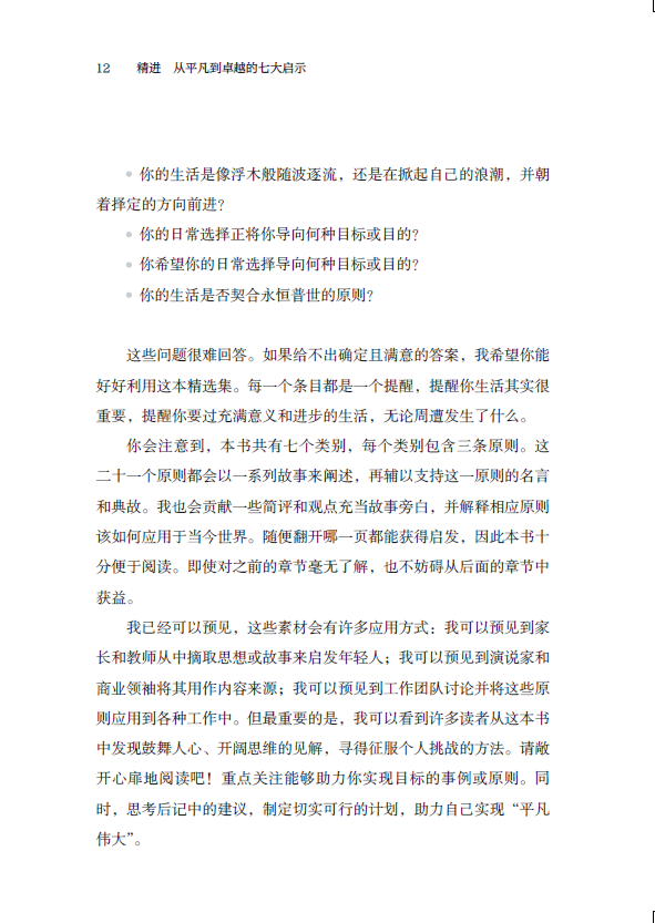 史蒂芬·柯维在每篇故事的末尾附上见解和评论。他针对人们在日常学习、工作以及生活中可能会面临的困难,以极富洞察力和远见的视角,从这些故事中提炼出诸多值得借鉴和学习的认知理念及行事原则,旨在引导人们从迷茫、烦躁、内耗和无意义的状态中解脱出来,帮助人们在当下这个充满不确定性的时代,每天精进一点,最终从平凡走向卓越。