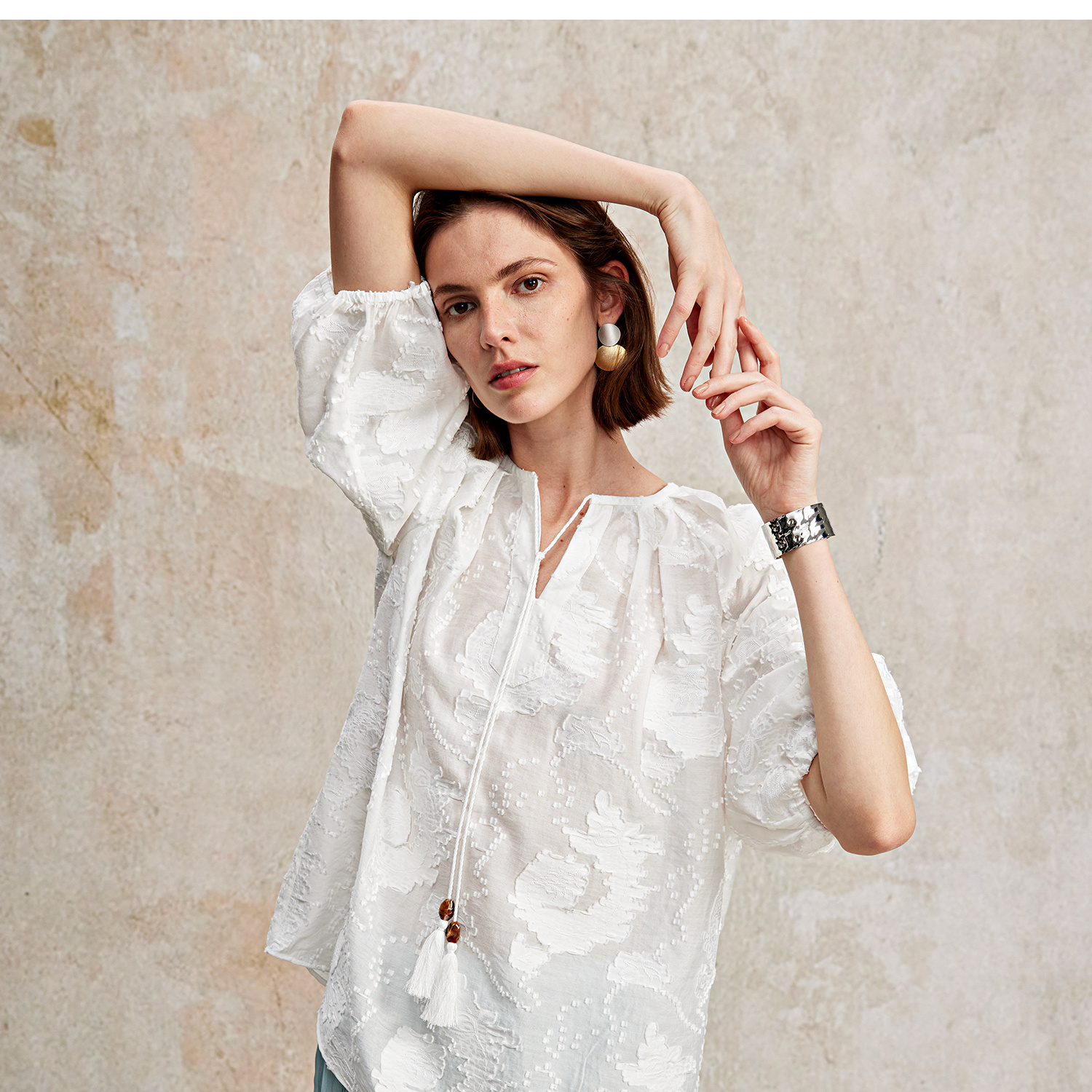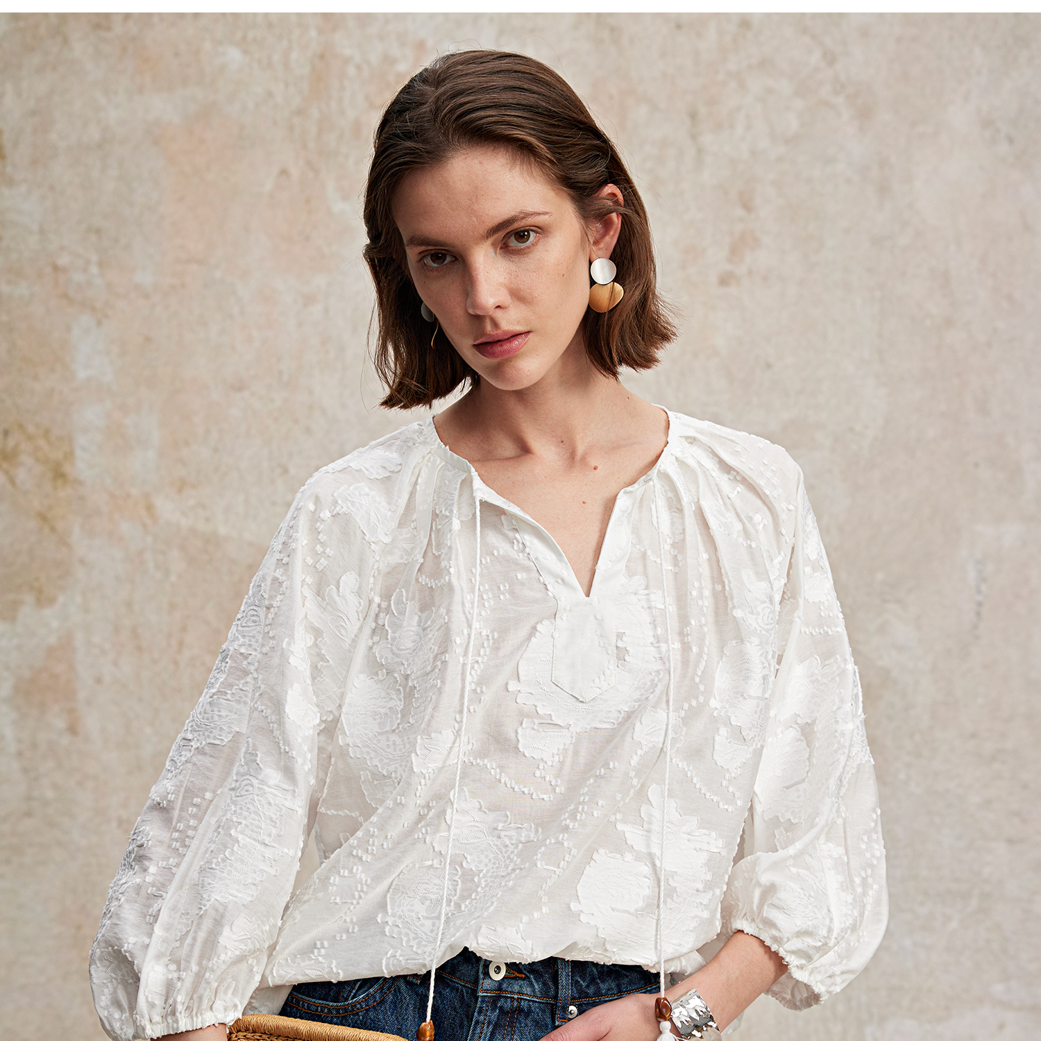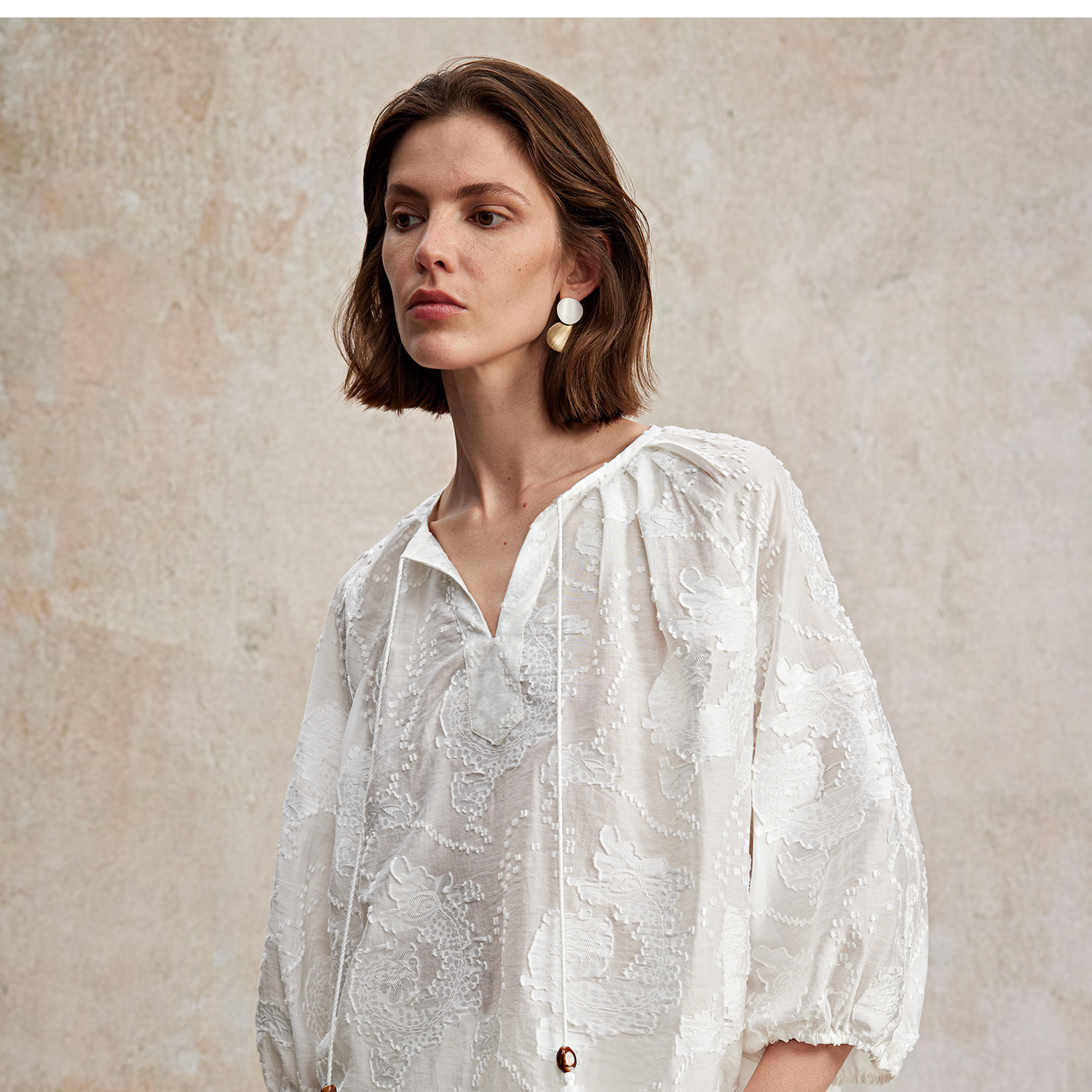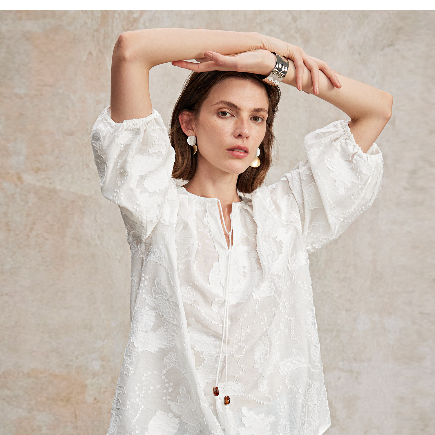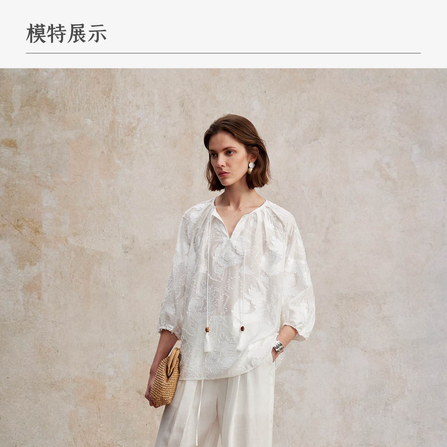 西嘉原创设计 法式浪漫度假风衬衫花卉提花V领七分泡泡袖上衣女夏CS2502081