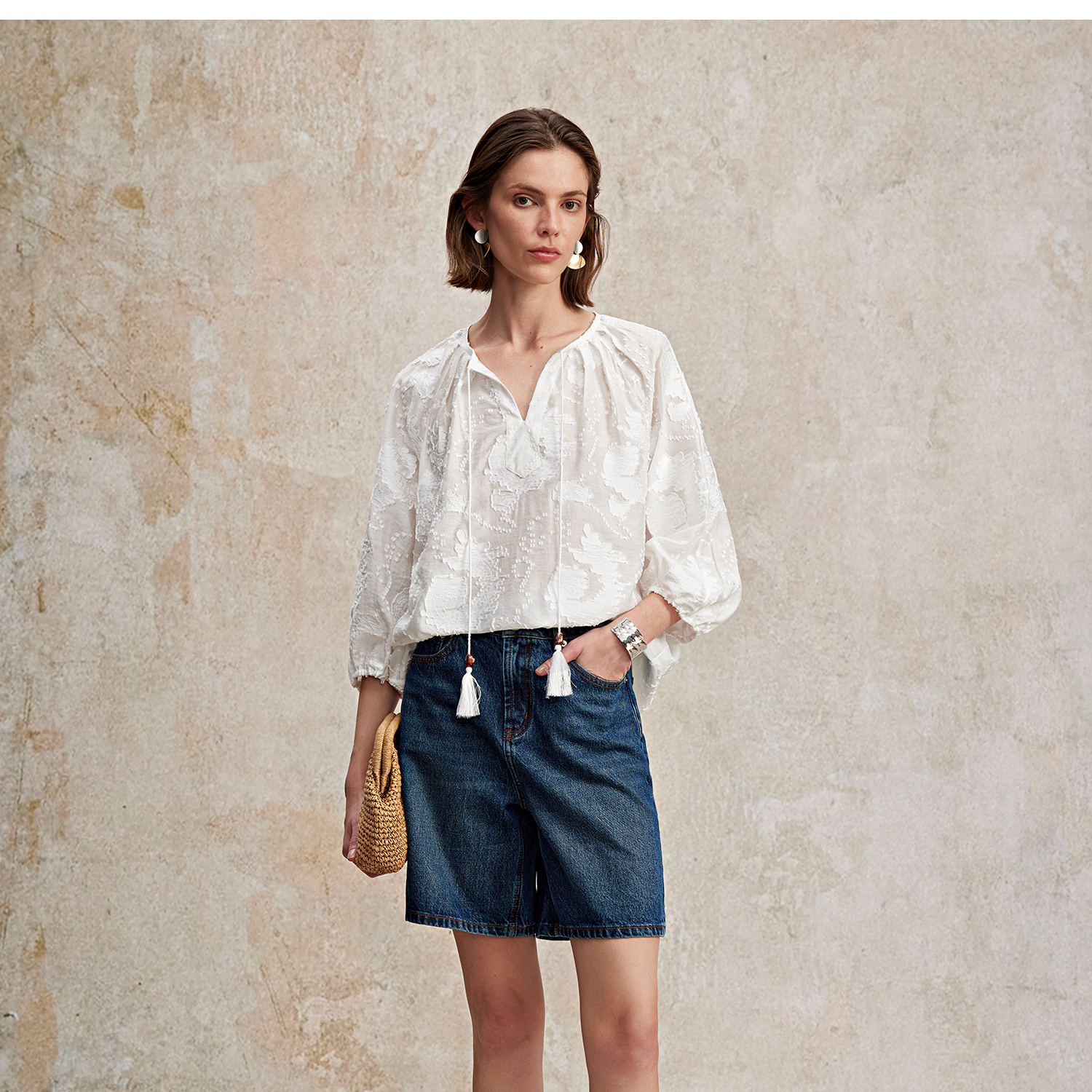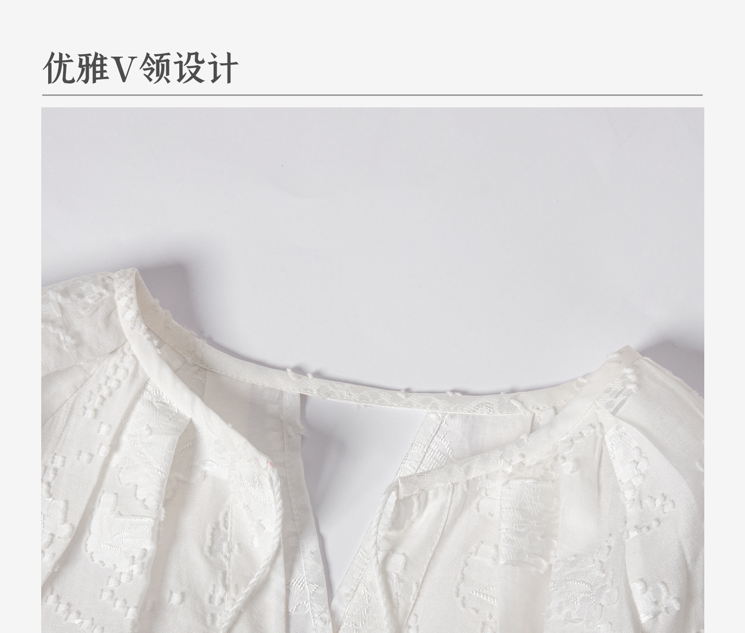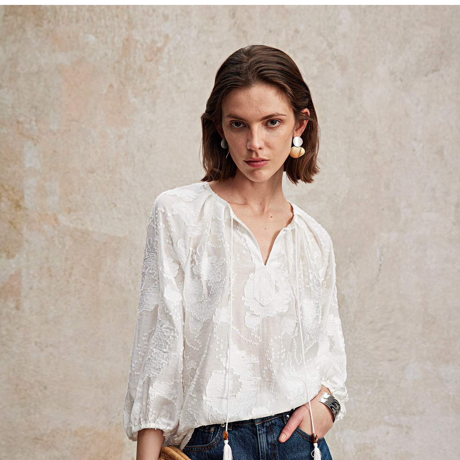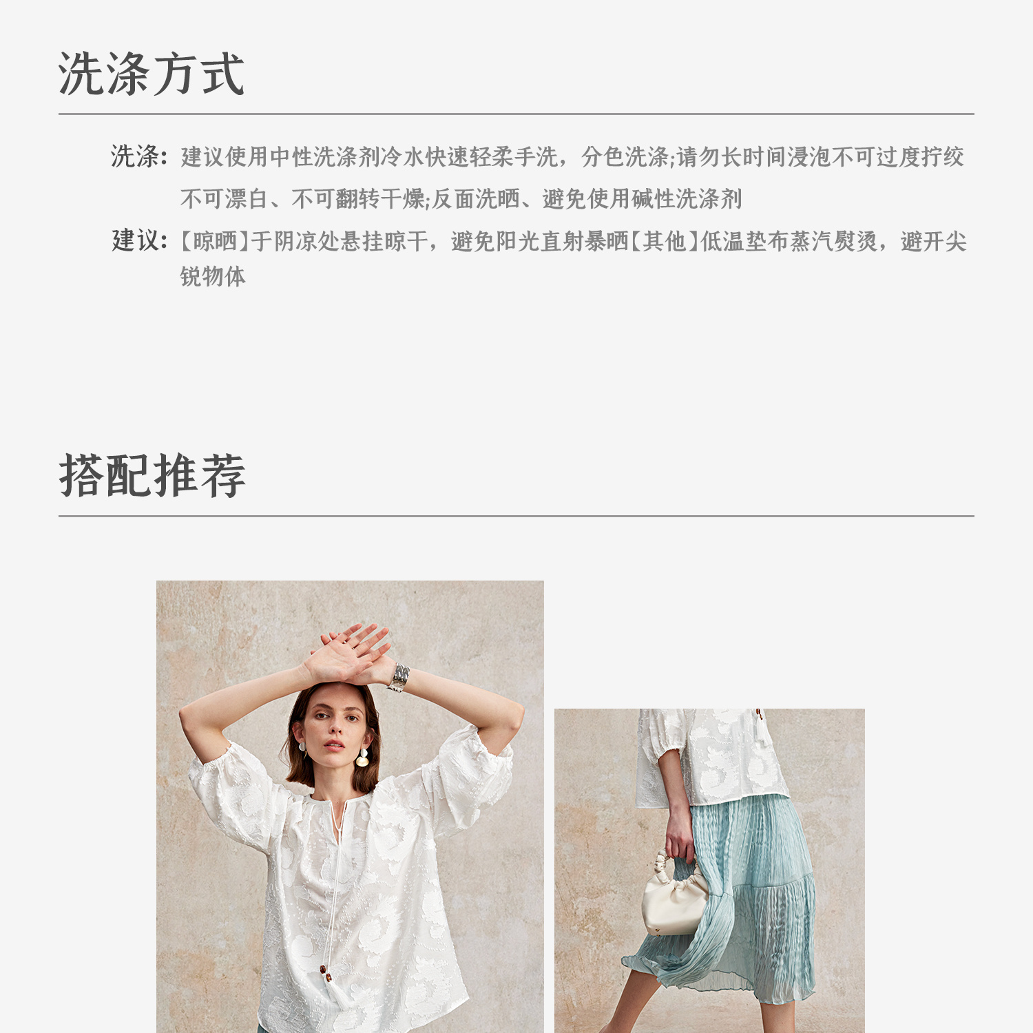 西嘉原创设计 法式浪漫度假风衬衫花卉提花V领七分泡泡袖上衣女夏CS2502081