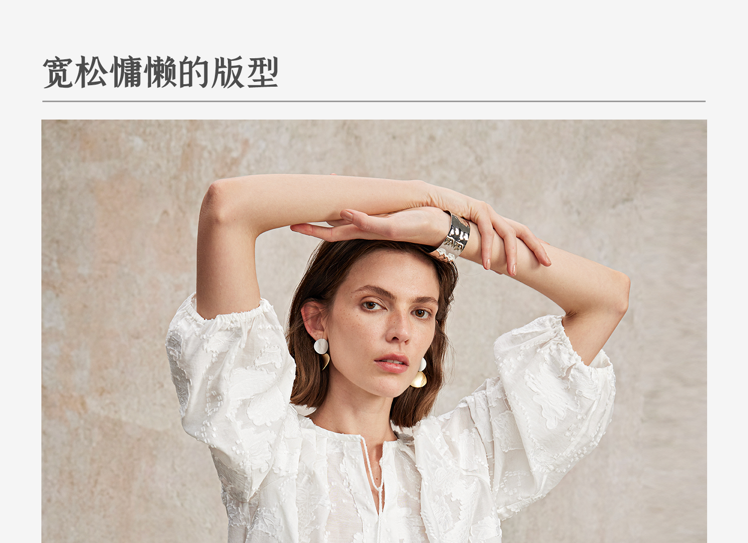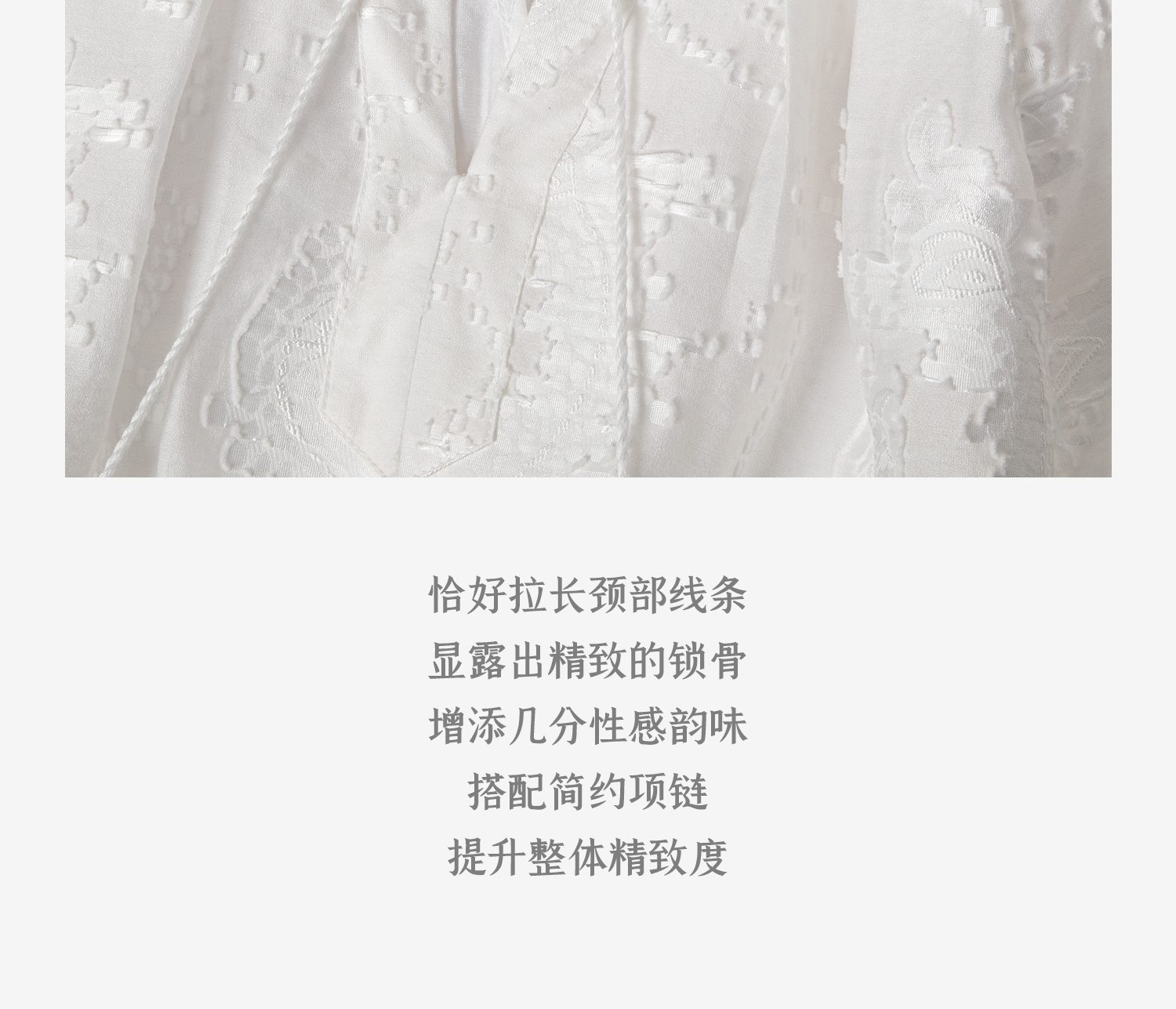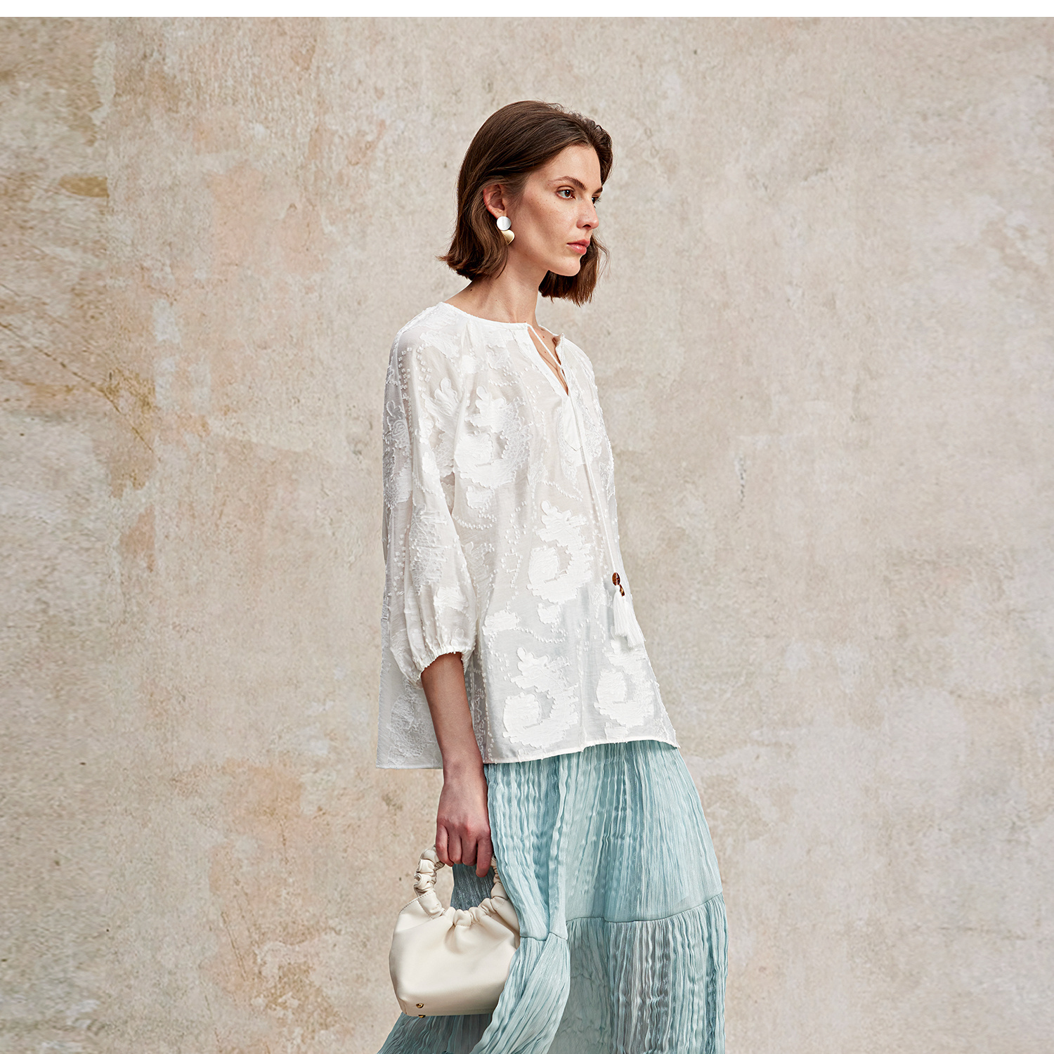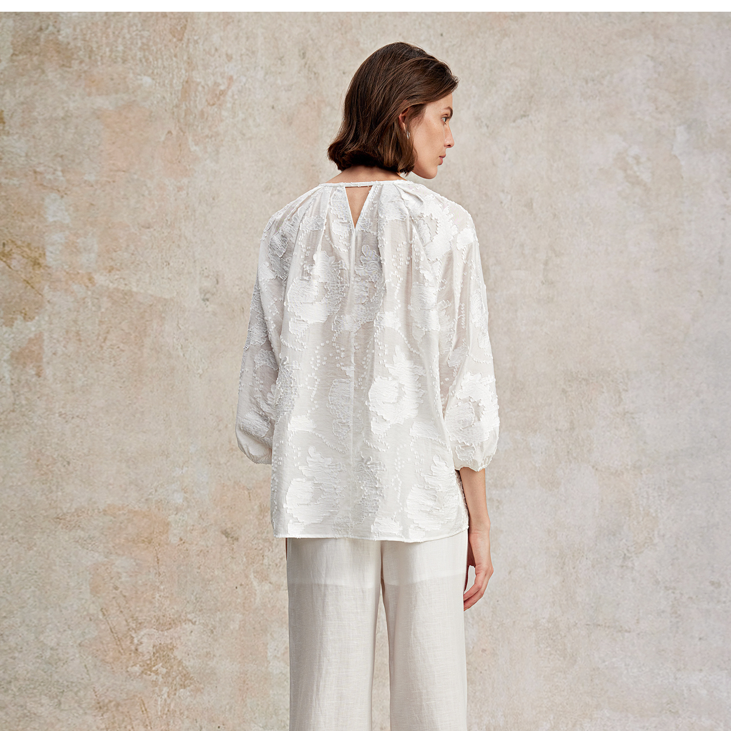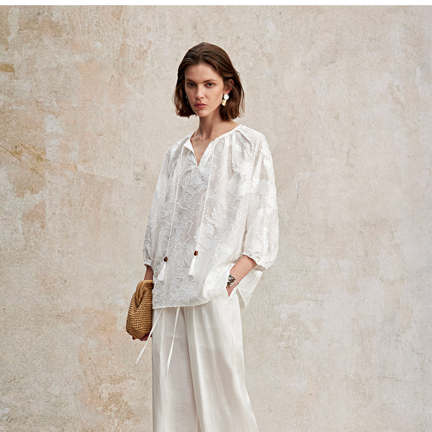 西嘉原创设计 法式浪漫度假风衬衫花卉提花V领七分泡泡袖上衣女夏CS2502081