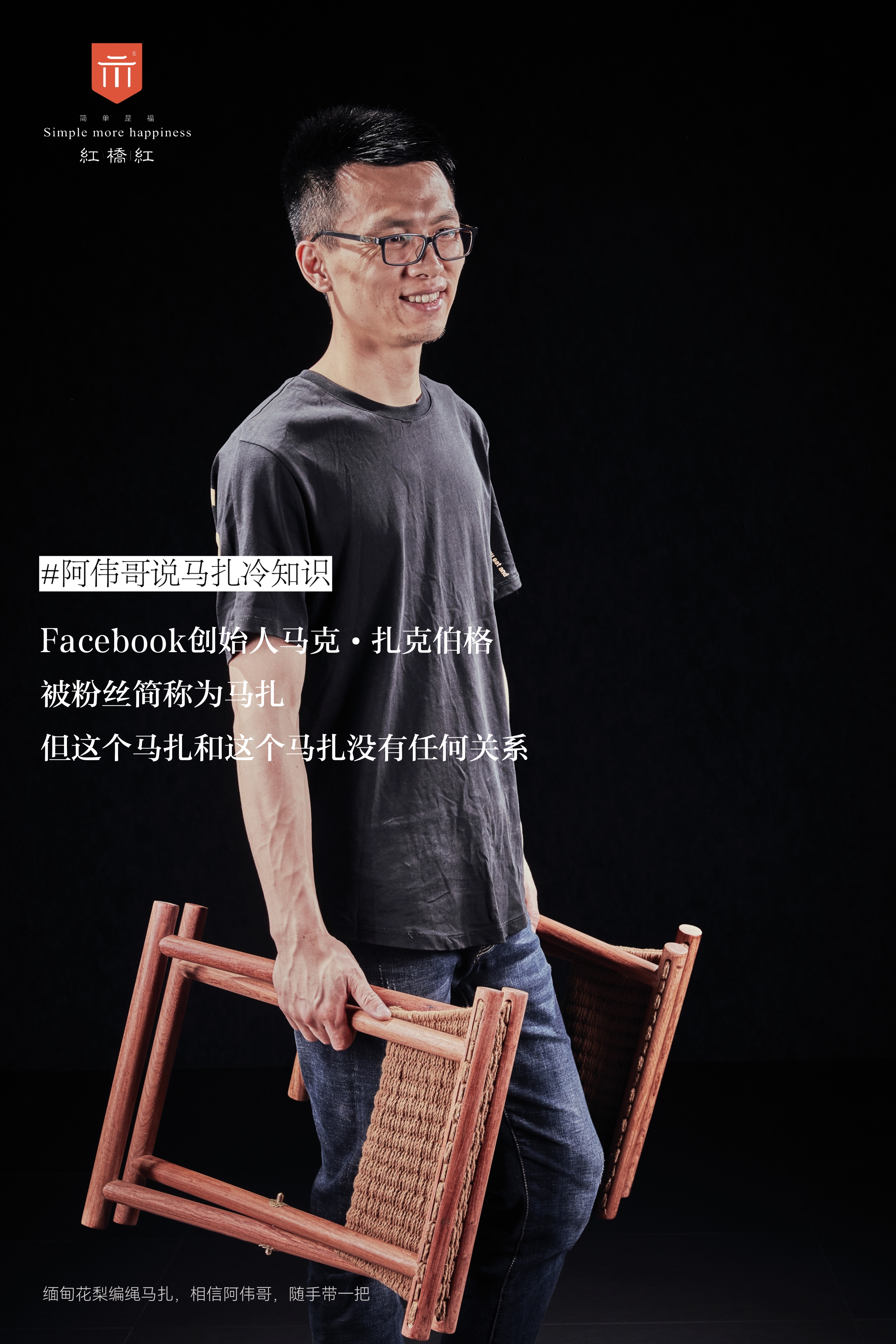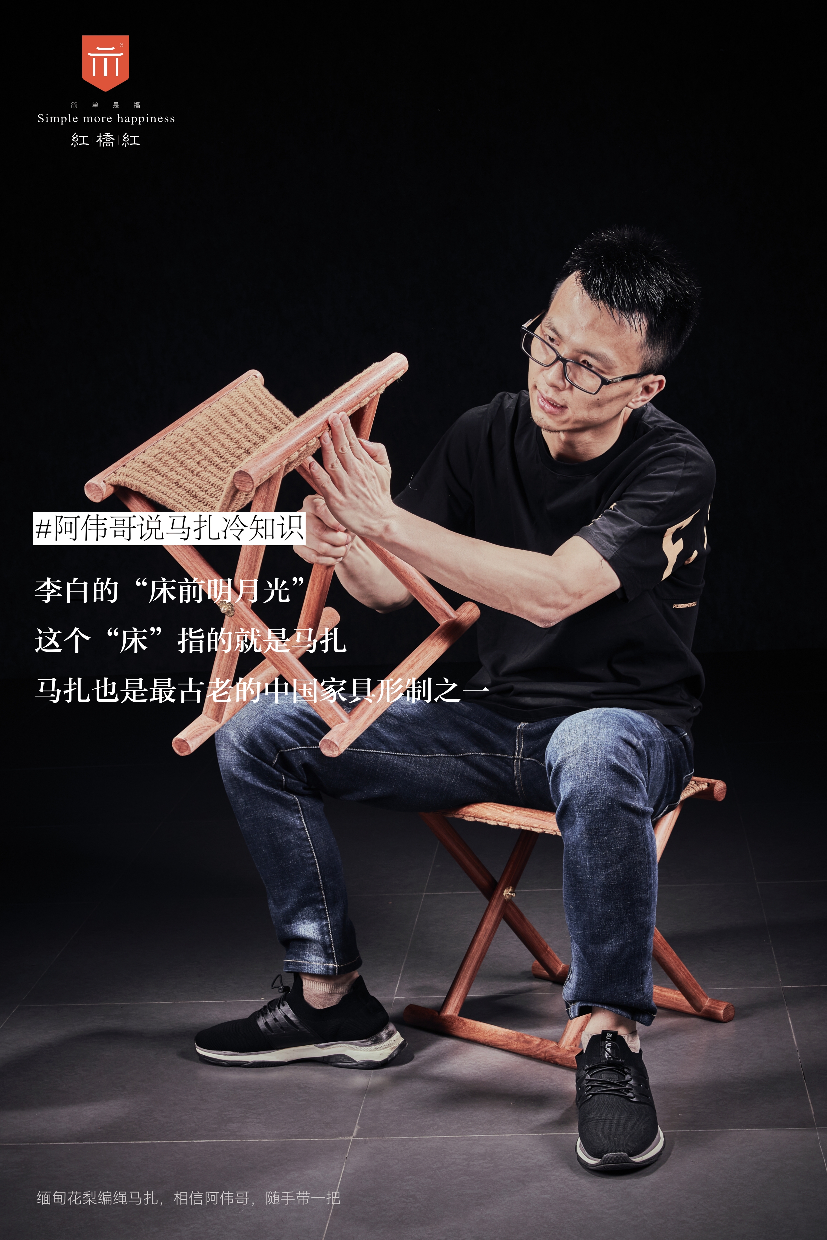 此款马扎为小型坐具,只用八根直材构成,杌面纯手工编绳,椅足呈交叉状,再辅以金属饰件,可以折叠、携带方便。