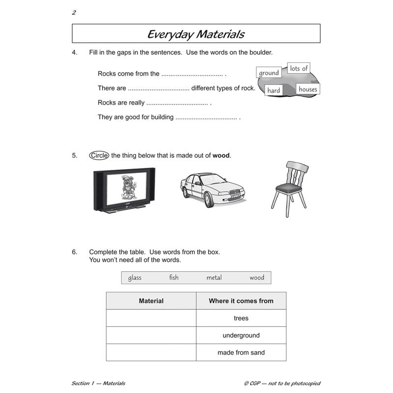 This CGP Workout book is packed with practice covering everything Year 1 pupils (ages 5-6) need to know about Everyday Materials - all clearly laid out with plenty of space for writing answers. There's a range of questions for each topic, with a mixed section at the end of the book that tests children on everything they've learned. Practical mini-projects are also included to help them develop their scientific investigation skills. Answers to every question are included on the pull-out centre pages, along with a useful A3 poster that pupils can colour in.