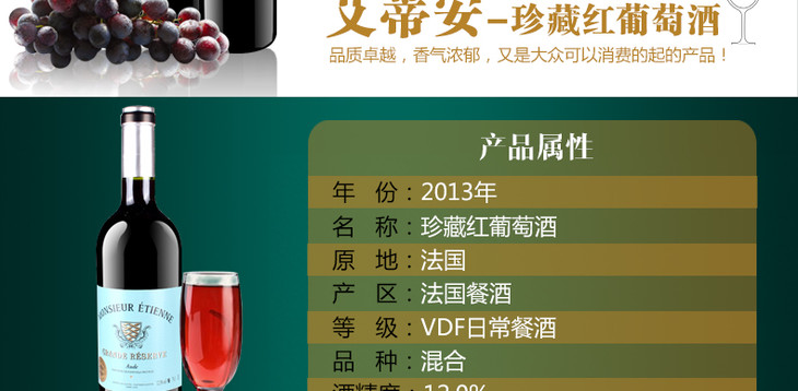 法国艾蒂安·珍藏葡萄酒750ml×6 整箱装