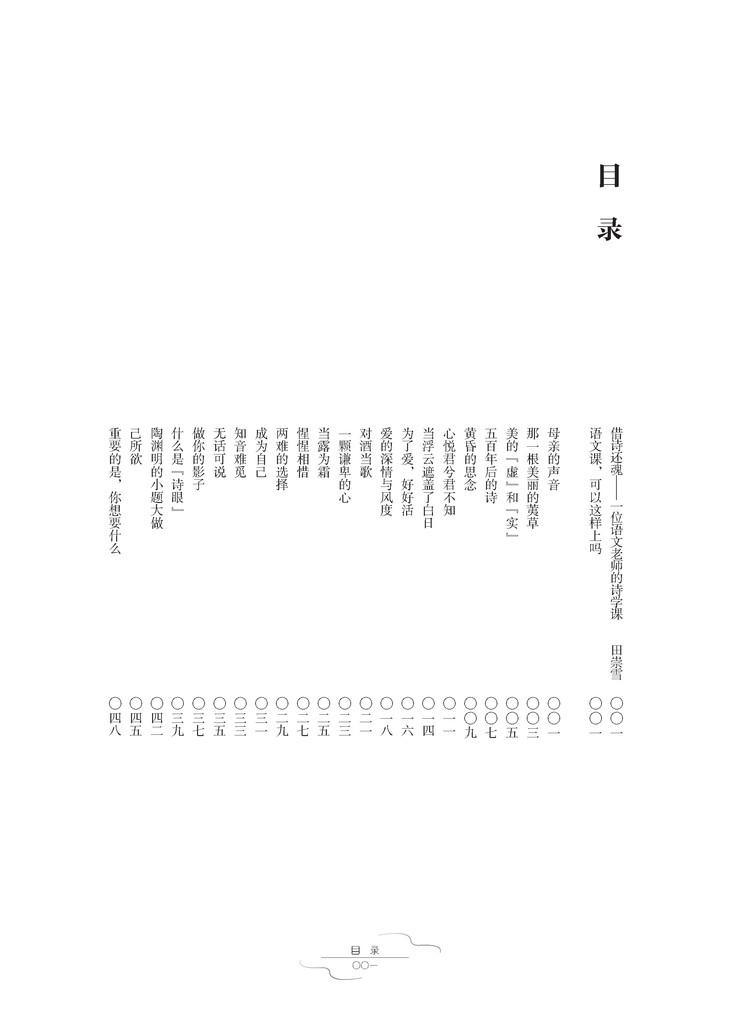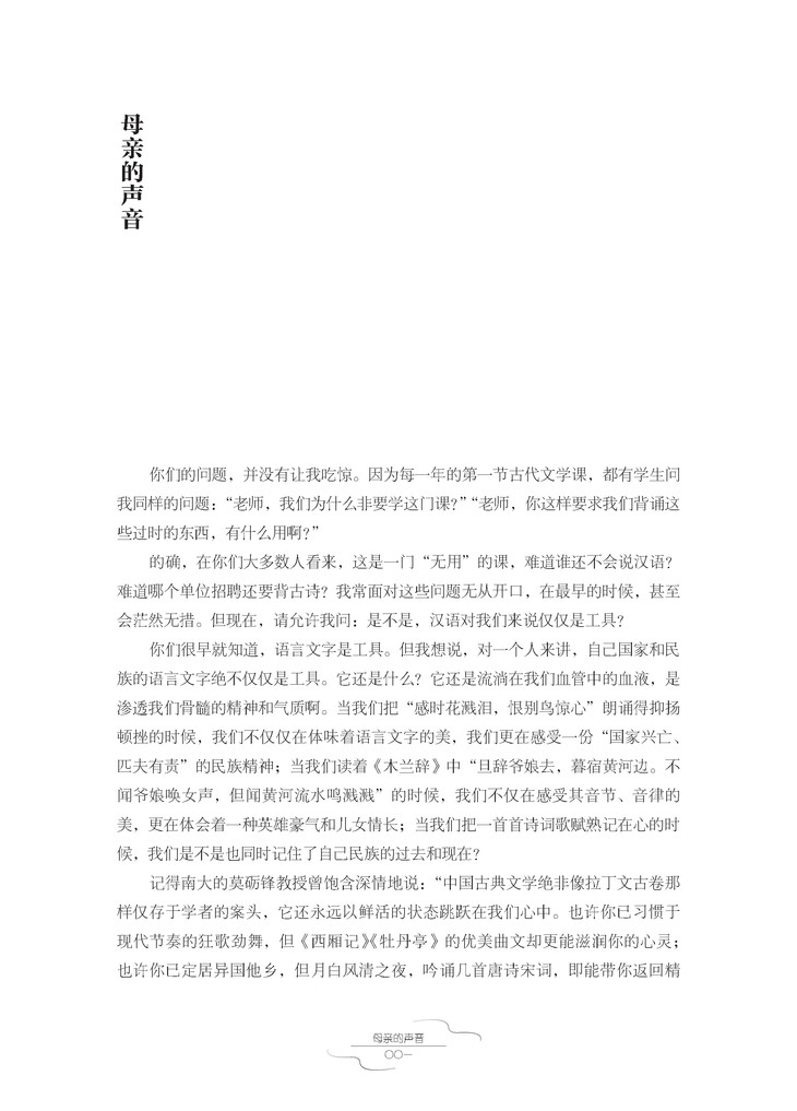 有那么一群学生,他们是如此幸运,遇到了一位美丽的老师。她诵读着“母亲的声音”,引领他们走进古典文学的世界。在那里,他们邂逅了“在水一方”的伊人、“无言独上高楼”的亡国之君、自称“楚狂人”的李白,还有那个“一日上树能千回”的“好玩”的杜甫……这位老师,也是幸福的,她遇到了一群有着灵心善感的学生,他们不经意的发问、豁然的顿悟、独辟蹊径的见解,让她惊讶且感动。她和他们用“母亲的声音”贯通了古今,于古典文学曲径通幽处,感悟千年前的草木幽香、市声人语。