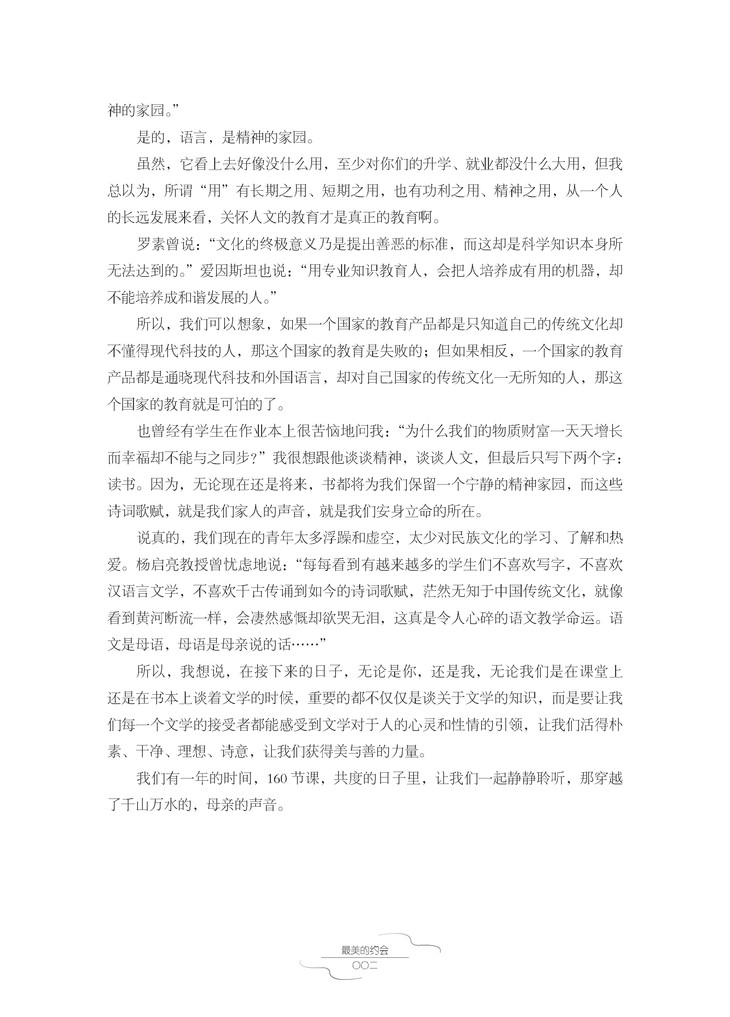 这本书是作者与学生在课堂里的一场“约会”,也是师生们与古典文学的“约会”,还会是读者与作者的“约会”。他们的课堂、对话真正体现了 “教育就是一棵树摇动另一棵树,一朵云推动另一朵云,一个灵魂召唤另一个灵魂”。这样的课堂,又有哪个学生会不喜欢?