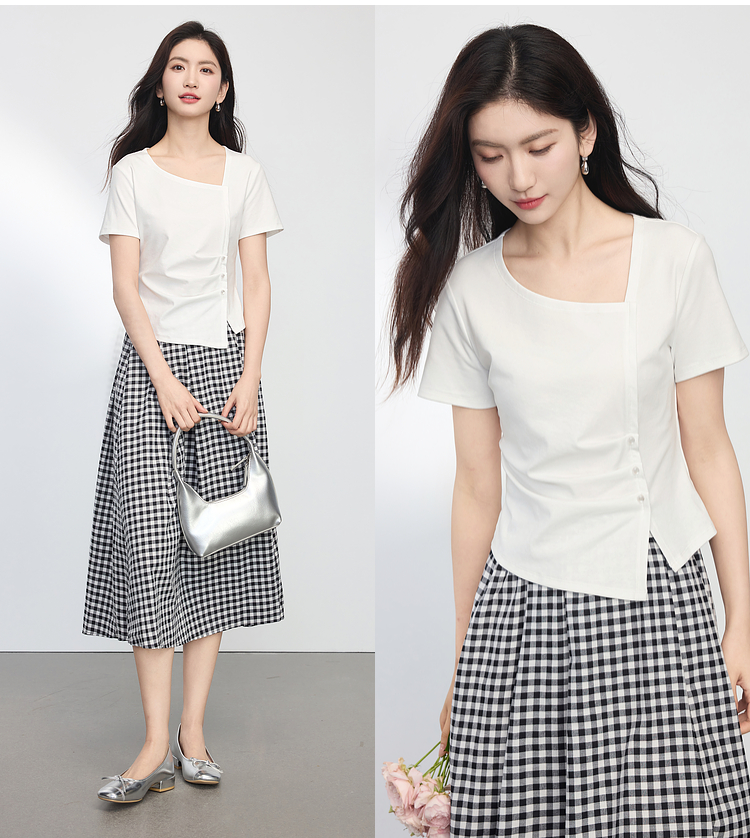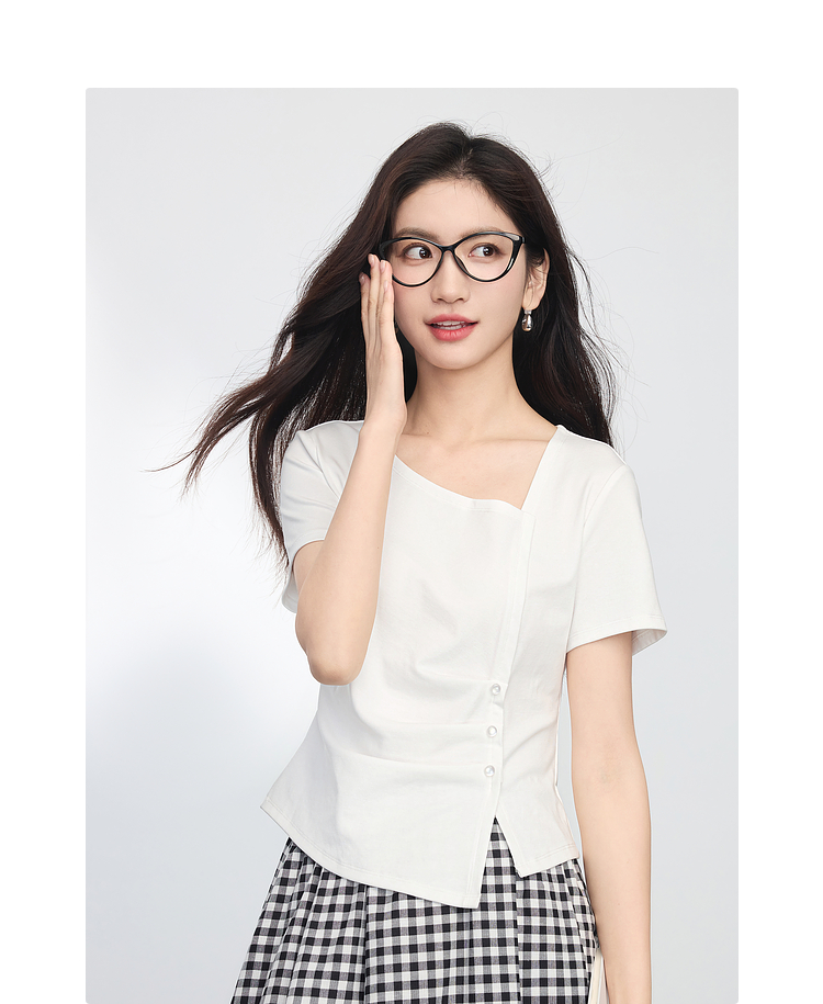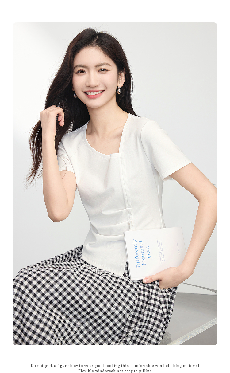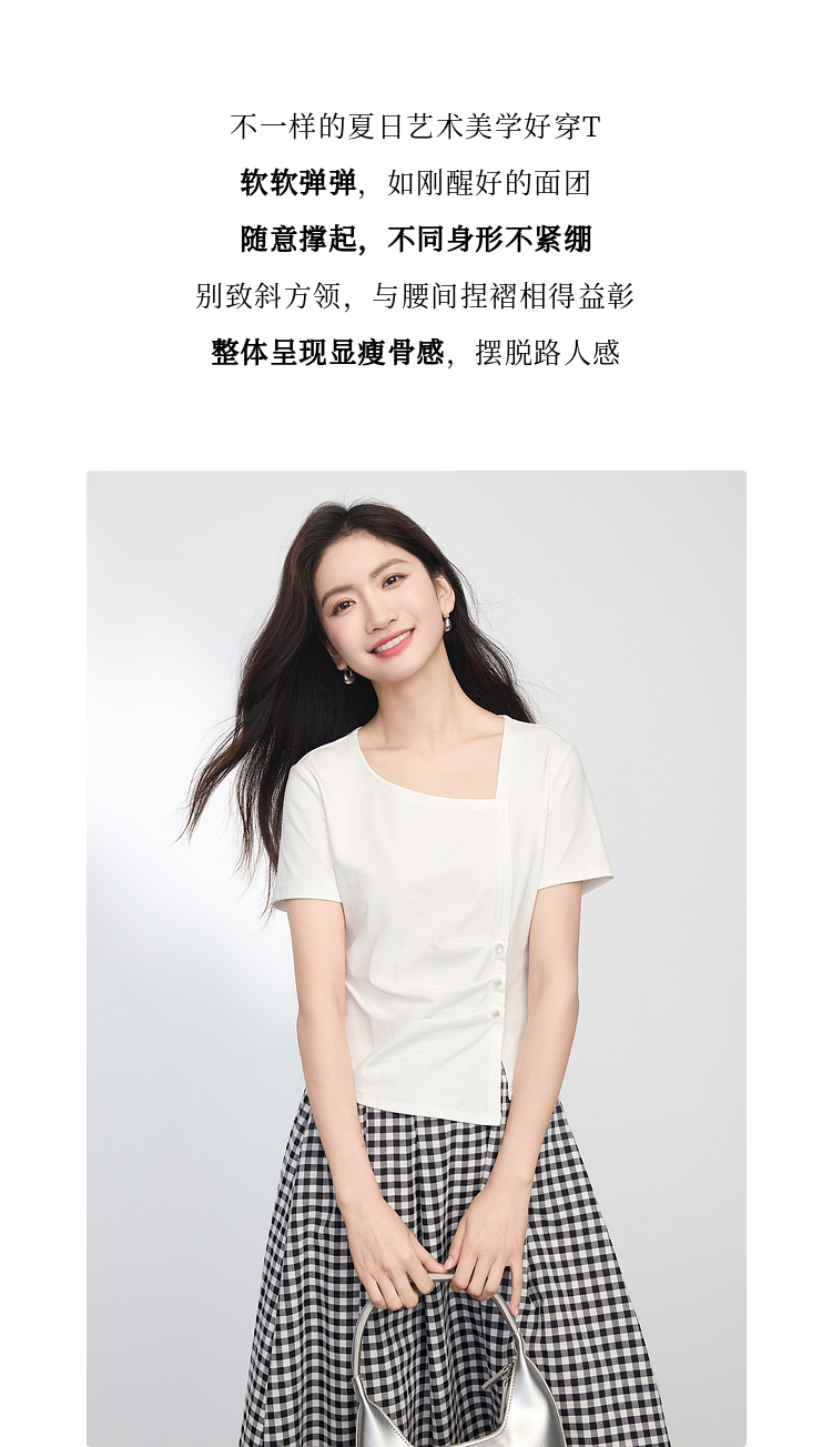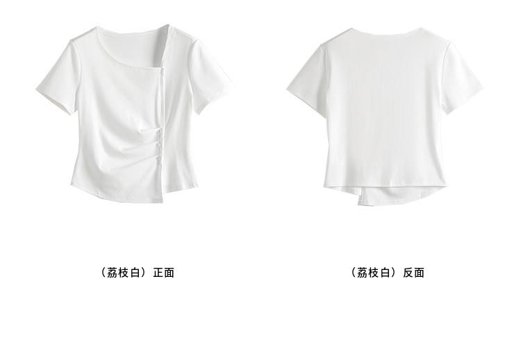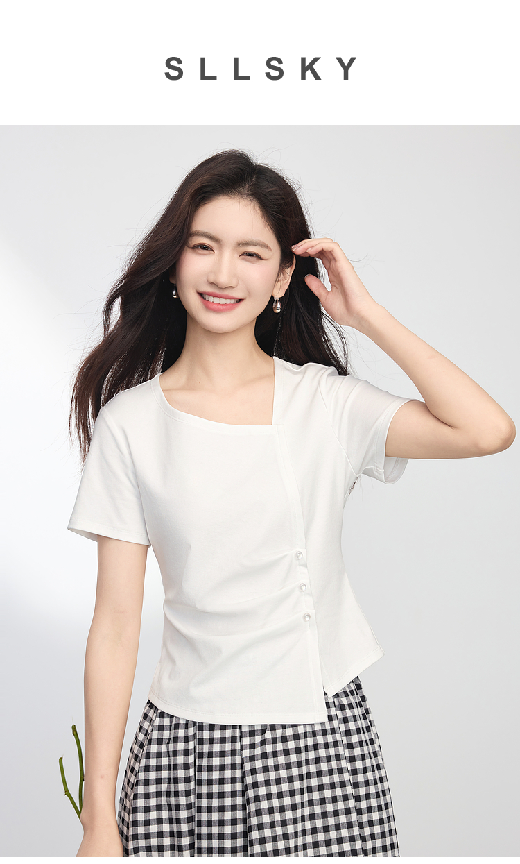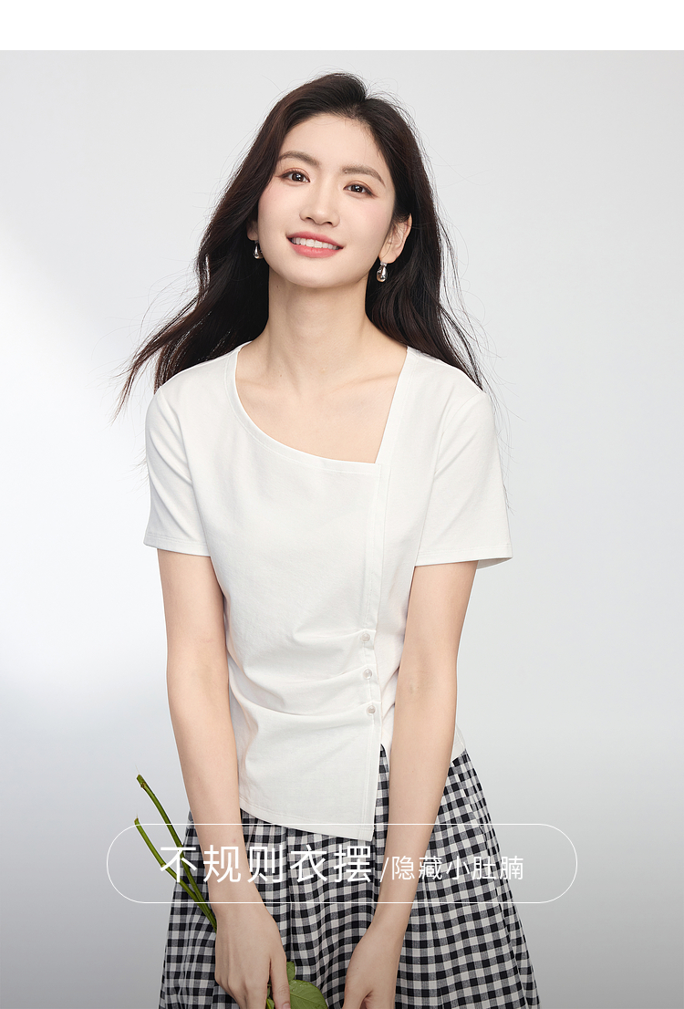 【专属特价】熙世界不规则方领白色t恤女夏2025新款修身显瘦褶皱短袖别致上衣