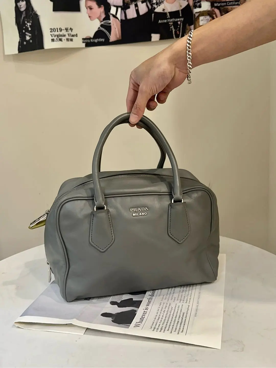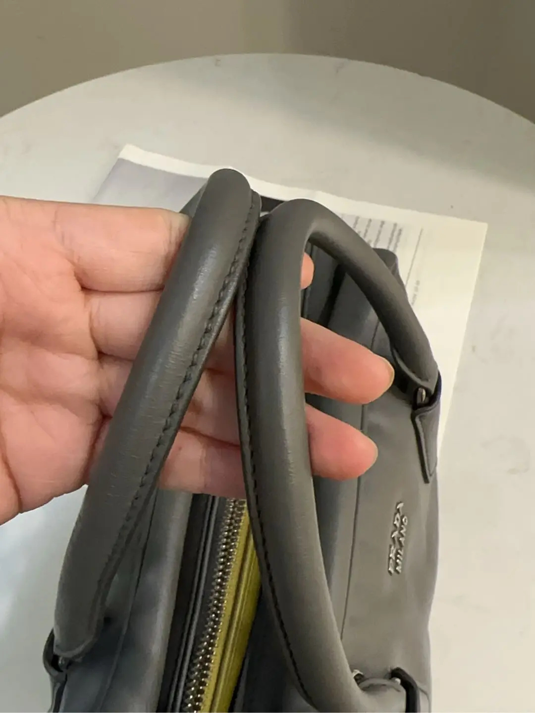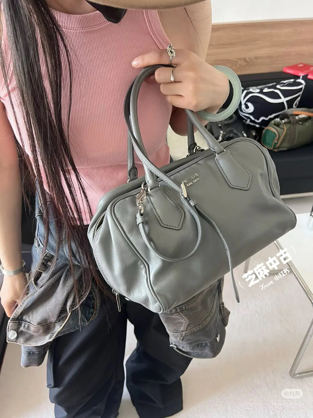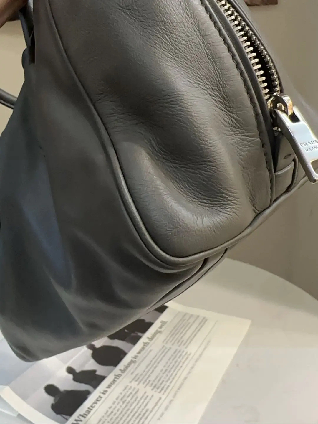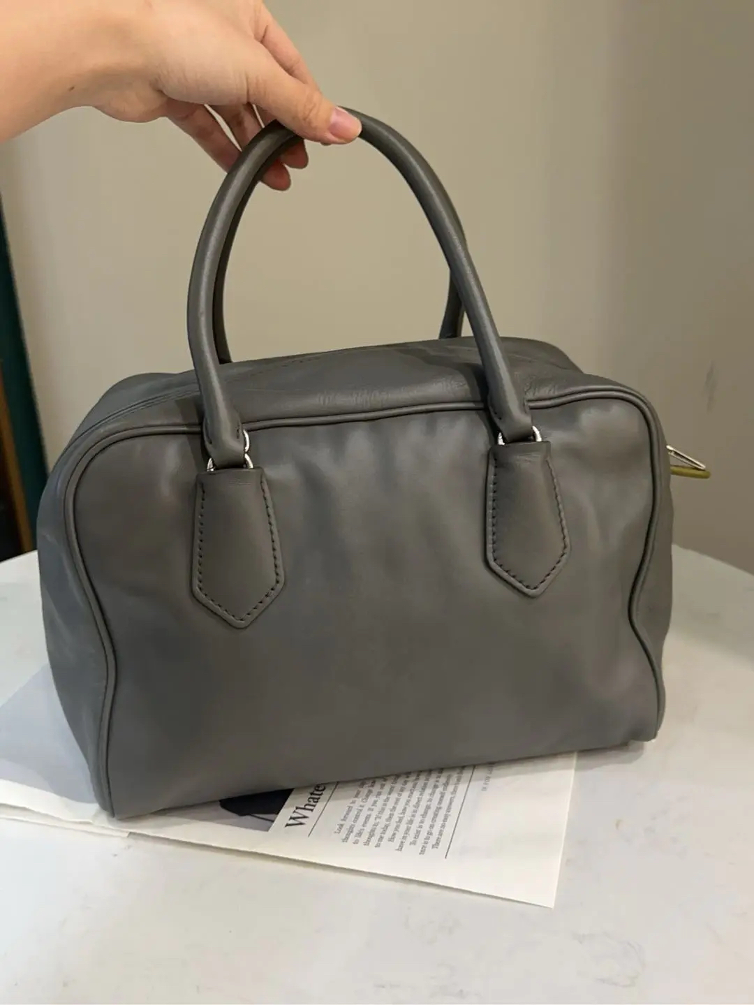 【商品详情】正品二手 Prada Inside 灰色 牛皮 中号 保龄球包 🛍️97新 26*18 。中性性冷风