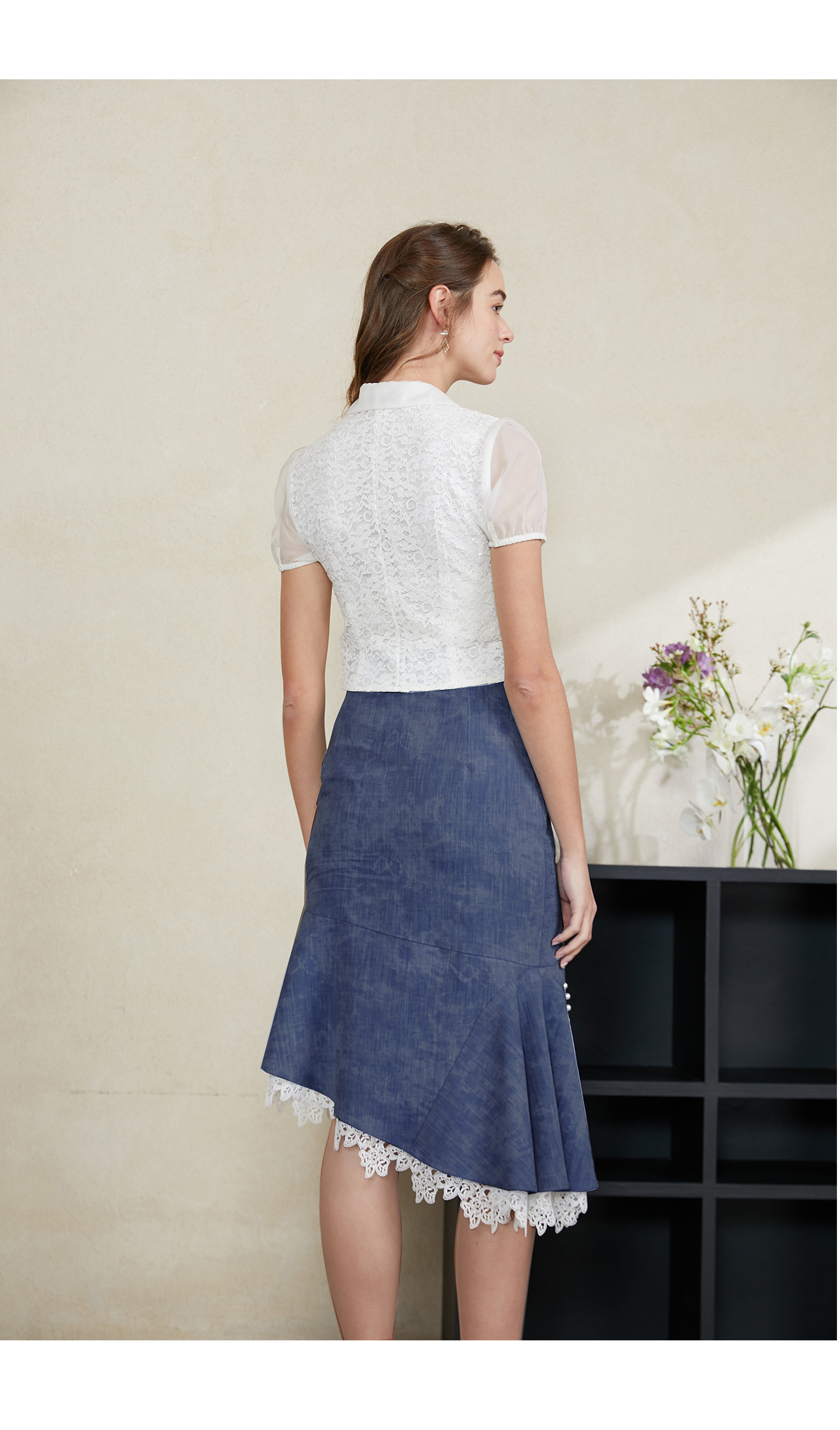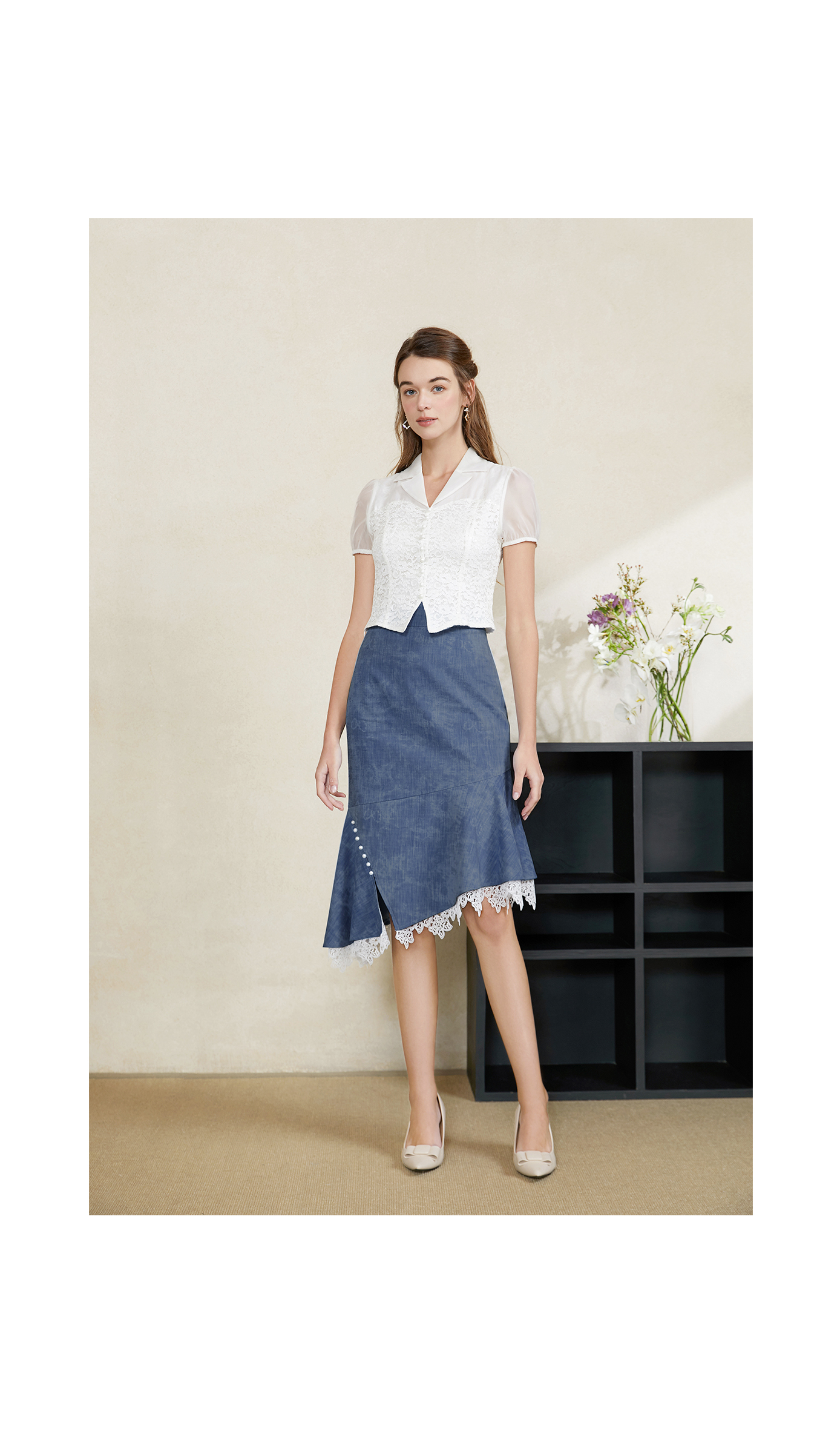 司歌蕾丝短袖v领收腰上衣T911012x