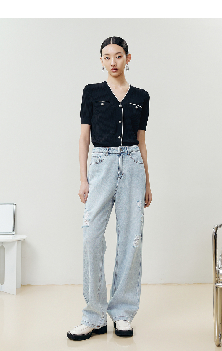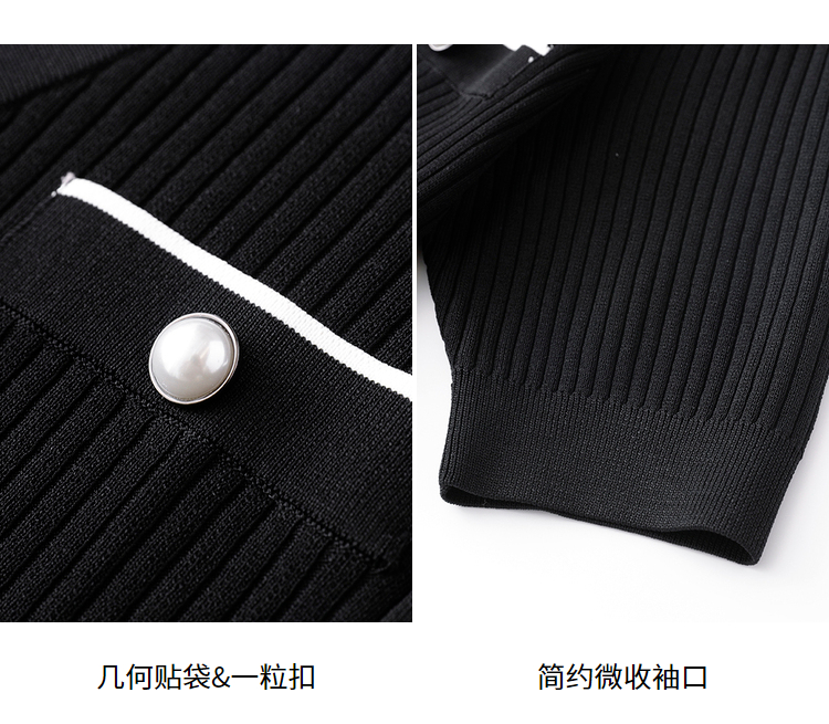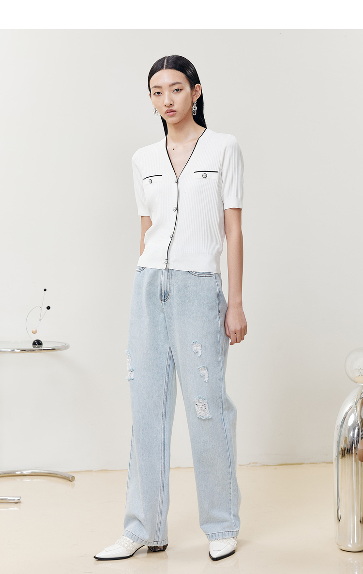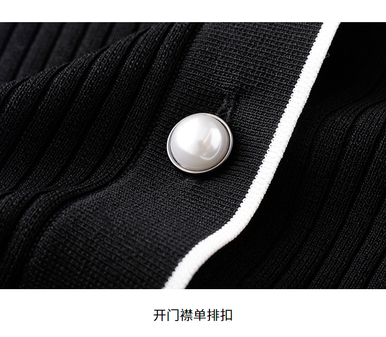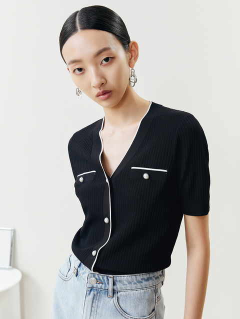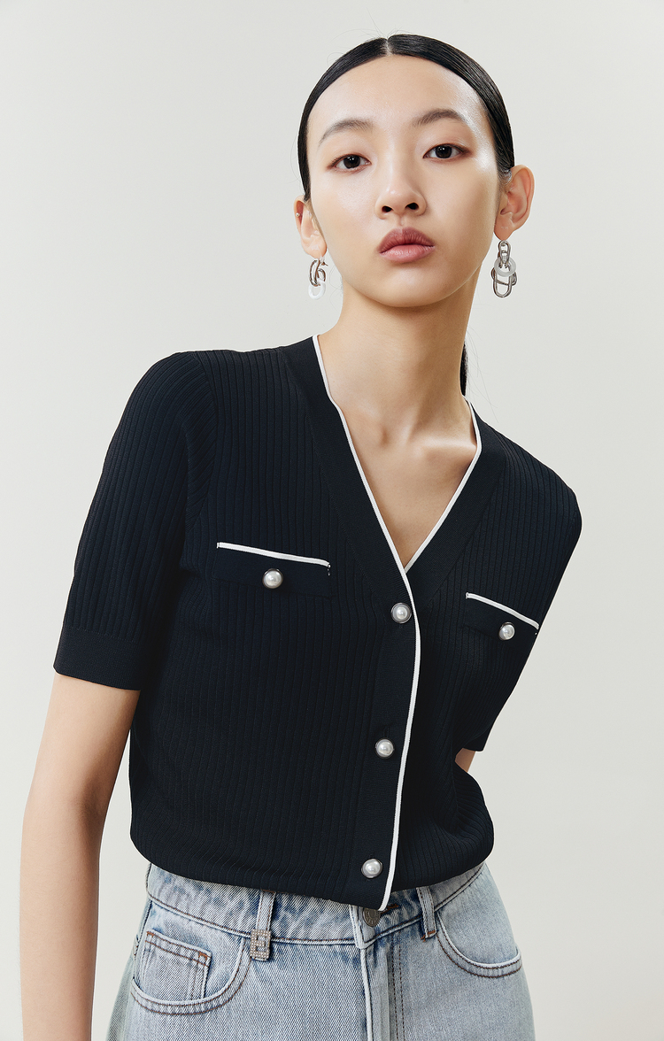 NEELLY纳俪商场同款气质V领针织衫女撞色黑边单排扣开衫上衣时尚N23022A01079