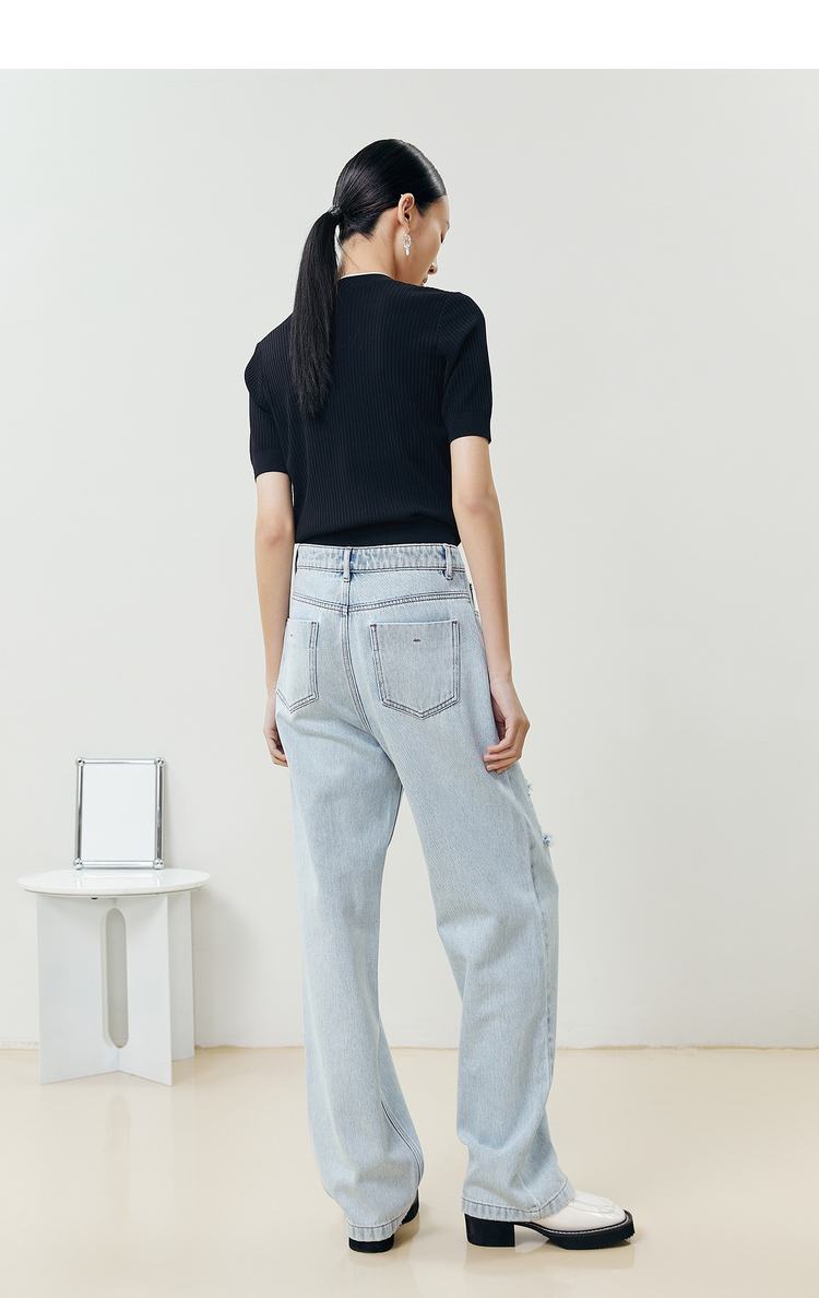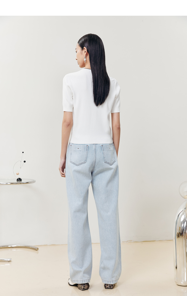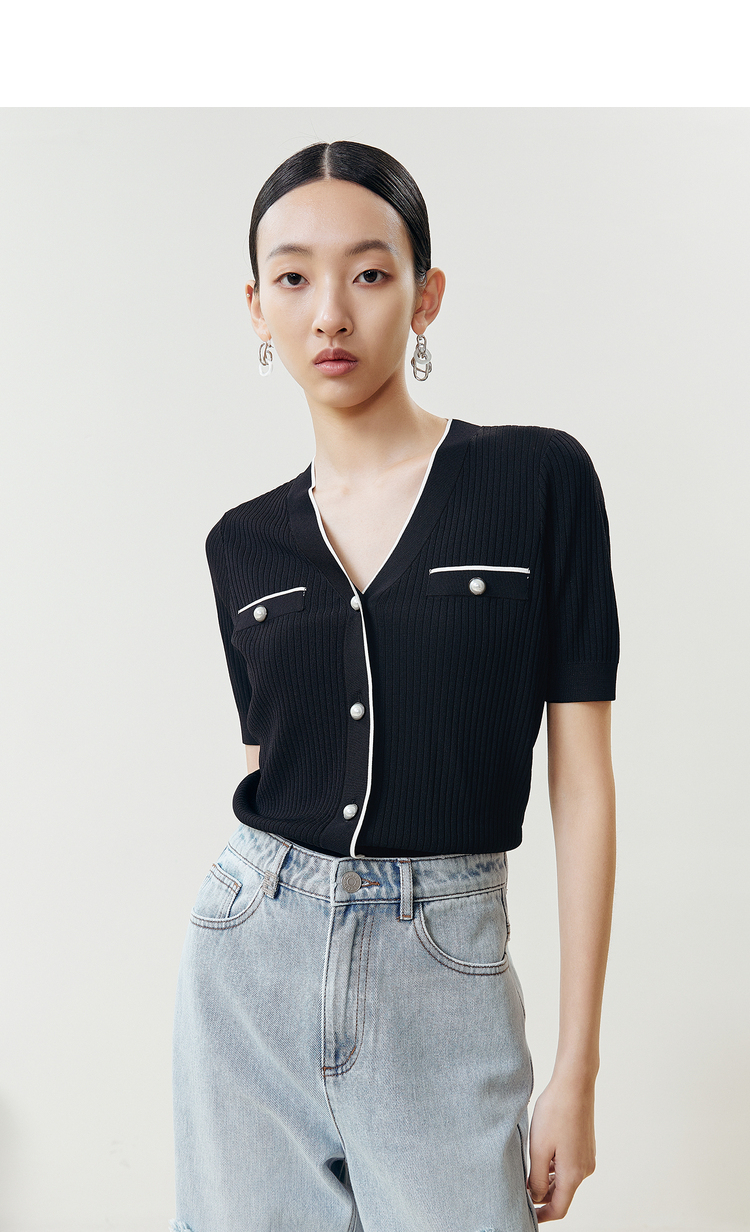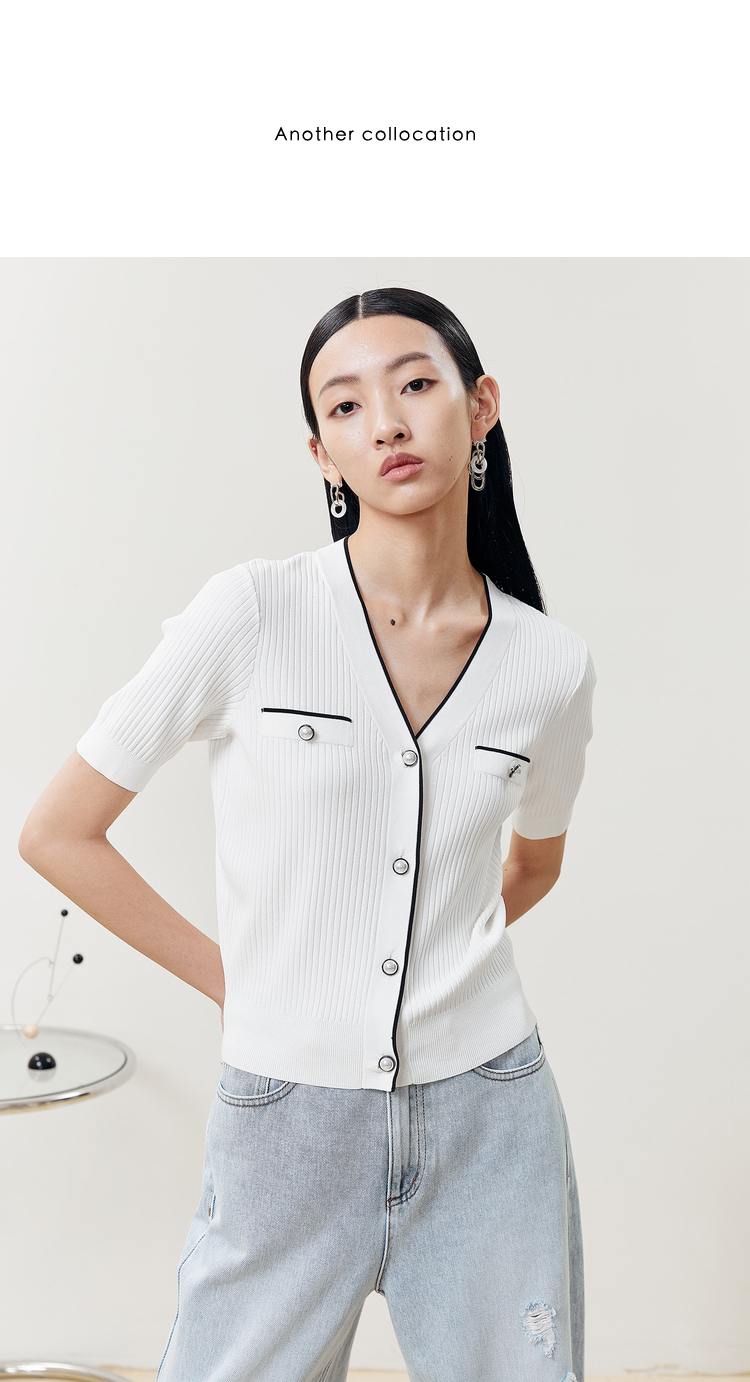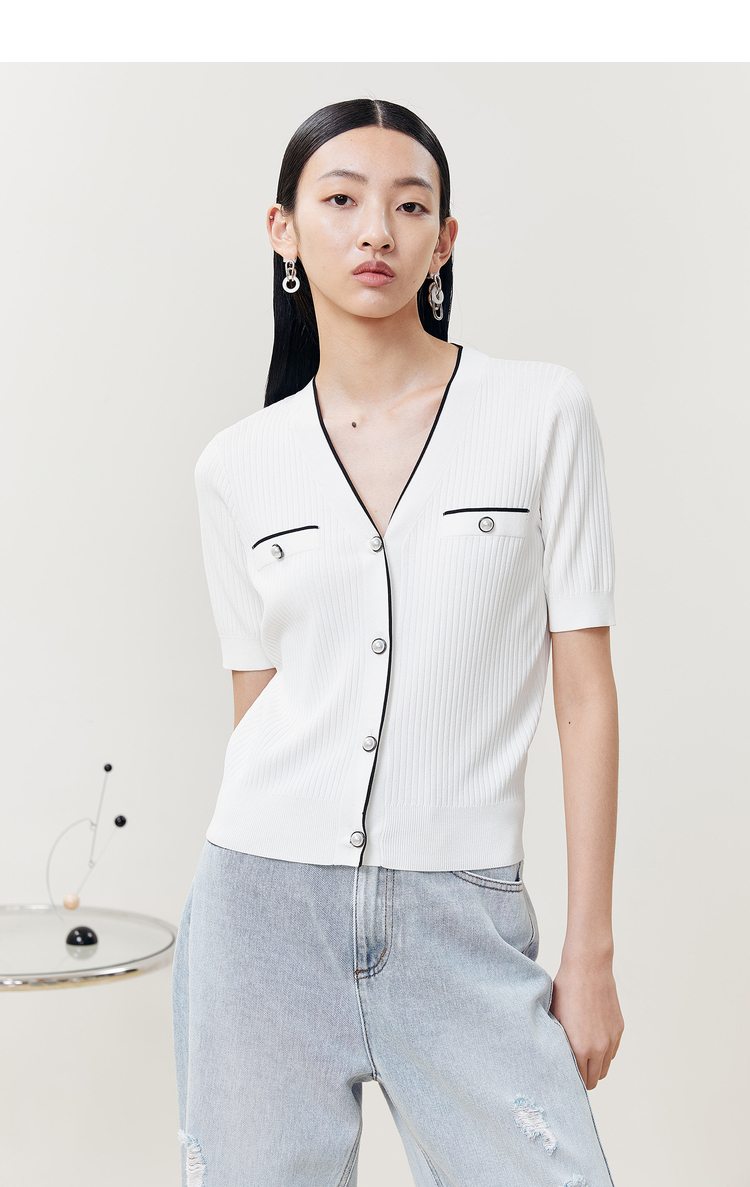 NEELLY纳俪商场同款撞色短袖小香风针织衫女气质V领修身上衣夏季N22041A01001