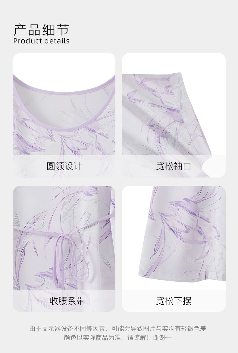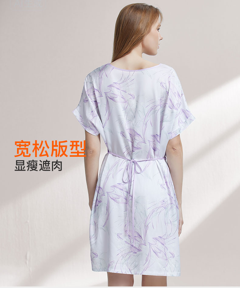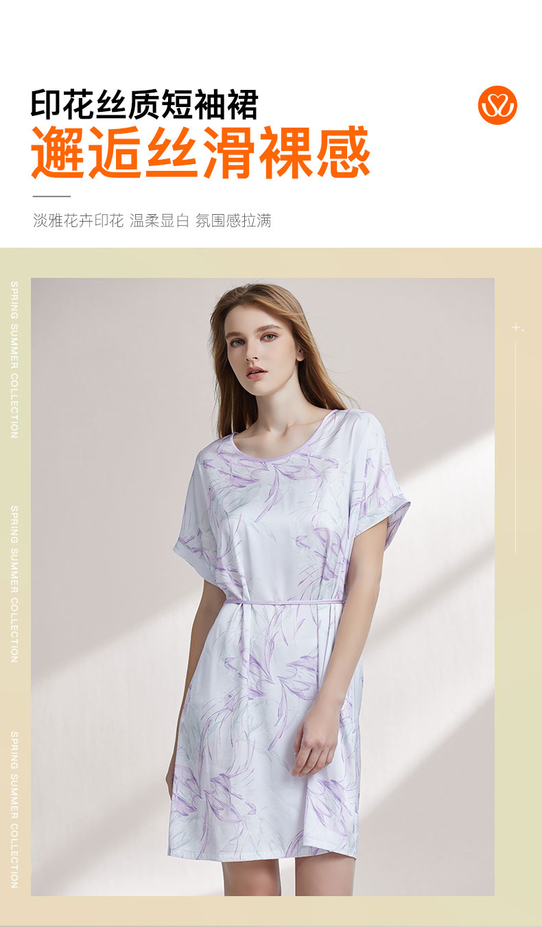 【59元超值新品】【秀黛】(小版)女印花丝质短袖裙仿丝温润爽滑贴身悬垂宽边袖口女士夏季短袖睡裙W2551093T【门店同款】