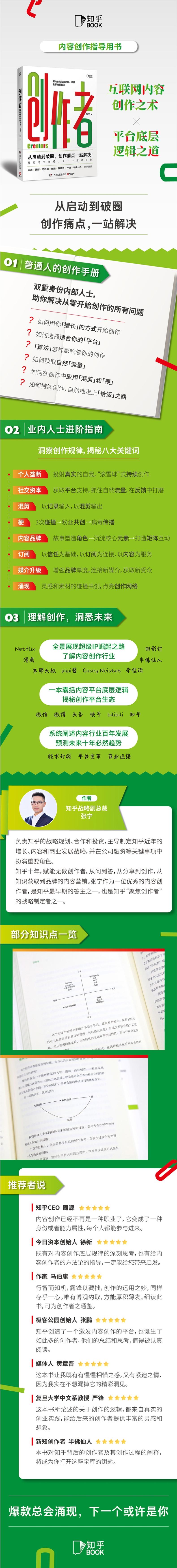 1.这是一本面向内容行业整体的指导用书,足以解决创作者从启动到跃迁所遇到的问题。 知乎是充满原创力的内容平台,张宁作为知乎“聚焦创作者”策略的主导人之一,以宏观视角,全面分析微信、微博、B站、知乎、抖音、快手、YouTube、Instagram等国内外全平台创作者。带你深入了解很好创作者的启动、进阶和垄断,个体的碰撞、触达和成功,大众需求的变革、升级和跃迁。 2.中国9亿的网民拓扑上,涌现出1亿+新晋创作者,互联网红利持续跃迁,全民创作时代到来—— 大众的注意力不再囿于“爆款”,也厌倦了标题党和同质化,“有用又有趣”成为全民刚需。个体的发光能力在这个时代被靠前地放大,你的某个特质刚好打动了某一批人的心,于是,“你”成为了他们的解答。 3.知乎CEO周源、今日资本创始人徐新作序推荐; 极客公园创始人张鹏、知名作家马伯庸、资深媒体人黄章晋、复旦大学中文系教授严锋、新知创作者半佛仙人联袂推荐。