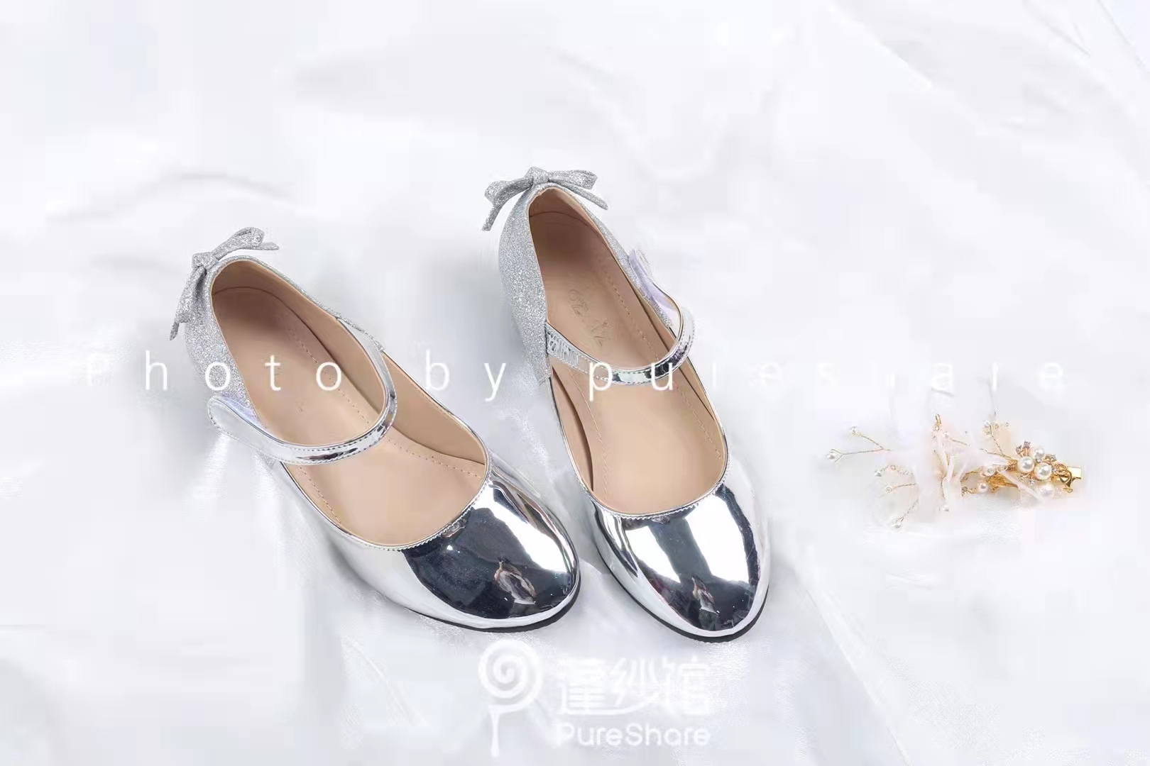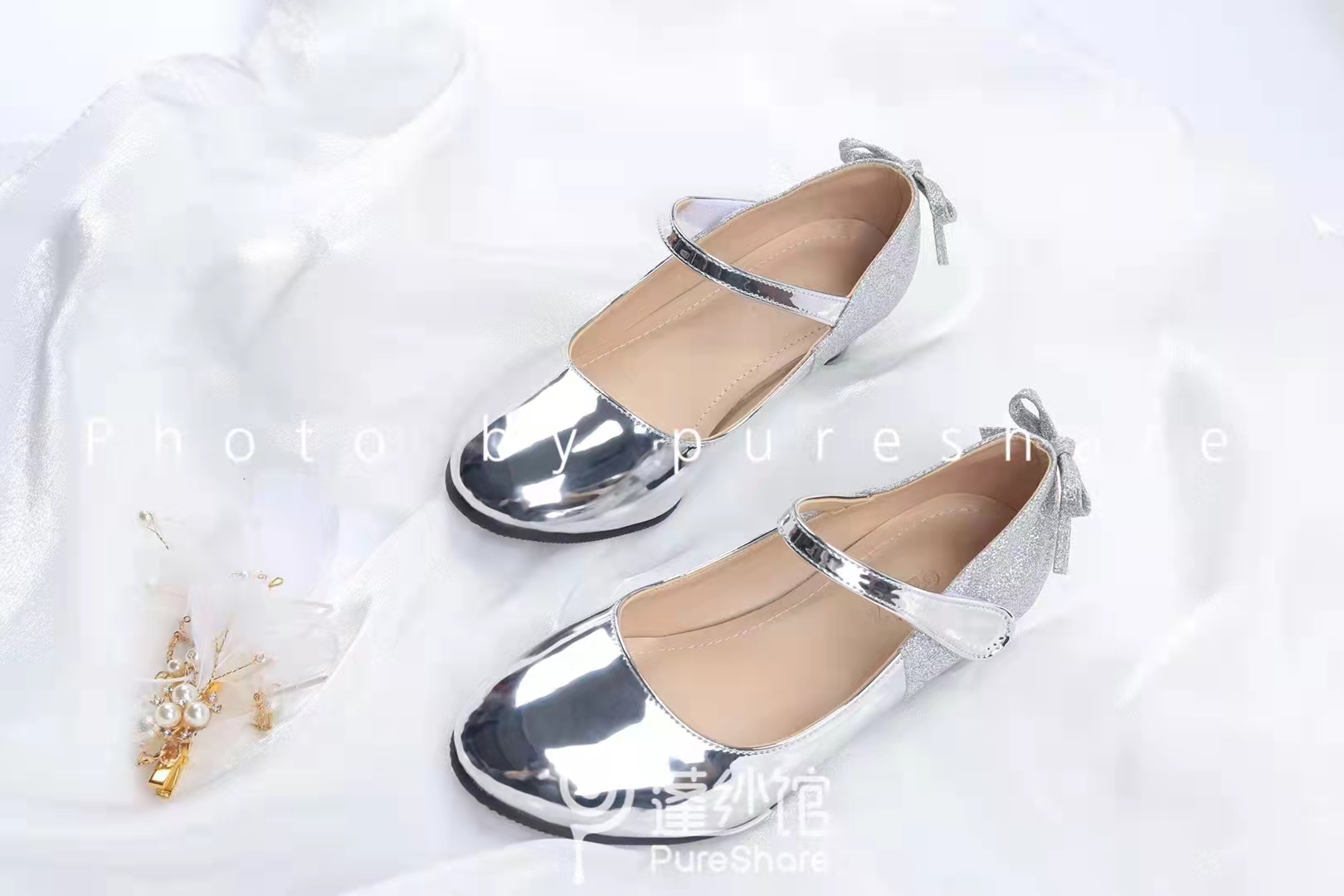 PureShare 亮面银色小高跟皮鞋