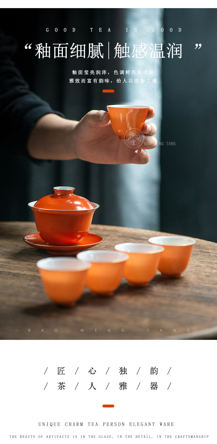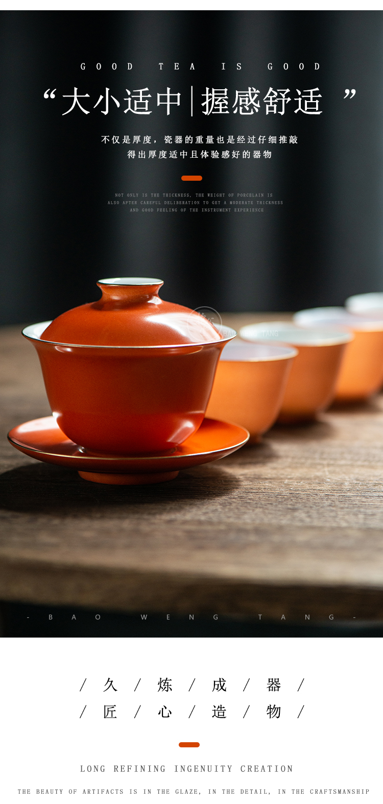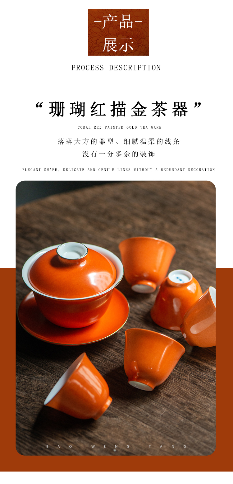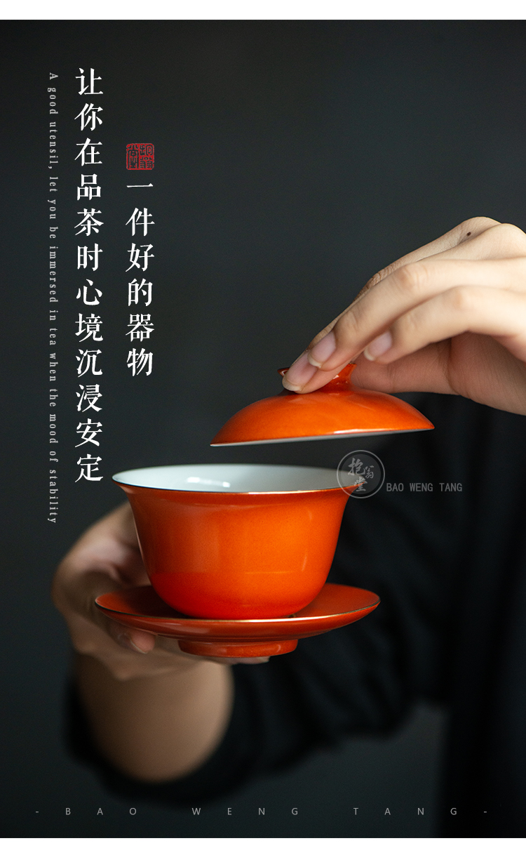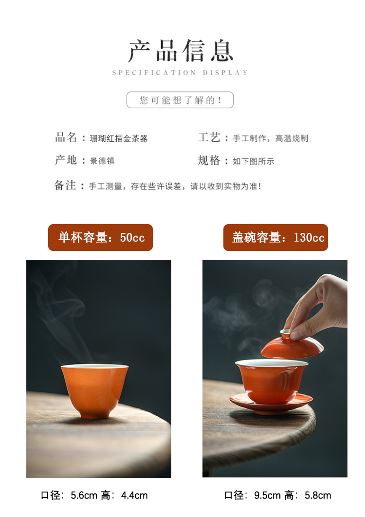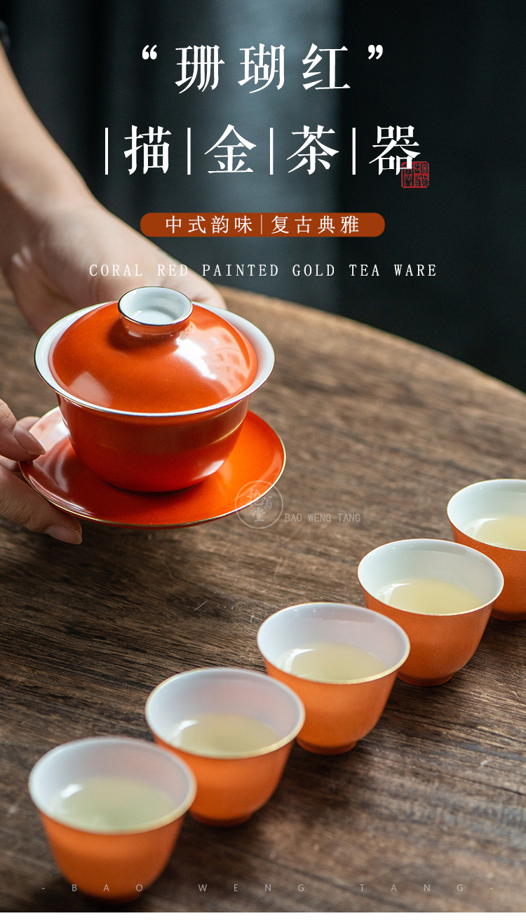 景德镇抱翁堂 珊瑚红描金盖碗手工茶器单个盖碗茶杯陶瓷泡茶器家用功夫茶碗