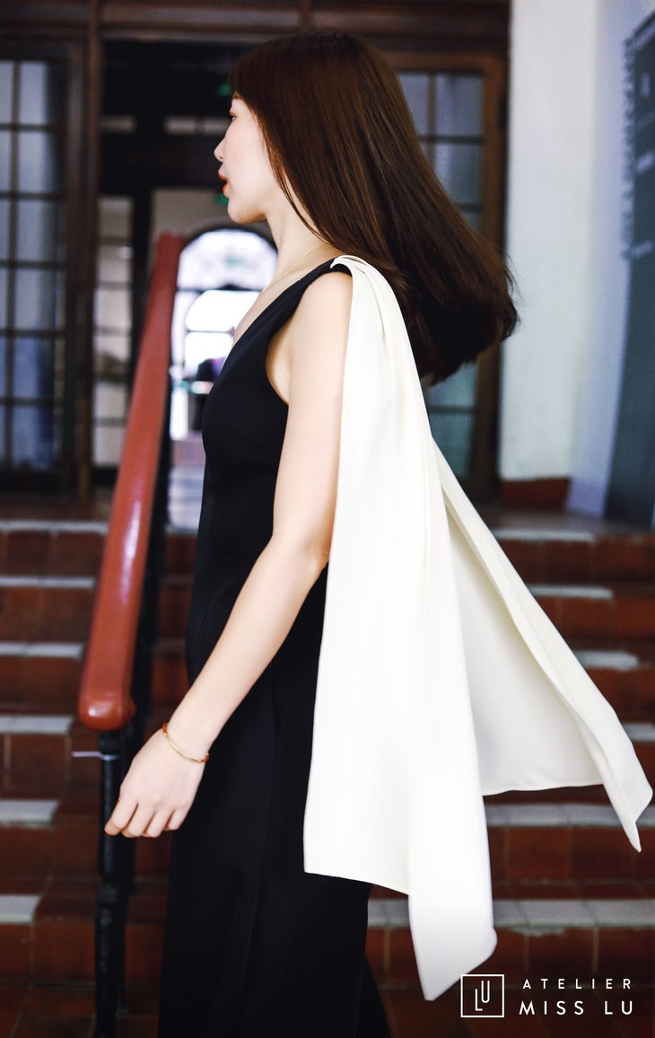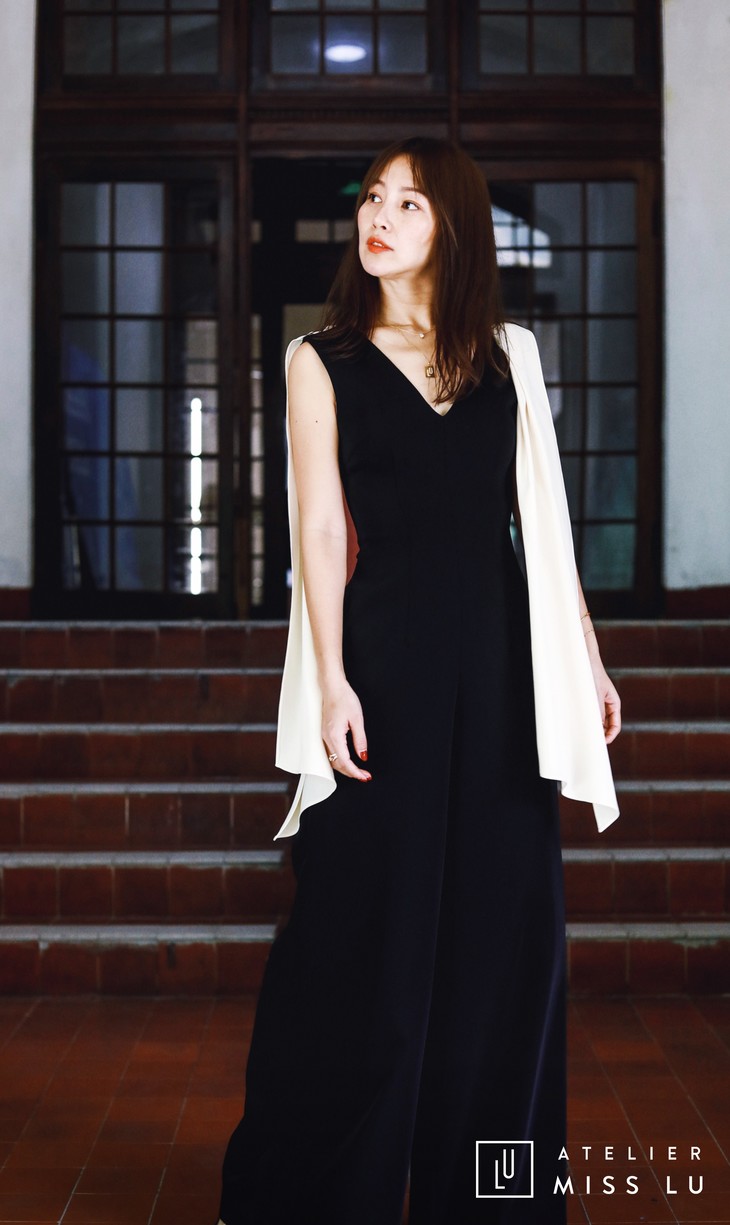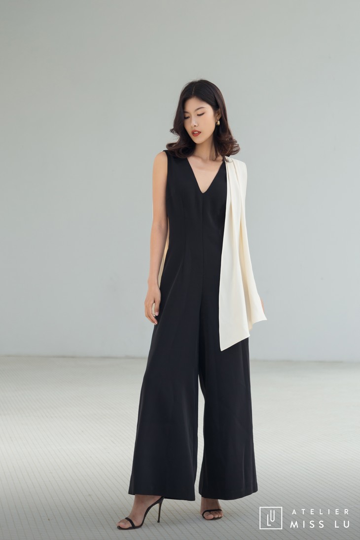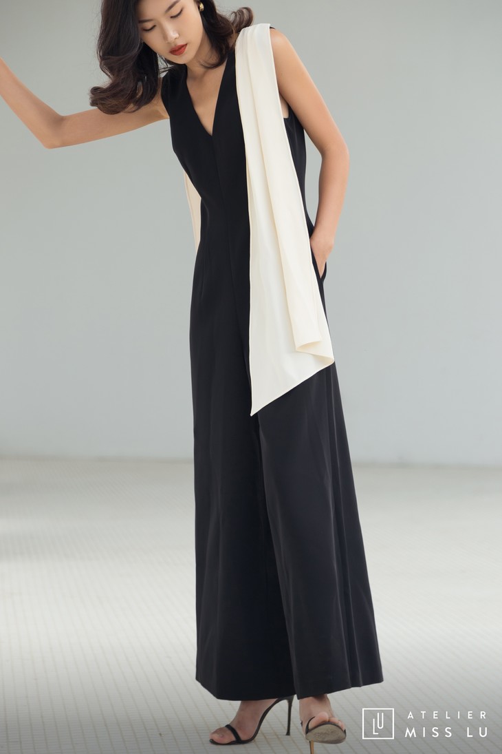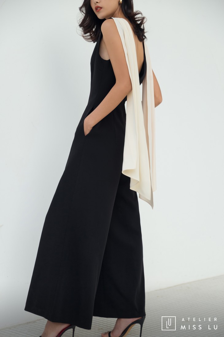 AtelierMissLu / Lena-黑白撞色飘带V领连体裤