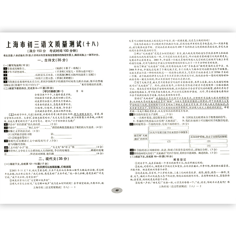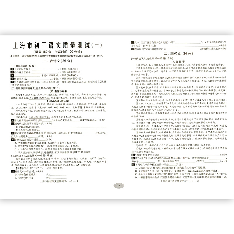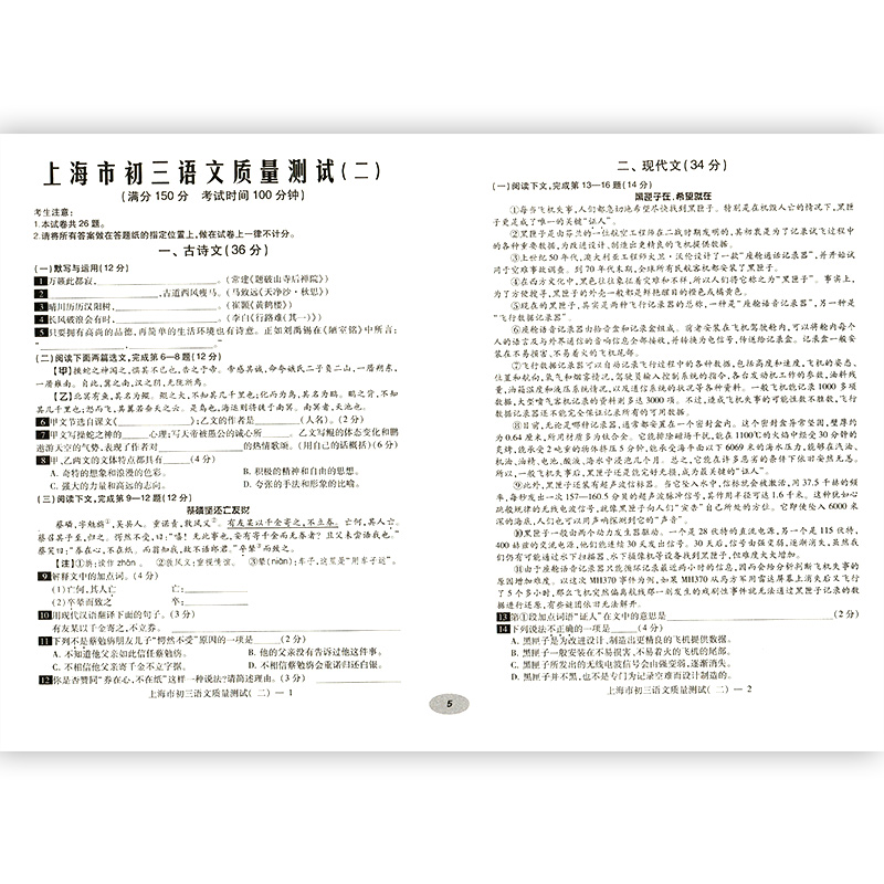 2022届新版 上海市初三语文质量测试 仅试卷 上海各区县摸底卷 光明日报出版社 中学教辅 2022上海中考语文一模卷