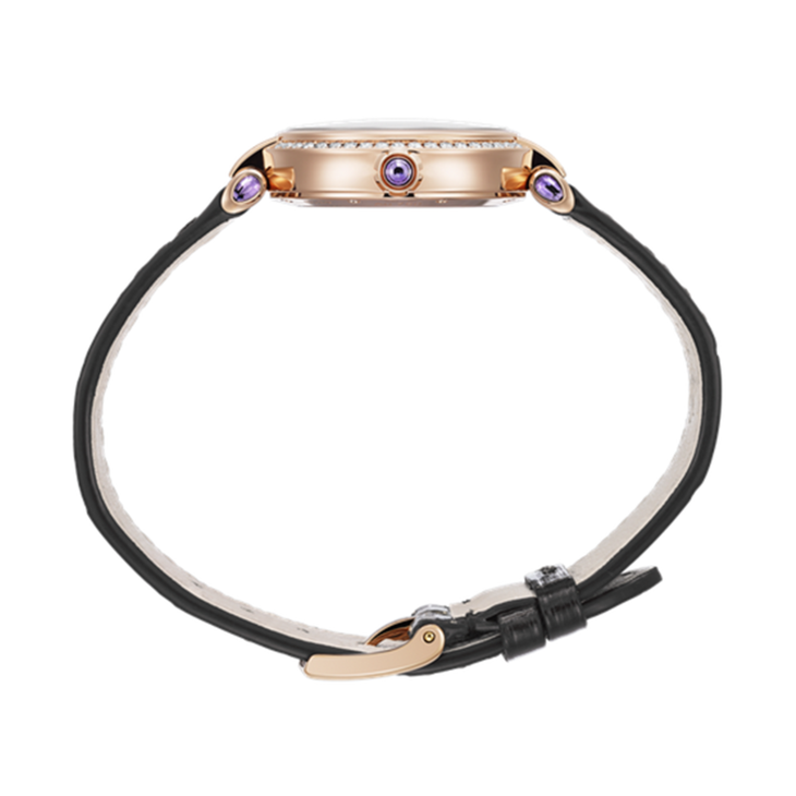 镜面材质 | 蓝宝石水晶玻璃 | 表盘 | 18K玫瑰金镶钻表壳 镶钻表圈 银色与珍珠母贝表盘 罗马数字及条形时标 背透,透明蓝宝石水晶 |