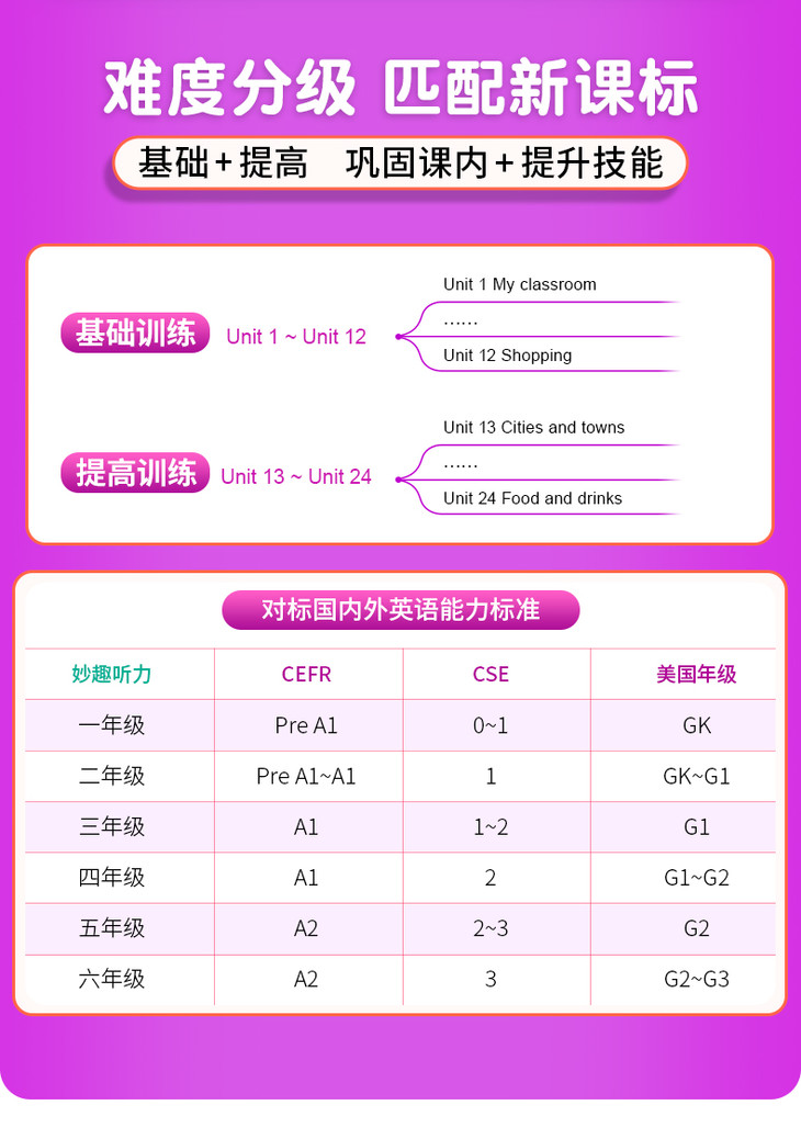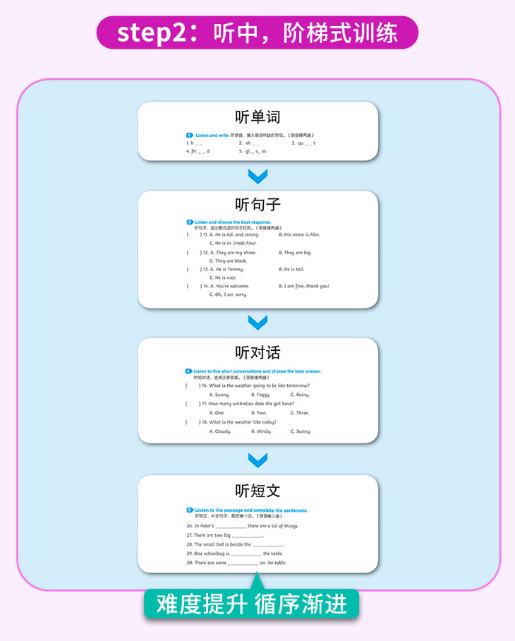 3.全书难度分级:基础+提高;各个单元题目难度设置逐步提升难度:听单词→听句子→听对话→听短文;让听力训练科学地循序渐进;