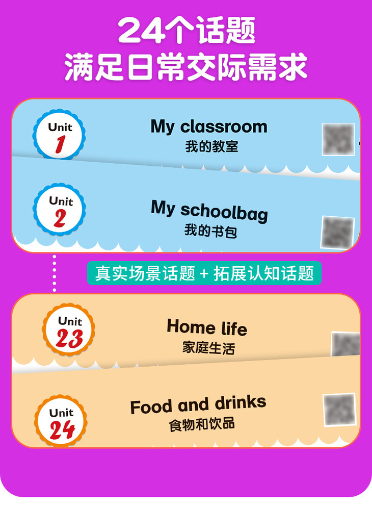 2. 24个单元日常话题,前12个单元与人教版同步,培养学生的基本人际语言技能;