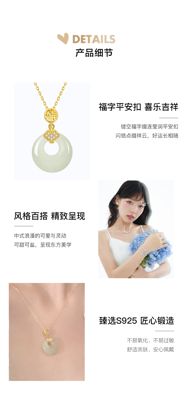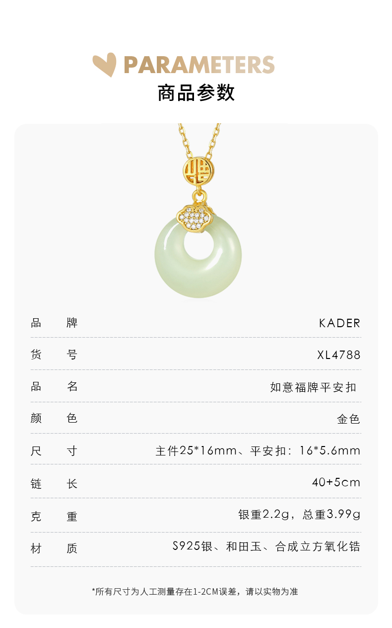 卡蒂罗/KADER 如意福牌平安扣 网红爆款吊坠 925银和田玉新中式国潮好运平安路路通可调节锁骨链 小众灵动祥云配饰 女友 母亲