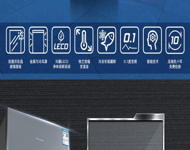 美菱(202374)BCD-271WUP3B三开门冰箱节能变频风冷无霜家用玻璃门一级能效智能冰箱新一级能效玻璃面板
