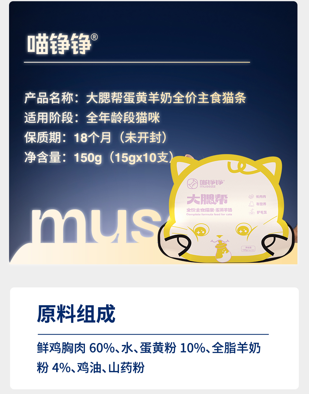 喵铮铮蛋黄羊奶大腮帮主食猫条 15g*10支 猫咪蛋黄羊奶营养健康食补猫条